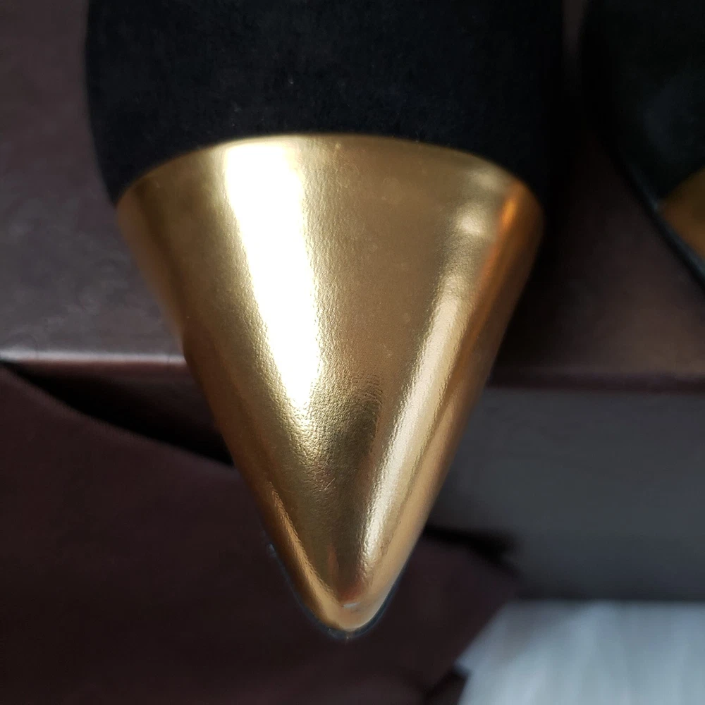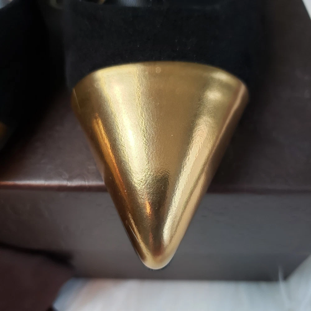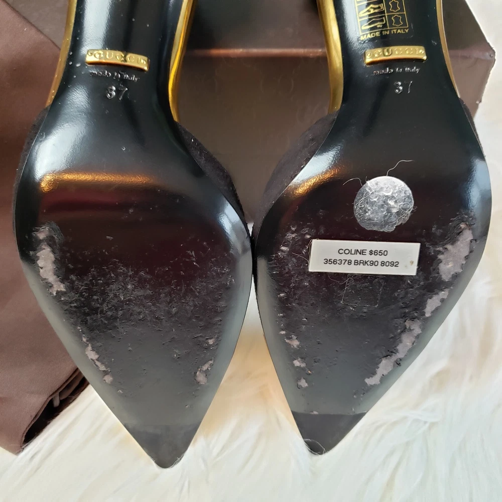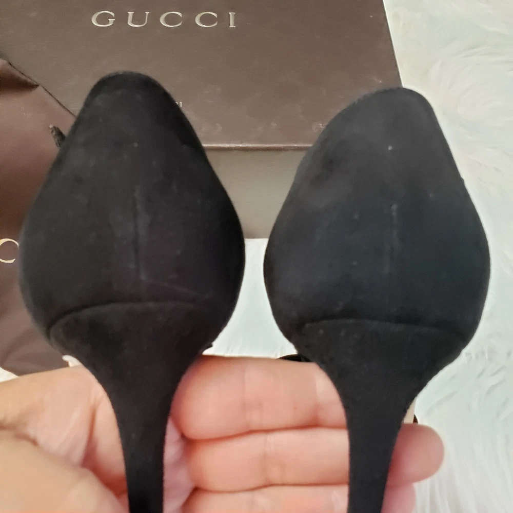 Gucci Womens Suede/Kidskin Strappy Gold Toe T-Strap Heels Black Size 37. 3" heel. Normal Wear, Great condition. Free Priority Mail Shipping Please email for additional photos/info