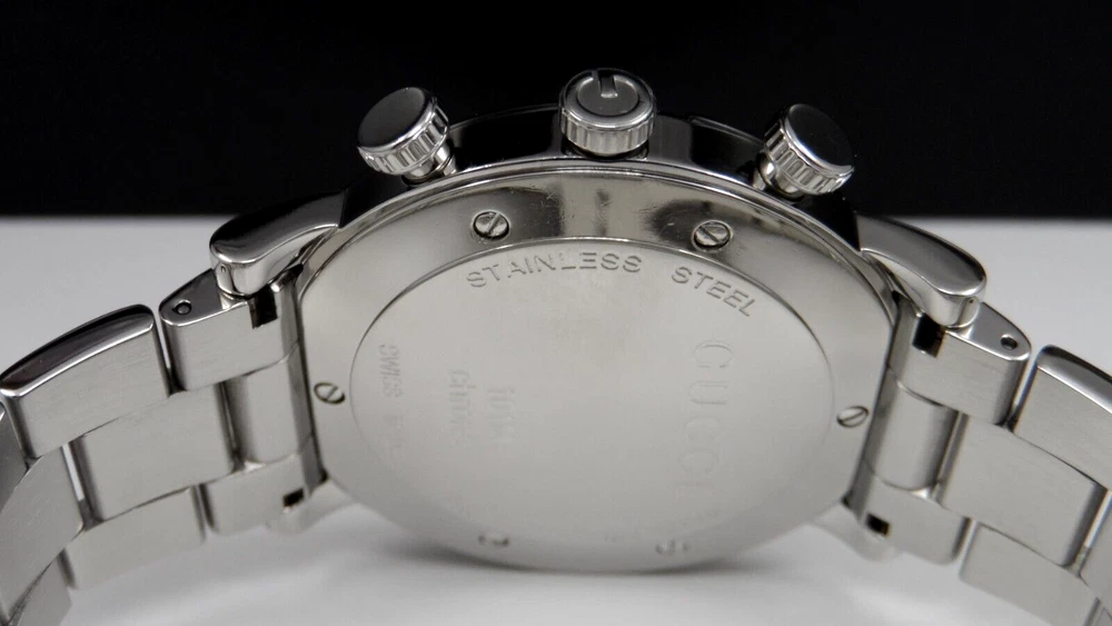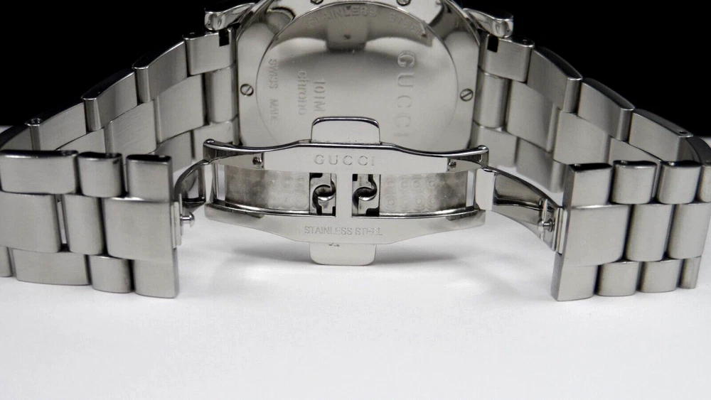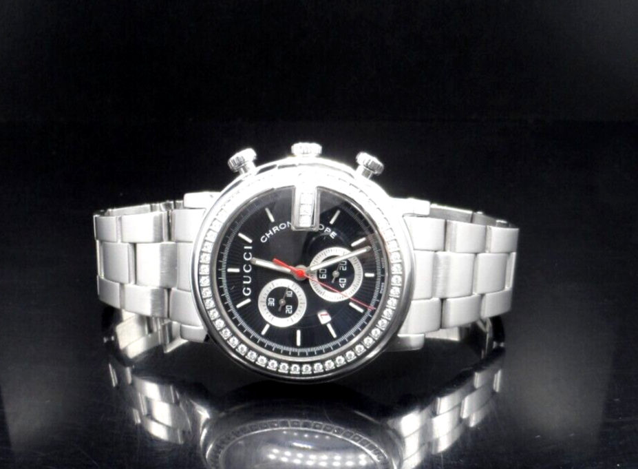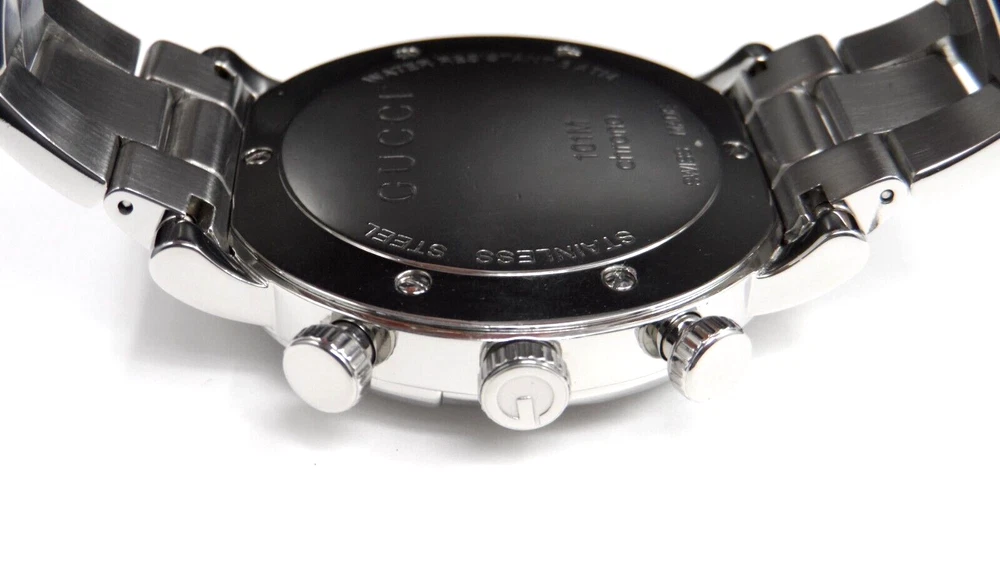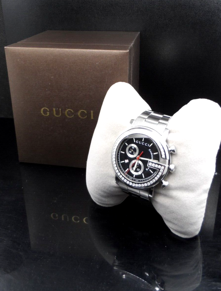 WELCOME! The watch has been professionally tested, cleaned the bracelet and case, removing all scratches and blemishes as best as possible. See pictures for details. WITHOUT TAG COMES IN GUCCI BOX WITH MANUFACTURER BOOKLET ** SEE PICTURES OF ACTUAL WATCH ** PICTURES ARE PART OF ITEM DESCRIPTION SERIAL# 14213886 G-516 WATCH INFORMATION: Stainless steel case with a stainless steel bracelet. Fixed G-shaped stainless steel bezel. Black dial with luminous silver-tone hands Minute markers around the outer rim. Dial Type: Analog. Luminescent hands. Chronograph Quartz movement. Pull / push crown. Solid case back. Round case shape. Case size: 44 mm. Fold over clasp with a push button release. WILL FIT WRIST SIZE 7 1/4" (APPROXIMATE) NO EXTRA LINKS Luxury watch style. PHOTOS MAY HAVE BEEN ENLARGED AND/OR ENHANCED All measurements are approximate and may vary slightly from the listed dimensions. WE DON’T RECOMMEND WEARING YOUR WATCH IN SHOWER/SAUNA OR OTHER SIMILAR ENVIRONMENTS DO NOT PUSH BUTTONS UNDER WATER!!! IF YOU ENCOUNTER WATER DAMAGE YOUR WATCH PLEASE CONTACT MANUFACTURE, WE ARE NOT RESPONSIBLE FOR WATER DAMAGED WATCH. Return Policy If you are not satisfied with your purchase, you may return eligible items for refund within 14 days from purchase date, buyer pays return shipping. All returns must be filed no longer than 10 days from purchase date; after that time, we are no longer responsible - no exceptions! Restocking Fee There will be a 20% Restocking Fee to cover fees incurred. Return Eligibility Items must be in same condition as you received, meaning unworn unused with tags (if applicable) intact. Conditions which will void your ability to return merchandise includes: Scratching, Breaking, Wearing items, was sized by any other jeweler or lastly, if the auction explicitly says in the description that the item cannot be returned and will be returned to the customer at the customer’s expense, and the refund will not be issued. Once the return is approved, a refund will be issued to the same method used in the purchase. All returns must be inspected and approved by us before the return is finalized. Contact us to get approval of the return. Please allow up to 5 days after we receives the item to process the return and issue credit REQUIRE IMMEDIATE PAYMENT. Sales tax might apply per ebay regulation SHIPPING USPS GROUND MAIL, DELIVERY CONFIRMATION INCLUDED. YOUR ITEM WILL BE SHIPPED SAME OR NEXT DAY AFTER PAYMENT IS CONFIRMED. We don't sell and ship internationally To International Customers Using Freight Forwarding Companies, Agents, or Entities: Contracting with a freight forwarding company, agent, or entity, releases Allbestwatches from any and all liability regarding your purchase from the date the purchase is received by the freight forwarding company, agent, or entity. You, the customer, assume responsibility for any and all cosmetic or mechanical defects and/or receiving the purchase from the freight forwarded. THE WATCH OUT OF USA CAN'T BE RETURN FOR ANY REASON. I ship to the confirmed address on file with Ebay and will not ship to a third party address Please make sure your address is correct on Ebay PRIOR to payment If necessary correct address before payment is made, corrections made after payment is submitted will NOT reflect on your purchase THE WATCH OUT OF USA CAN'T BE RETURN FOR ANY REASON.