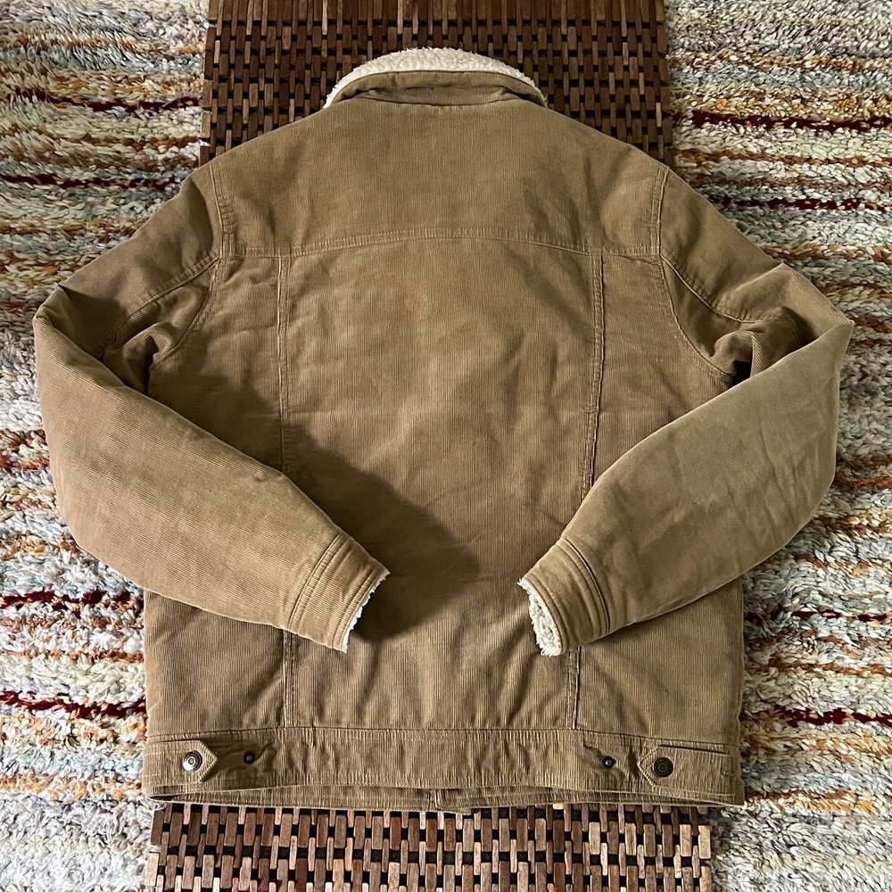 The Guess Tan Cord Sherpa Trucker Jacket is a stylish and versatile outerwear option for men in size medium. Made of cotton with a polyester lining, this solid brown jacket features a corduroy fabric type and a regular fit. The button-down style and military jacket theme make it perfect for casual occasions during the winter, fall, and spring seasons. With its classic design and quality construction, this Guess jacket is a great choice for everyday wear.
