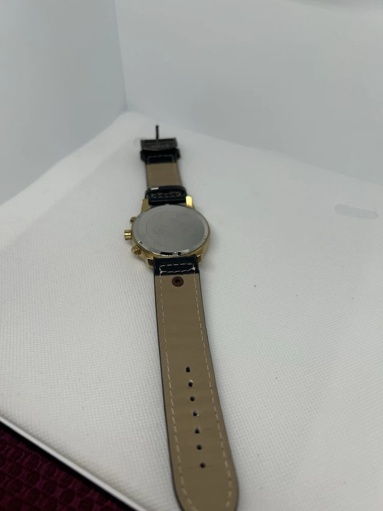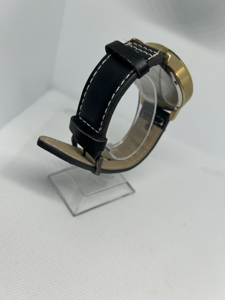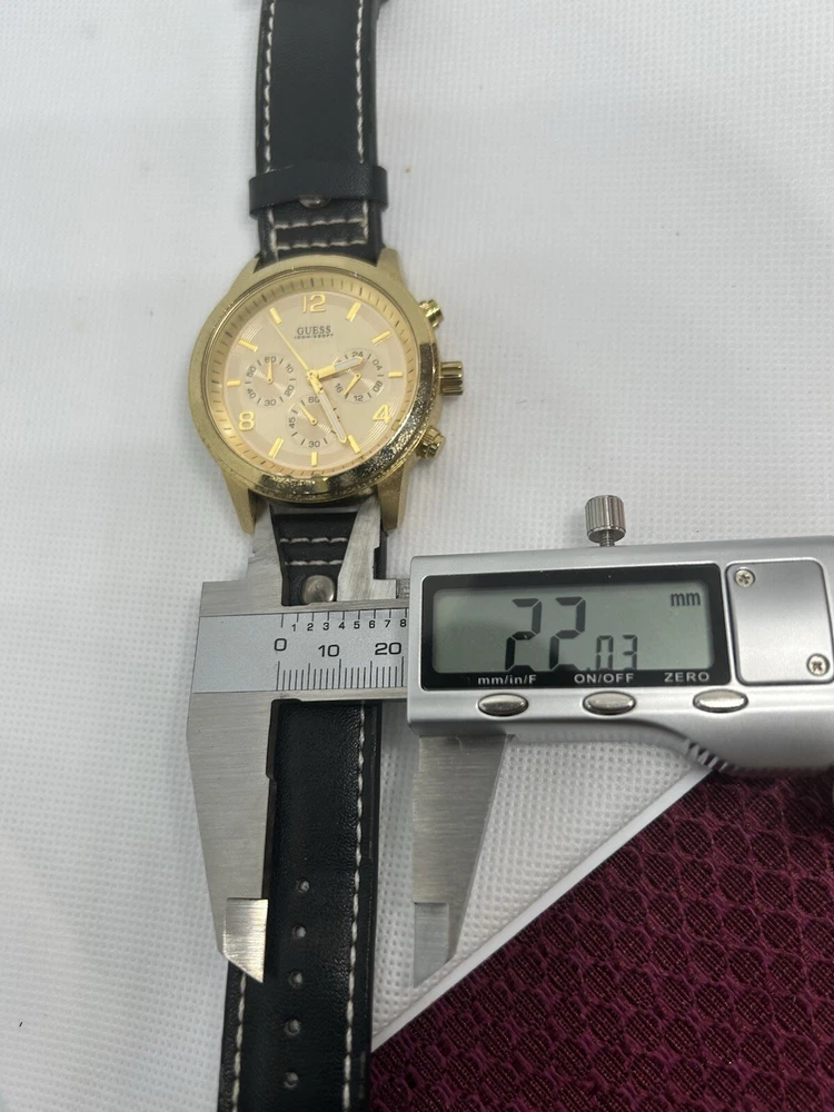 Elevate your style with this stunning Guess Cronograph wristwatch for men. Crafted with a brushed stainless steel case and a gold leather strap, this timepiece boasts a round rose gold dial with stick indexes and a 12-hour smooth bezel. The watch is water-resistant up to 100 meters (10 ATM) and features a quartz movement for precise timekeeping. This wristwatch is the perfect addition to any casual outfit and is sure to turn heads with its sleek and sophisticated design. The Guess U15061G2 comes without papers or original box/packaging, but it is not customized. Reference number: U15061G2. This watch is pre owned and in good condition. It has some grime on its case. Leather strap is still in good condition