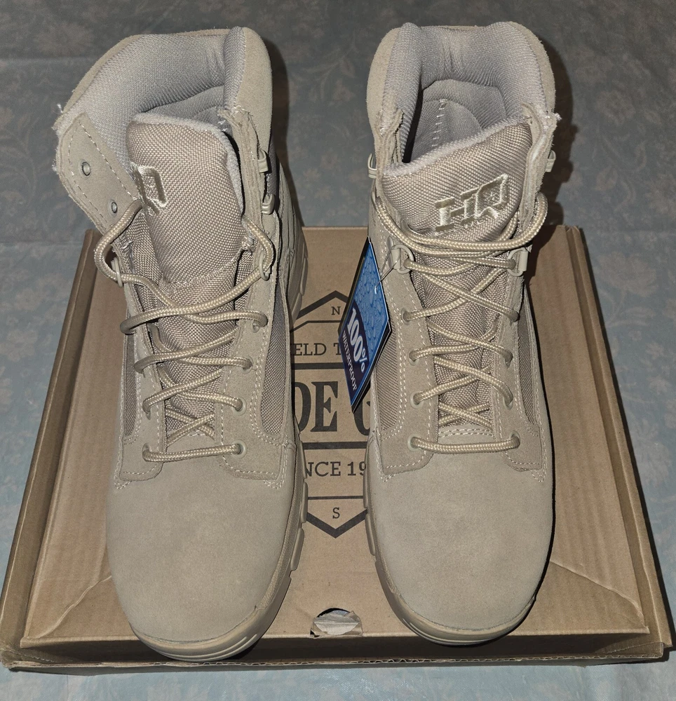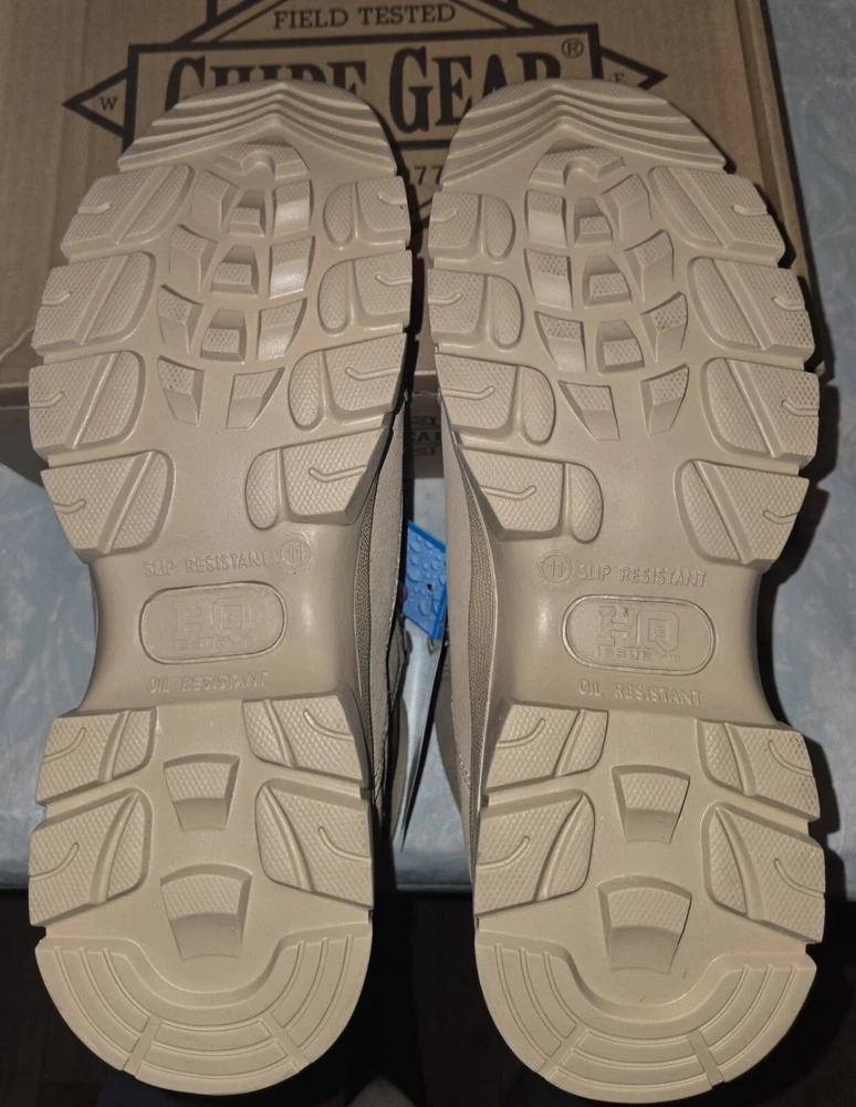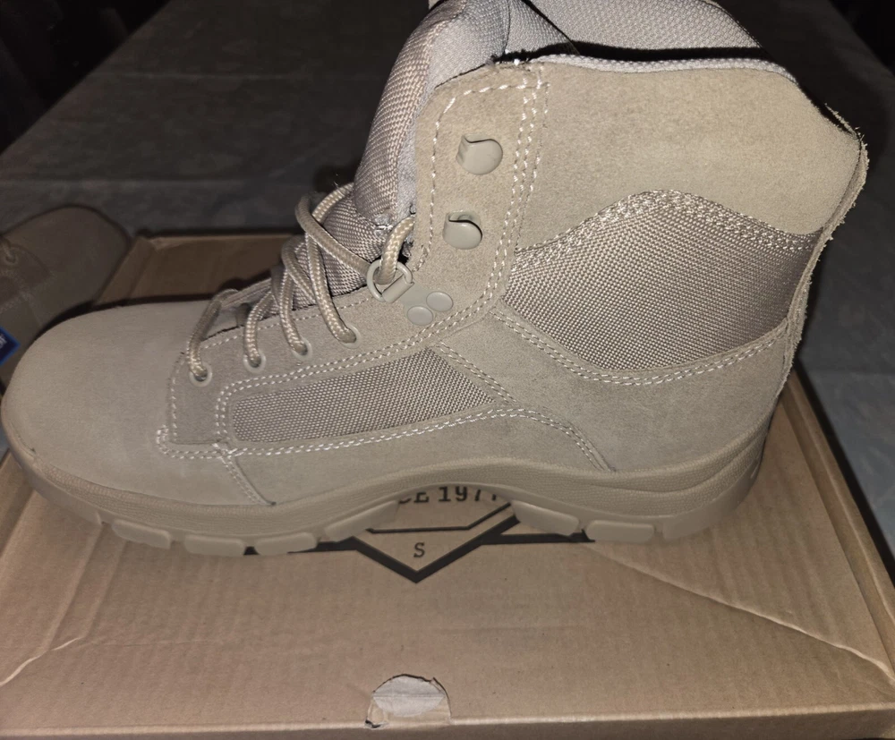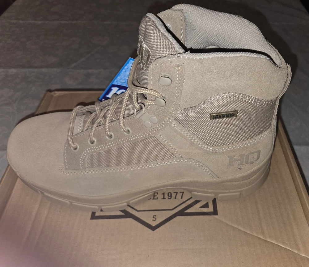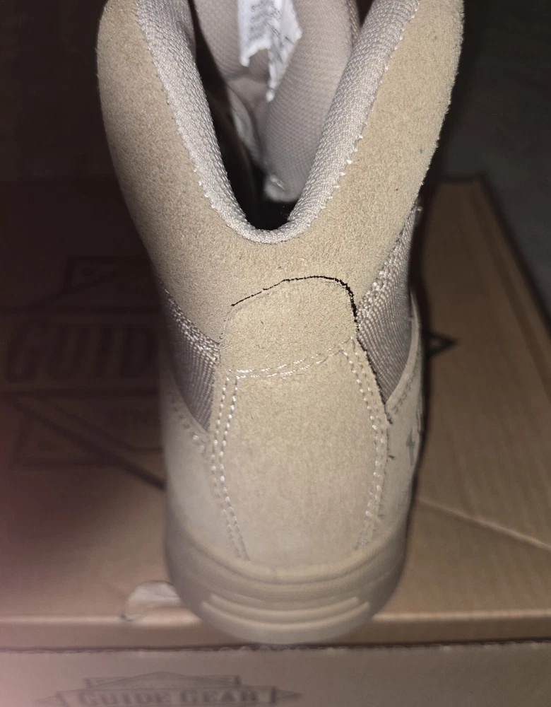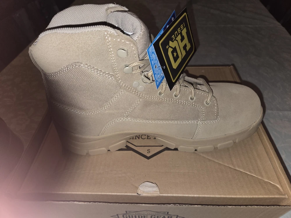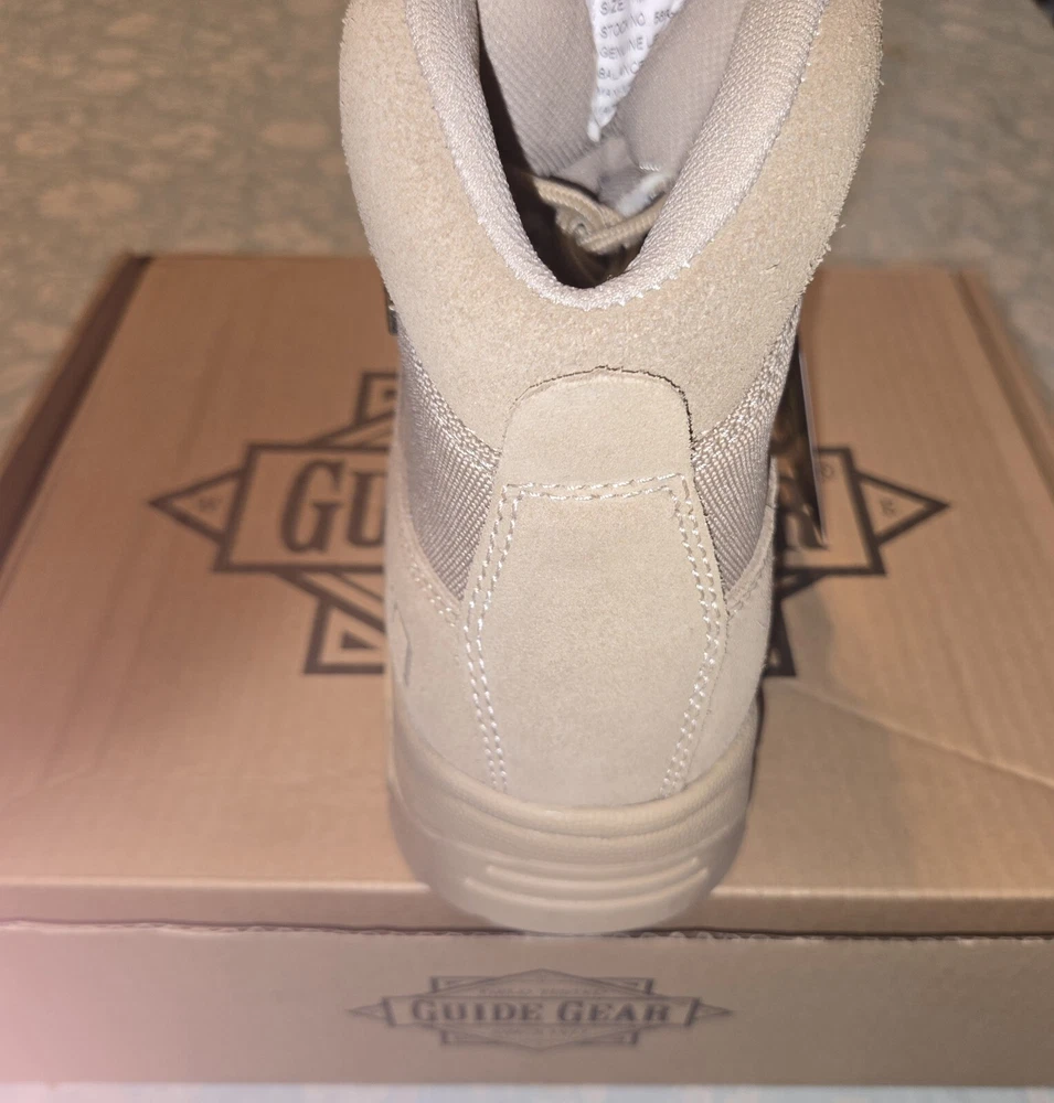 These are Guide Gear HQ 6 Inch Desert Boots in beige, size 11M. They feature a solid pattern, drawstring closure, genuine leather upper, and a military & weaponry theme. The boots are designed for men and have a medium width. Made in China by Guide Gear, these boots are perfect for outdoor activities or casual wear. PLEASE SEE PICTURES ANY QUESTIONS PLEASE ASK.