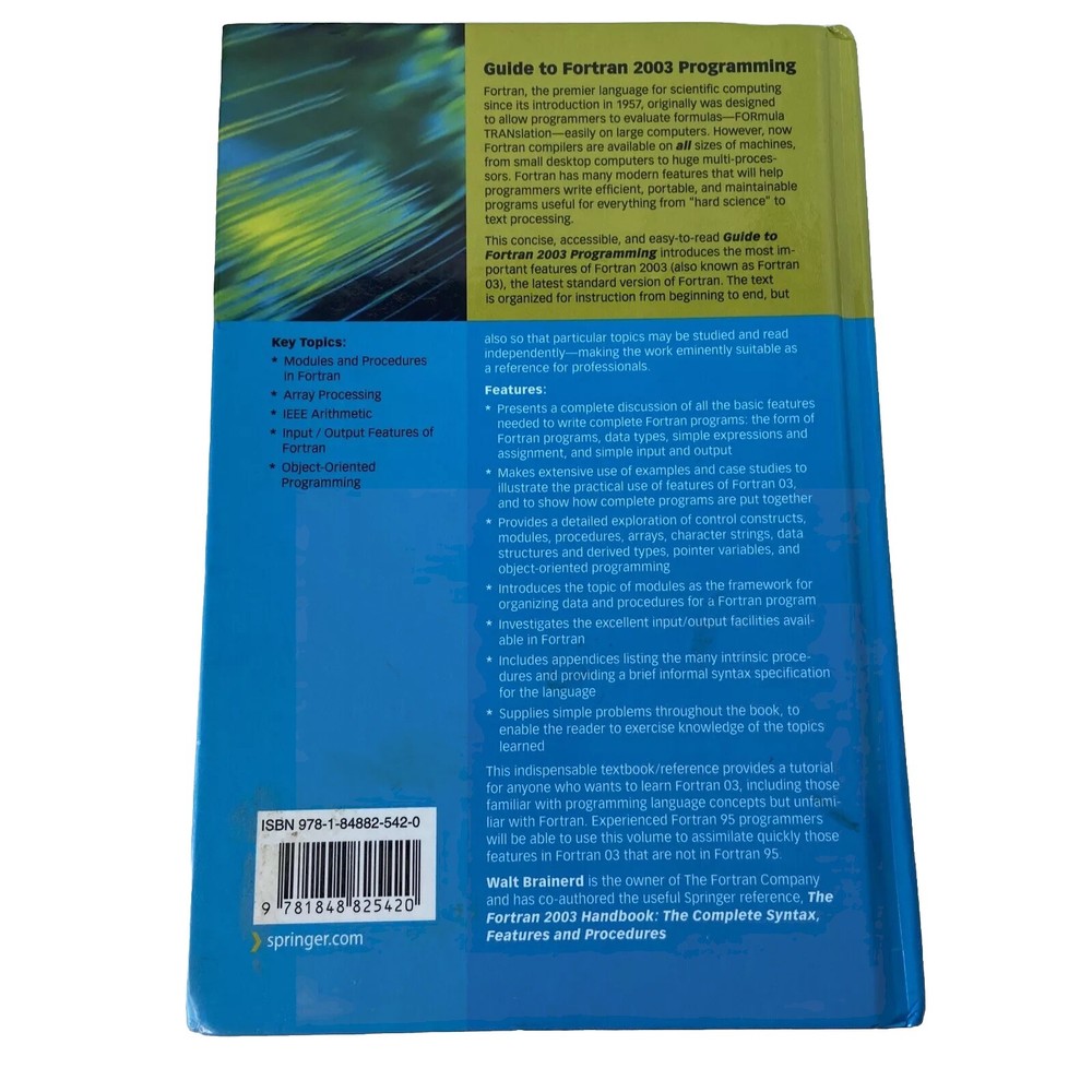 The product is a "Guide to Fortran 2003 Programming" textbook written by Walter S. Brainerd. Published by Springer in 2009, it is a hardcover book in English, measuring 9.3 inches in length and 6.1 inches in width. The book has X, 357 pages and weighs 54 ounces. It covers topics in Computers, Programming Languages, and Algorithms.