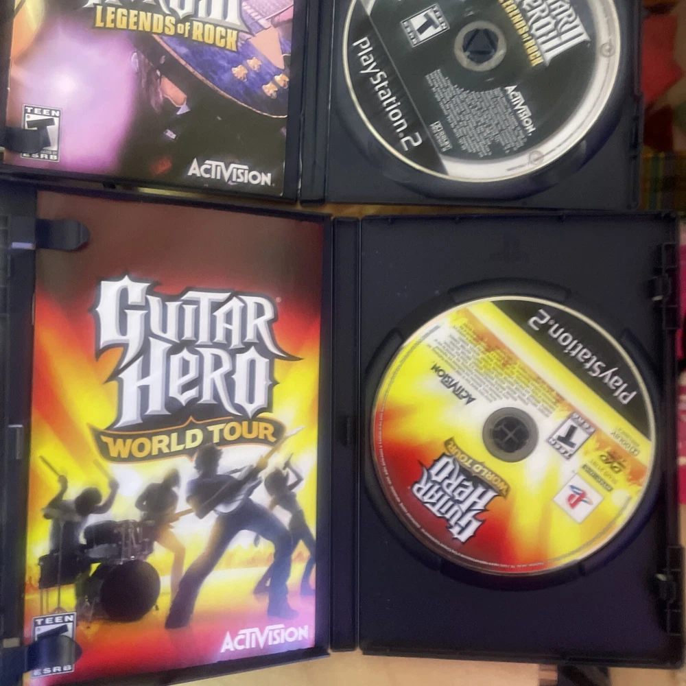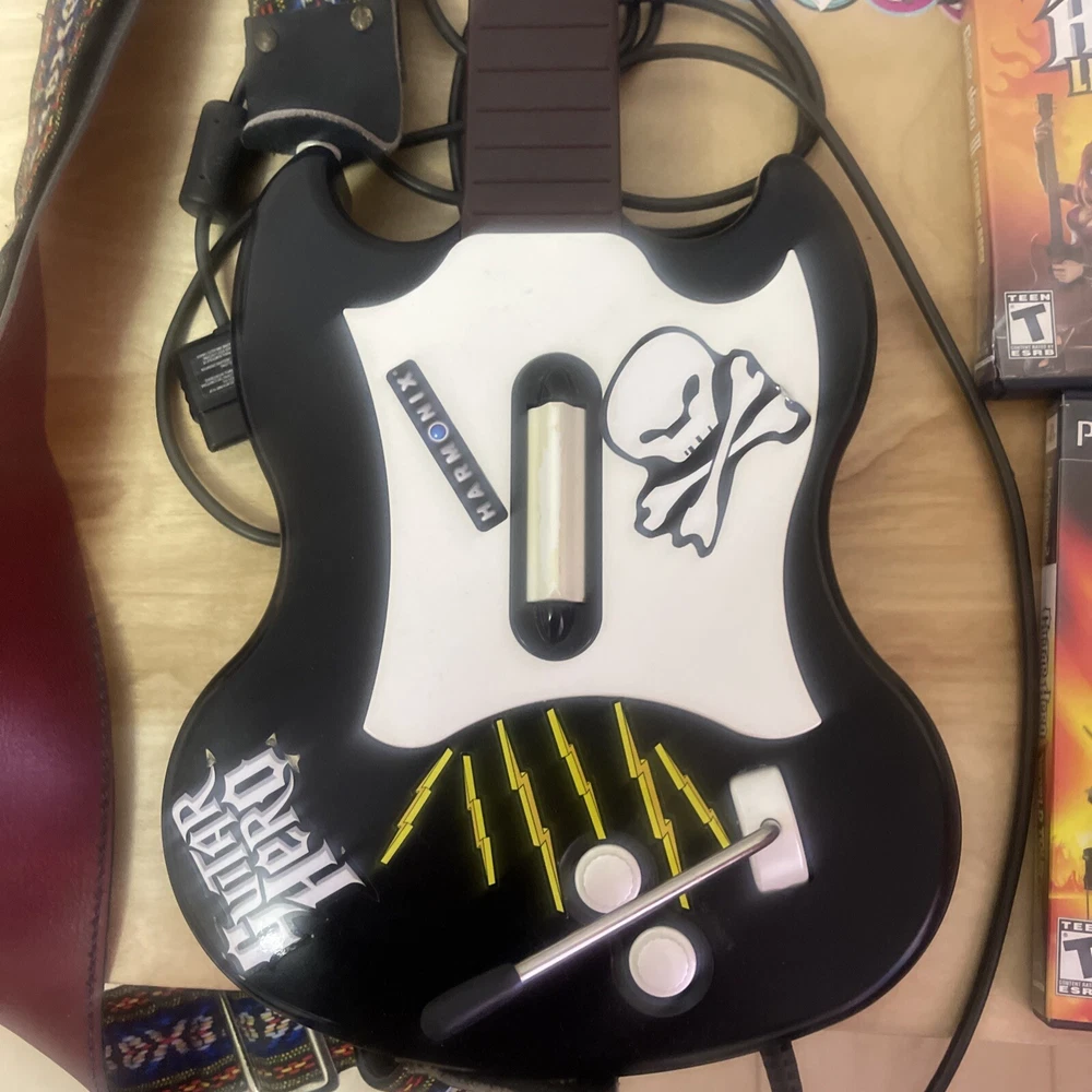 For sale: an essential starter pack for guitar hero. Everything is in overall great condition. The reverb bar is a little loose and there is something rattling in the guitar but it functions perfectly. The games are all CIB and in great shape. One game case has a small crack on the side of the case. Thanks for looking.