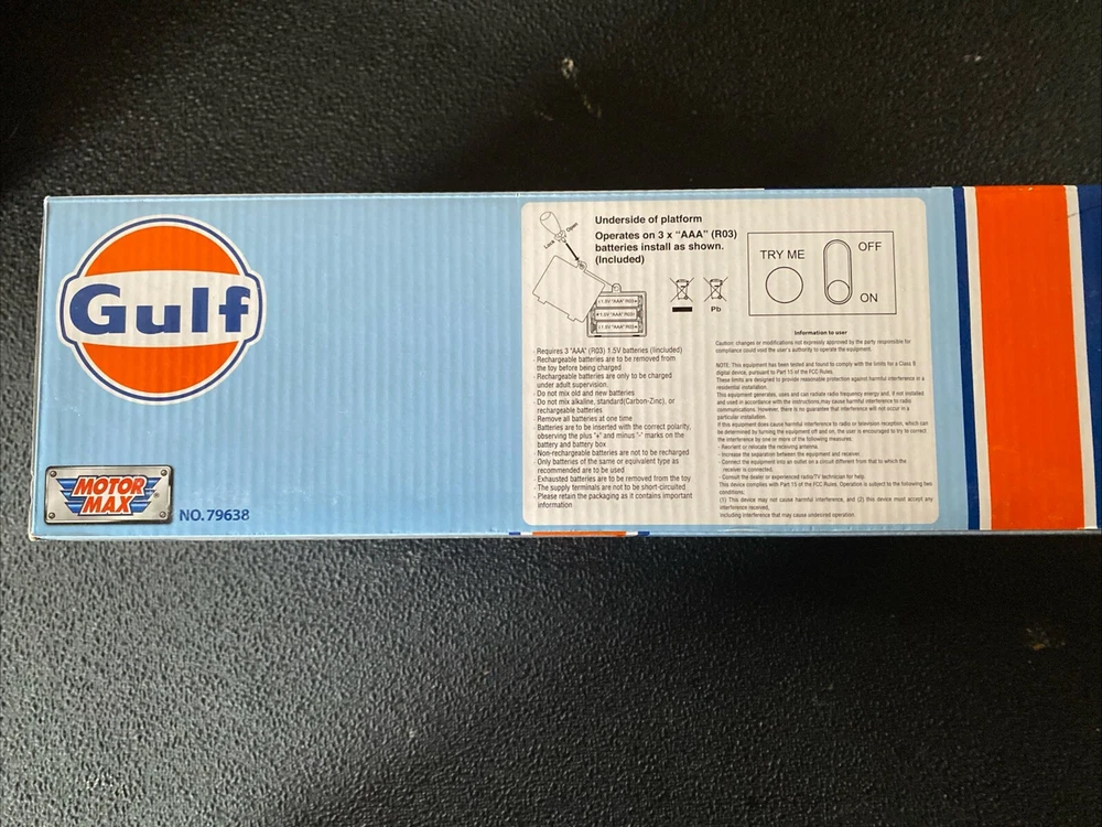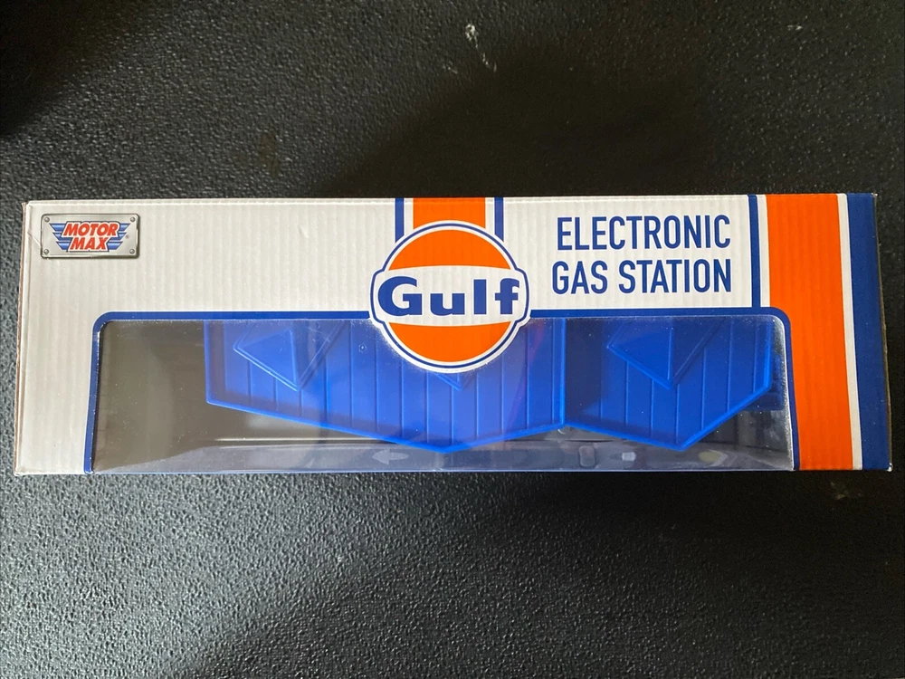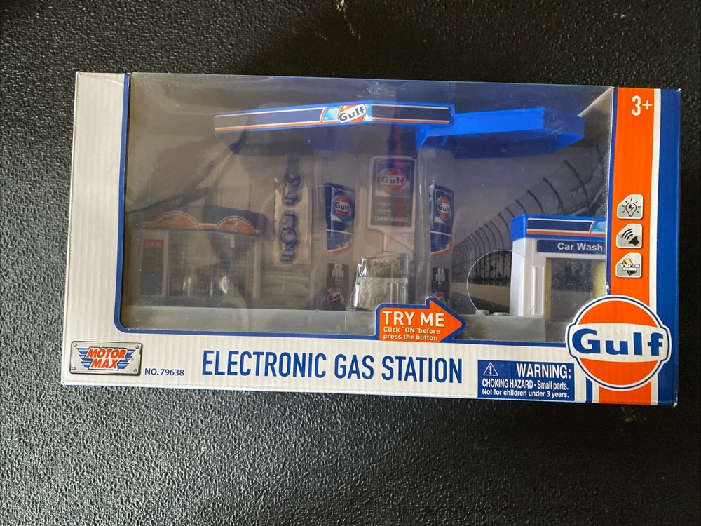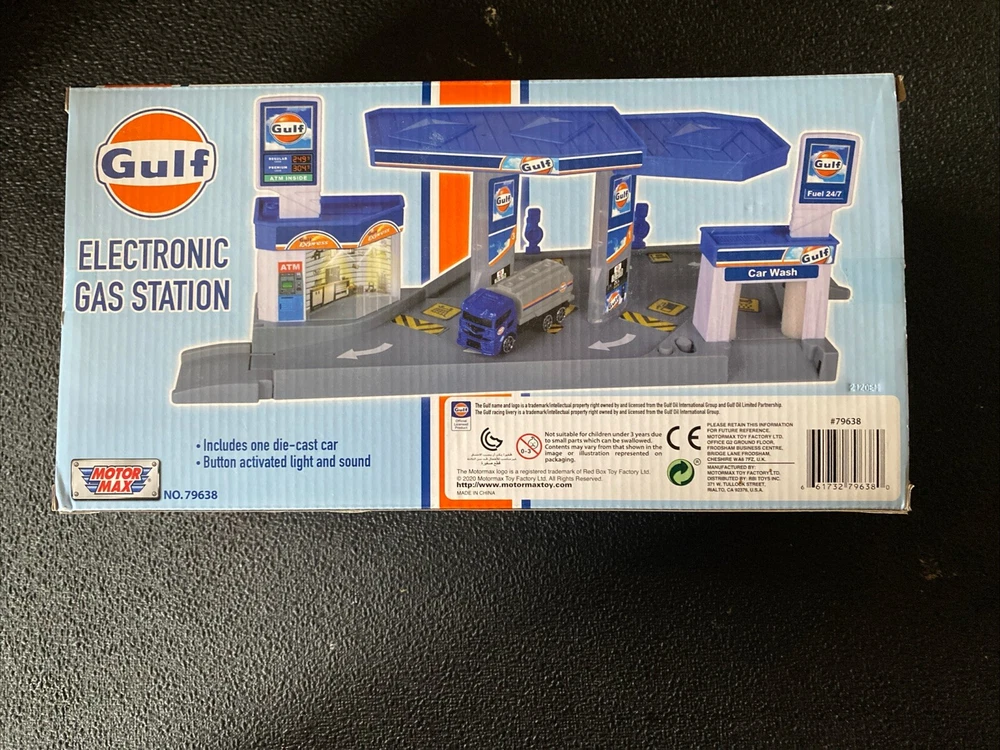 For collectors and enthusiasts of diecast models, this "Gulf" Electronic Gas Station with Light & Sound & Tanker Truck 1:64 By Motor max is a must-have addition to your collection. The set includes a detailed diorama of a gas station with a truck, both made of high-quality plastic and diecast truck material respectively. Featuring a unopened box and with light and sound functions, this model is perfect for display or play. The gas station and truck are both beautifully designed with the Gulf Oil franchise theme, making it a great gift for anyone who loves gas and oil related models. Manufactured in 2020, this set is a great addition to any collection. * Brand new 1/64 scale model of "Gulf" Electronic Gas Station Diorama with Light and Sound and Tanker Truck by Motormax. * Brand new box. * Decals included. * Real rubber tires. * Detailed exteriors. * Officially licensed product. * Button activated light and sound. * Service Station is made of plastic. * Batteries included ("AAA" (R03) 1.5V x 3). * Approximate length of Tanker Truck is L-5 inches long. * Tanker Truck is made of diecast with some plastic parts. * Approximate dimensions of Electronic Gas Station is L-11, W-6, H-5 inches.