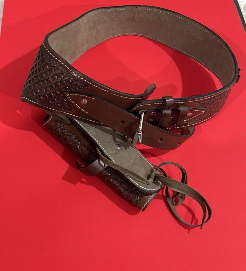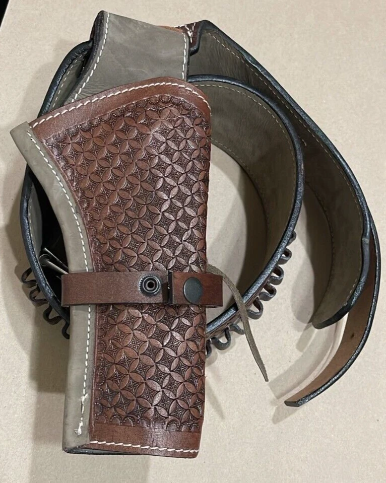 These distinctive leather pistol holster belts are ideal for daily use, hunting, ranch work, or add to your collection. Premium, real, hand-tooled leather is used to make these belts, which are crafted for a smooth draw and easy re-holstering. An incredibly stunning and amazing piece. Size 38"-40"
