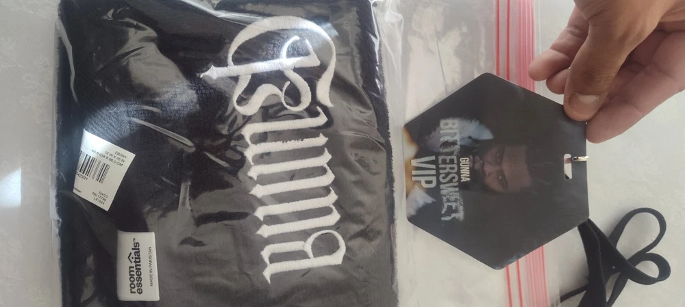 I work security and I just so happened to work the Gunna concert at the Toyota music factory in Irving. His name Gunna is stitched in white It was his personal towel he used during his performance. Never been washed. Just kept it in a bag I also have the vip badge to go with it.