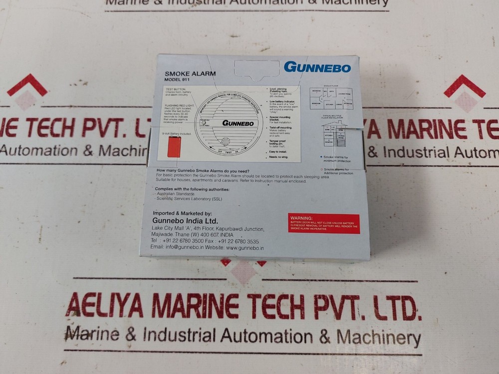 Aeliya Marine Tech Private Limited 100% Genuine Products | Free Shipping | 30 Days Return Policy *You are only buying what you see in photos* ----------------------------------------------------------------------------------------------------- Gunnebo smoke alarm 911 (without battery) gunnebo india ltd. smoke alarm model: 911 smoke alarms for minimum protection 0915-7716-00 sensitivity = 1.26 percent/ft ± 0.38 percent made in china weight: 175 gm Qref : 997 ref no: 63128 Taxes & import duties Destination country all taxes & duty to be paid by buyer.[not included in price]. Payment Paypal for air/courier shipment. T/T option available for the large items above 300 Lbs. Packing Quality packing for each product. Assured safe and undamaged delivery. Shipping Free Shipping on all products except heavy items. FedEx Express, DHL Express International Shipping. Shipping through sea available for large order. RETURN POLICY Returns accepted within 30 days. Duty charges and Shipping charges will be borne/pay by the Buyer. Restocking Fees will be 20%. Please check the listing properly as returns are not accepted in only for parts products. About us We are one of the leading stockiest and exporter of marine & industrial equipment. Our motto is customer satisfaction. Please Contact us for your feedback.