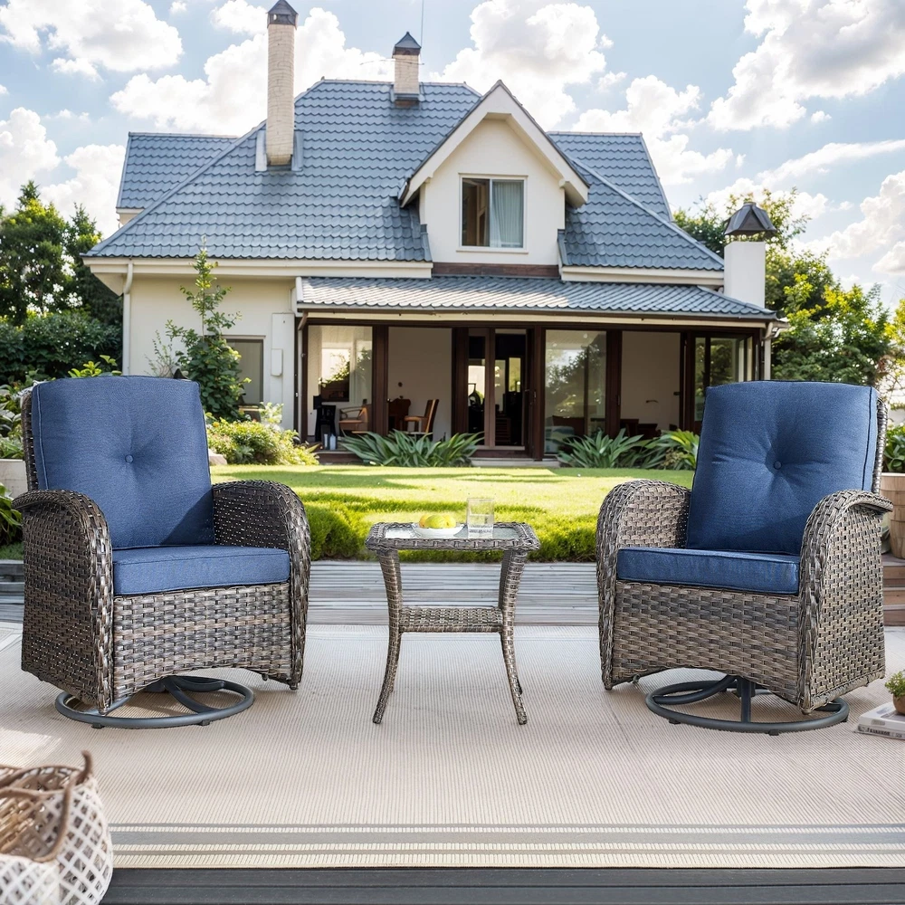 Chair Color:Black Rattan Color: Brown & Yellow; Grey Cushion Color: Beige color, Blue color Chair Dimensions:28.5"D x 31"W x 35"H Table Dimensions: 19.7"D x 19.7"W x 19.7"H Style:Modern Special Feature:Swivel, Arm, Cushion AvailabilityAbout this item Rocking and 360 degree swivel: Relax and enjoy sitting on your front or back porch in ultimate comfort with rocking/ glider feature allowing for backward and forwards motion while also being able to swivel 360 degree to change direction. Glass Table Top:The top of the coffee table is equipped with transparent glass, whether you are enjoying a cup of coffee alone on the front porch or indulging yourself with families or friends in an evening drink on your back terrace, you will do so in comfort and style. Handwork Material: This Free Shipping Over $49.99* Details Gymojoy Swivel Patio Chair & Table 3 Piece Outdoor Furniture Set Product Description: Chair Color:Black Rattan ColorBrown & Yellow; Grey Cushion ColorBeige color, Blue color Chair Dimensions:28.5"D x 31"W x 35"H Table Dimensions 19.7"D x 19.7"W x 19.7"H Style:Modern Special Feature:Swivel, Arm, Cushion Availability About this item Rocking and 360 degree swivelRelax and enjoy sitting on your front or back porch in ultimate comfort with rocking/ glider feature allowing for backward and forwards motion while also being able to swivel 360 degree to change direction. Glass Table Top:The top of the coffee table is equipped with transparent glass, whether you are enjoying a cup of coffee alone on the front porch or indulging yourself with families or friends in an evening drink on your back terrace, you will do so in comfort and style. Handwork MaterialThis wicker patio chairs have high quality rustproof galvanized strong steel frame, durable and not break easily; waterproof PE rattan wicker and Water Resistant cushions, Suitable for all weather ,outdoor and indoor. UV Resistant; Weather Resistant; Water Resistant. Stable and breakage-proof tempered glass table top. Assembly and MaintenancePatio chairs set of 2 is easy to install with all the instructions and hardware included. Maintenance free set which is suitable for balcony, deck, backyard, patio, garden, poolside, etc. Packing List: 2× Chair 2× Seat Cushion 2× Back Cushion 1x Coffee Table 1x Instructions and all necessary hardware