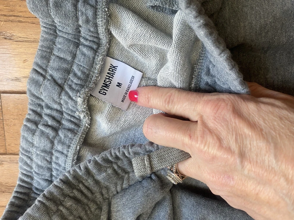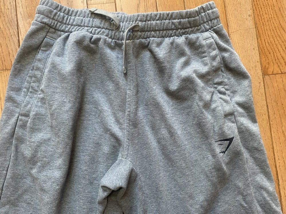 These Gymshark sweatpants are men's size medium in gray. They feature a drawstring closure and are made of a polyester, cotton, and cotton blend fabric. The sweatpants have a blended fabric type and a 30-inch inseam. They are suitable for activities like gym training, cross-training, and running, with an athletic fit for a comfortable workout experience.30" waist 30" inseam super comfortable