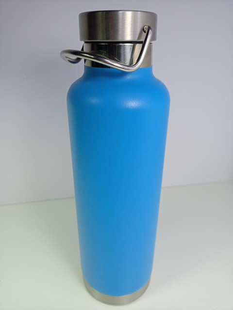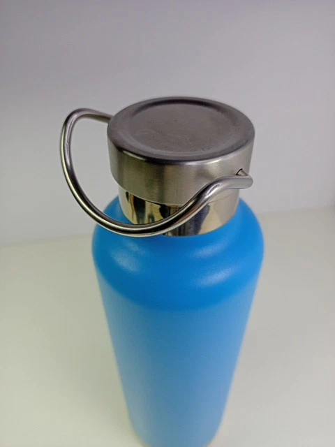 This looks like it was never used. The inside is clean with no water spots. The outside has no scratches. There was a Christmas sticker on the bottom. It may have been a gift. Beautiful turquoise blue unlike the photo. Textured surface for easy grip. Stainless Steel lining and top. 24 ounces.