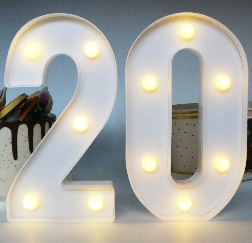 This product is a set of light-up numbers that spell out "20" in a contemporary style, perfect for party decorations. The numbers are made of plastic and emit a bright light, adding a festive touch to any occasion. The solid white color and sleek design make them a versatile option for all types of events, including birthdays and other celebrations. These props are sure to add a touch of sparkle to your party decor. Fast shipping!