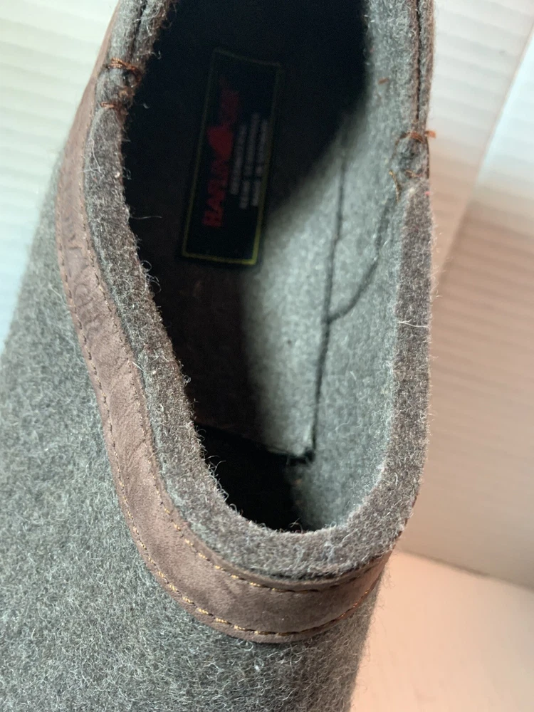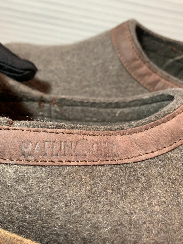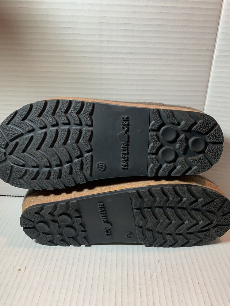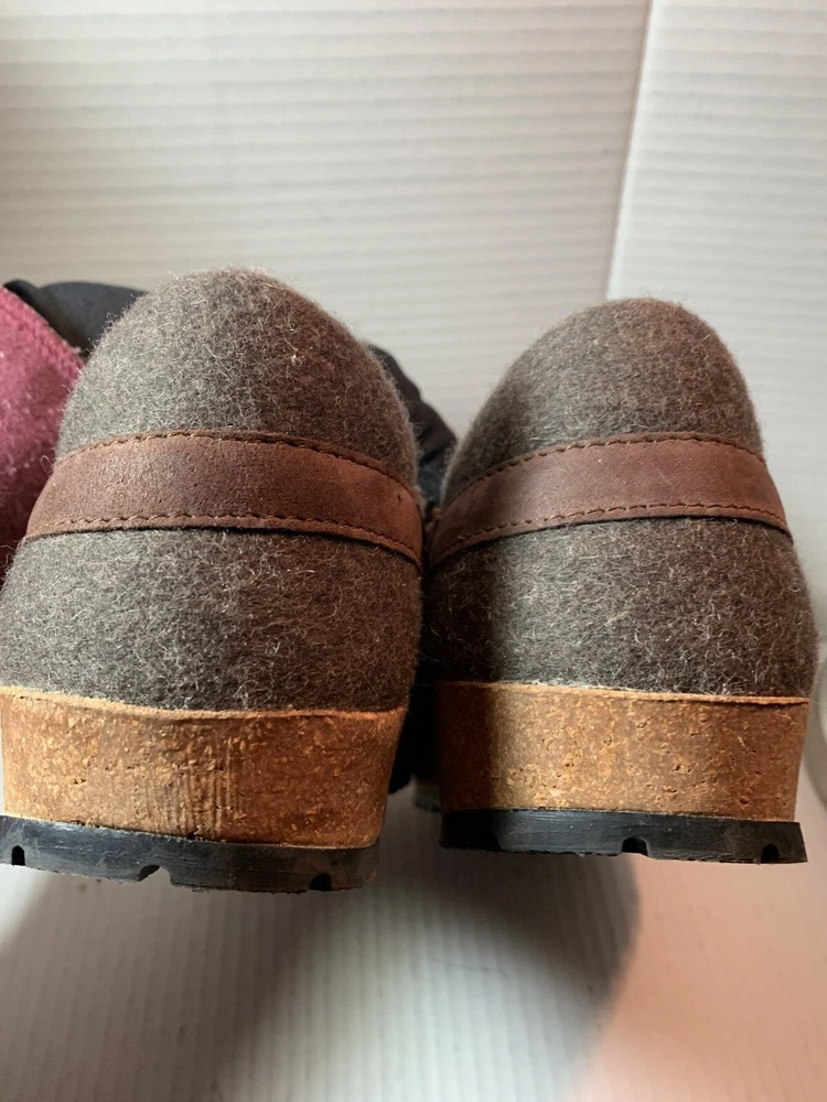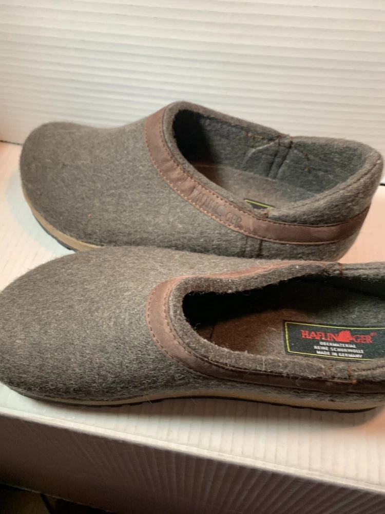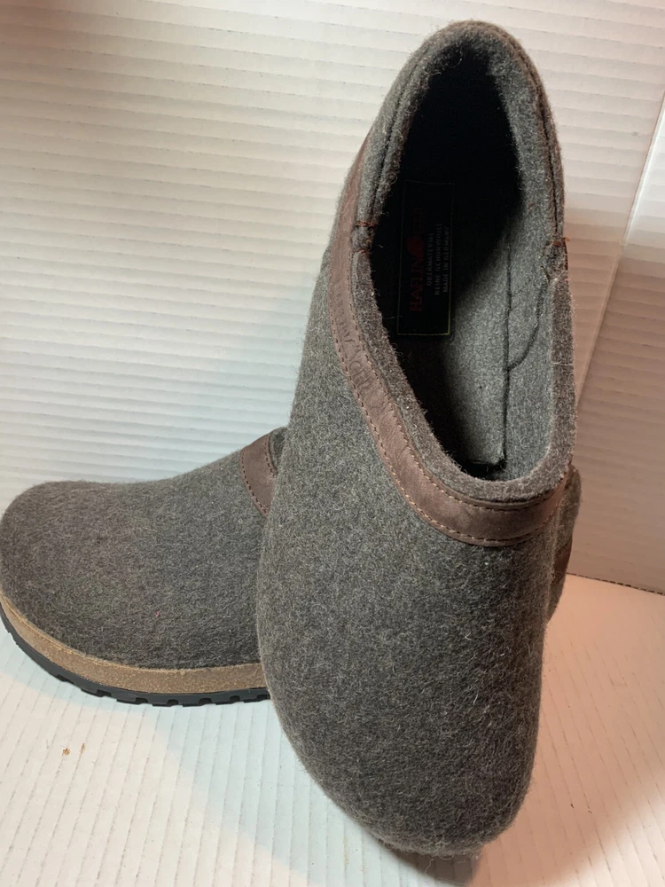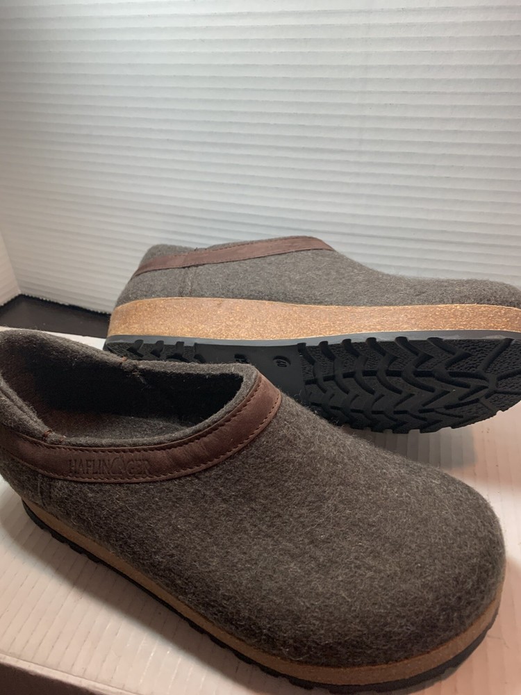 These are HAFLINGER German women's shoes in size 9, made of 100% virgin wool. They are slip-on clogs with a round toe shape and a flat heel style. The upper material is wool and the lining and insole materials are also wool. The outsole is made of suede. These shoes are designed for comfort and support, with arch support and a non-slip sole. They are suitable for travel, casual wear, and workwear. The shoes have a classic design and are available in brown blend.