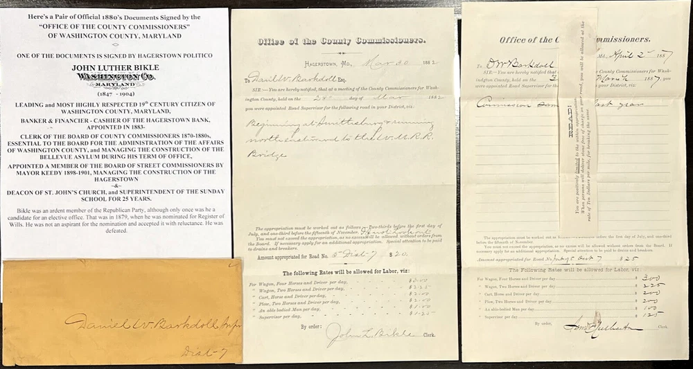 Here’s a Pair of Official 1880’s Documents Signed by the “OFFICE OF THE COUNTY COMMISSIONERS” OF WASHINGTON COUNTY, MARYLAND <> ONE OF THE DOCUMENTS IS SIGNED BY HAGERSTOWN POLITICO JOHN LUTHER BIKLE (1847 - 1904) LEADING and MOST HIGHLY RESPECTED 19 th CENTURY CITIZEN OF WASHINGTON COUNTY, MARYLAND, BANKER & FINANCIER - CASHIER OF THE HAGERSTOWN BANK, APPOINTED IN 1883, CLERK OF THE BOARD OF COUNTY COMMISSIONERS 1870-1880s, ESSENTIAL TO THE BOARD FOR THE ADMINISTRATION OF THE AFFAIRS OF WASHINGTON COUNTY, and MANAGING THE CONSTRUCTION OF THE BELLEVUE ASYLUM DURING HIS TERM OF OFFICE, APPOINTED A MEMBER OF THE BOARD OF STREET COMMISSIONERS BY MAYOR KEEDY 1898-1901, MANAGING THE CONSTRUCTION OF THE HAGERSTOWN ~&~ DEACON OF ST. JOHN’S CHURCH, and SUPERINTENDENT OF THE SUNDAY SCHOOL FOR 25 YEARS. Bikle was an ardent member of the Republican Party, although only once was he a candidate for an elective office. That was in 1879, when he was nominated for Register of Wills. He was not an aspirant for the nomination and accepted it with reluctance. He was defeated. The documents measure 8 ½” x 14” and are in very fine condition. BIOGRAPHICAL NOTES: <> JOHN L. BIKLE DIES AT DANSVILLE, N.Y. Cashier of the Hagerstown Bank Succumbs to General Break Down While Undergoing Treatment at Jackson Health Resort, Aged 57 Years. John L. Bikle , cashier of the Hagerstown Bank, and one of the leading and most highly respected citizens of Washington County, died about 8 o'clock Sunday evening at the Jackson Health Resort, Dansville, N.Y. Death was due to a general breakdown of the system. He had been under treatment at Dansville since the middle of May. Friday evening there was a change for the worse in his condition and he gradually grew weaker. A telegram received in Hagerstown on Sunday stated he was sinking. He slept away. Gathered about his bed at the time were his devoted wife and his two sons, Rev. Charles G. Bikle, of Dansville, and E. Blaine Bikle, of Hagerstown. The latter left Baltimore Saturday evening for Dansville and reached there in time to see his father alive. John L. Bikle was born at Smithsburg, this county, February 21, 1847, being a son of Christian and Barbara Bikle. He received his education in the schools at Smithsburg and afterward taught school. About 1872 he moved to Hagerstown and engaged in the grocery business. While conducting this store, he was appointed a deputy clerk in the office of the county tax collector. He was afterward appointed clerk to the Board of County Commissioners. During his term in office, Bellevue Asylum was built. On January 31, 1883, Mr. Bikle entered the Hagerstown Bank as bookkeeper. From that position he was promoted to teller, and when Edward W. Mealey resigned as cashier to take charge of the finances of the Crawford Bicycle Company Mr. Bikle was made cashier. As a bank official Mr. Bikle was held in the highest esteem, not only by the patrons of the institution with which he was connected, but by all bankers with whom he came in contact. Mr. Bikle was an ardent Republican, although only once was he a candidate for an elective office. That was in 1879, when he was nominated for register of wills. He was not an aspirant for the nomination and accepted it with reluctance. He was defeated. In 1898 he was appointed a member of the Board of Street Commissioners by Mayor Keedy to succeed Daniel W. Reichard. He served out his term of three years with credit to himself and to the city. It was during his term that the city light plant was built. While not one of those who advocated the city spending $65,000 in the erection of a lighting plant when the time came to establish the system Mr. Bikle did his duty unflinchingly. Mr. Bikle was a member of and an officer in St. Johns Lutheran Church, being a deacon at the time of his death. For nearly 25 years he was superintendent of the Sunday School. He took a deep and active interest in church work and gave liberally toward its support. He was also a member of the following fraternal organizations, having filled the highest offices in the local branches of some: Friendship Lodge, A.F and A.M.; Potomac Lodge, I.O.O.F.; Pen-Mar Council, Royal Arcanum; Blue Mountain Ruling, Fraternal Mystic Circle; Washington Lodge, Knights of Honor. Last winter Mr. Bikle's health began to fail, and at the urgent solicitation of the directors of the bank he took a much-needed rest. After spending several weeks in Baltimore with his daughter, Mrs. Robert V. White, Mr. Bikle returned to Hagerstown feeling much better. The relief, however, was only temporary, and as spring came on it was plain to see that he was not a well man. Again Mr. Bikle was reluctant to take the rest which it was apparent his body needed, and it was only after much persuasion on the part of the bank directors that he agreed to accept the indefinate vacation which they granted him. On May 16 Mr. Bikle, accompanied by Mrs. Bikle, went on a visit to their son, Rev. Charles G. Bikle, who is pastor of the Lutheran church at Dansville, N.Y. A few days later he entered the Jackson Health Resort to undergo a system of treatment. The relief hoped for, however, was not forthcoming. While there were many days when he felt good, he did not regain his strength. On Thursday of last week Rev. Dr. S. W. Owen, pastor of St. John's Lutheran church, this city, was at Dansville and called to see Mr. Bikle. The latter was not feeling at all well on Thursday, although he spent a very comfortable day the Wednesday before. Recently an ulcerated throat had prevented him from taking proper nourishment. Mr. Bikle was a quiet, unassuming gentleman, who was devoted to his home. He was possessed of superior executive ability and excellent judgment. His thoroughness, coupled with his methodical ways and his energy, made him the successful banker that he was and caused him to be honored and respected by all. Mr. Bikle took a deep interest in the affairs of the city, county, State an