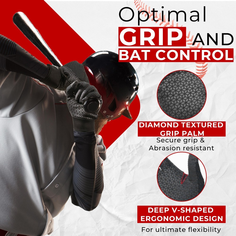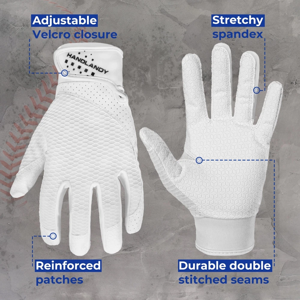 Perfect Fit:The shell-textured stretch-spandex on the gloves back ensure unmatched comfort, superior flexibility, and precise tactile feedback during gameplay.Each pair of HANDLANDY youth and adult baseball batting gloves hugs the skin snugly, allowing your hands to flex and sense the bat with the natural precision of bare skin. Trusted Performance: HANLANDY batting gloves feature diamond-textured grip palms that deliver all-weather control,grip and comfort. Engineered for tournament-ready precision, they enhance swing stability and power transfer for peak performance. Focus On Every Detail: Double-stitch design enhances durability and the lifespan of gloves.The hook and loop wrist strap provides a snug fit and great range of motion, making it easy to adjust the gloves to your liking. Play Together, Stay Together: Available in sizes for kids and adults with a vibrant range of colors, our batting gloves are designed to unite the whole family. These gloves are more than just gear; they're a tool for family bonding. Whether it's weekend games or daily practice, these gloves create unforgettable moments and lasting memories for you and your loved ones. Meaningful Gift:HANDLANDY gloves are engineered for baseball and softball players of all ages and skill levels. These gloves make the perfect gift for athletes, coaches, teams, or enthusiasts—ideal for Christmas, birthdays, or any occasion celebrating a love of the game.