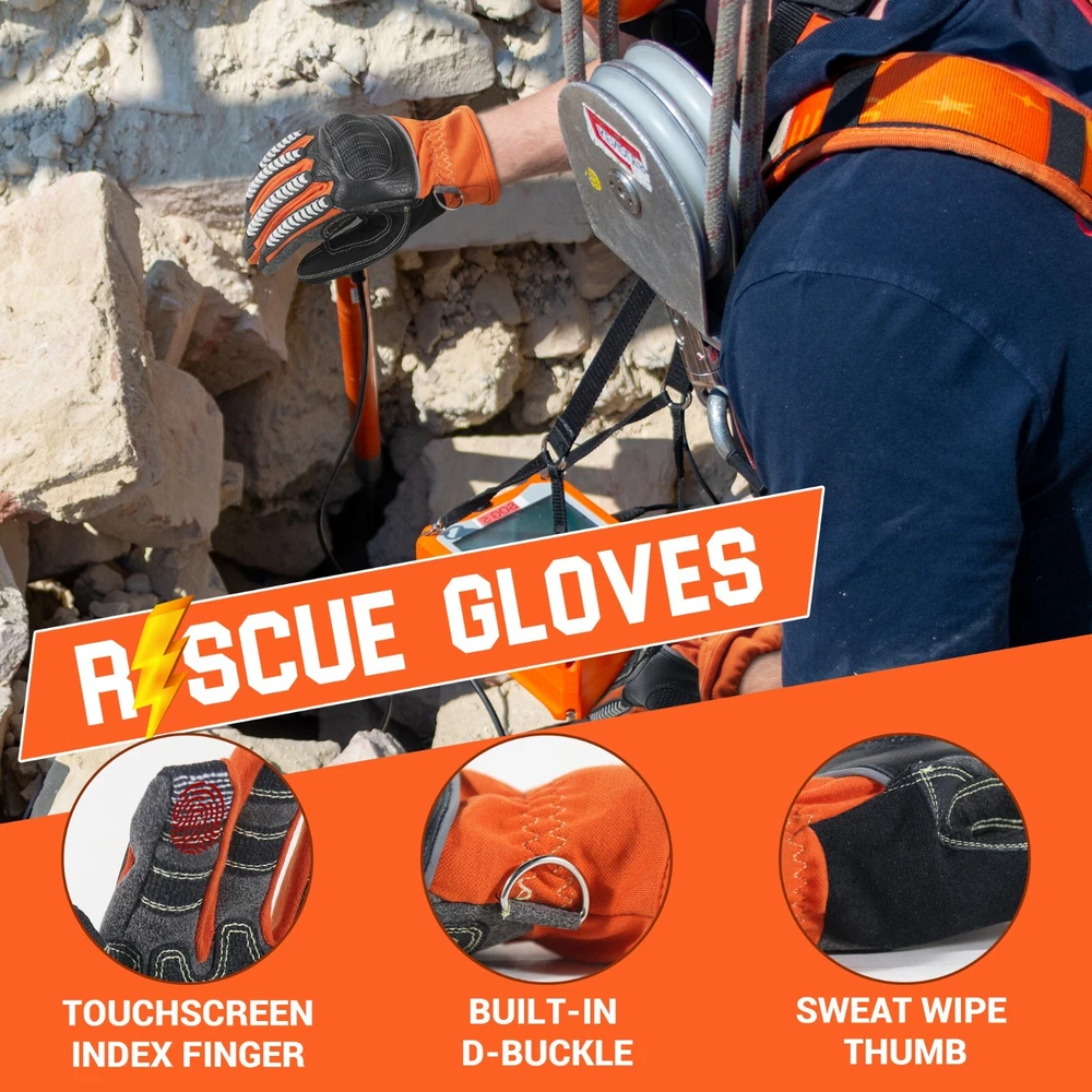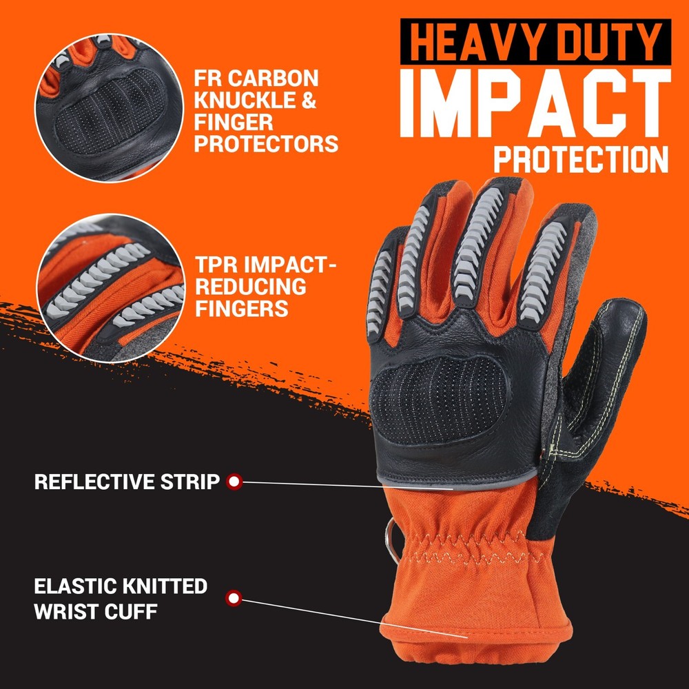 Heat and flame resistant: Made from flame-resistant synthetic leather/ spandex/ knitted cuff/ carbon knuckle strips. FR carbon knuckle strips offer maximum protection on the back during impact injuries, and with heat & flame-resistant lining, creating an outstanding heat-blocking barrier for firefighters. Meet NFPA 1971:2013. Heavy Duty Impact Protection: HANDPRO TEC Carbon Fiber & Thermoplastic Rubber heavy impact protection on your knuckles to the tip of each finger, perfect extrication and work gloves. Wear Resistance & Grip: Synthetic leather with tough reinforced in the palm & thumb crotch area for abrasion & grip, the perfect mix of durability and flexibility. The elastic cuffs ensure a safe and snug fit without having to deal, and protect against cuts or sharp objects. CE rated for EN388 level 3 cut and puncture resistance, for safely handling sharp or abrasive materials. Touchscreen Compatible: Handy for operating diagnostic devices or answering mobile phones without having to take the work gloves off. The D-buckle design also allows for quicker deployment of your gloves when you need them fast!