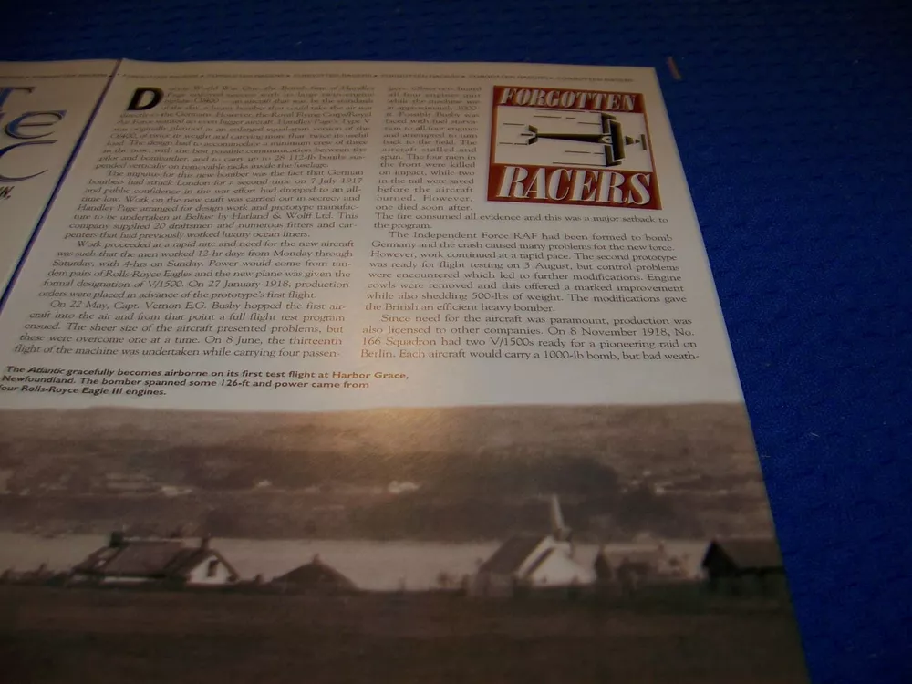 UP FOR SALE IS AN ORIGINAL PRINT 3-PAGE ARTICLE ON......... ....... HANDLEY-PAGE V/1500 "FLIGHT OF THE ATLANTIC" (3-PAGES) Page/s size: APROX: 8" X 11" SUBJECT: ............... HANDLEY-PAGE V/1500 "FLIGHT OF THE ATLANTIC" (3-PAGES) AUTHOR/ARTIST: N/A YEAR: 2001 ORIGINAL PRINT SCALE: N/A ARTICLE FEATURES: -HANDLEY-PAGE V/1500 "FLIGHT OF THE ATLANTIC" (3-PAGES) . ..STORY/HISTORY/DETAILS/2-PAGE HEADER PHOTO PAGES ..A MUST HAVE ON THE HANDLEY-PAGE V/1500 "FLIGHT OF THE ATLANTIC" CONDITION: GREAT........... **SOLD FOR 3-PAGE/S ON SUBJECT LISTED ABOVE AND/OR DRAWINGS/CUTAWAY ONLY... ANY OTHER ARTICLE ON BACK OF DRAWINGS/ARTICLE ARE NOT REPRESENTED IN THIS AUCTION!*** (REMEMEBER THESE ARTICLES ARE EXTREMELY OLD AND RARE...SOME MAY HAVE SOME BORDER DISCOLORATION/SMALL EDGE CHIPS/PAGE DISCOLORATION).....SEE CONDITION AND NOTES LISTED ABOVE AS TO EACH ARTICLE! **THESE ARE AIRCRAFT ARTICLES THAT HAVE BEEN EXTRACTED FROM VINTAGE MAGAZINES/ECT,.. AND ARE INDIVIDUAL PAGES OF EACH SUBJECT AND SOLD AS COMPLETE ARTICLES ON EACH SAID AIRCRAFT AS LISTED ABOVE!...... NOT SOLD AS A COMPLETE MAGAZINE or BOOKLET!!! **all articles are shipped flat on cardboard flat and mail flat in manilla envelope to INSURE condition! ** I DO OFFER COMBINED SHIPPING ON MULTIPLE ITEMS PURCHASED