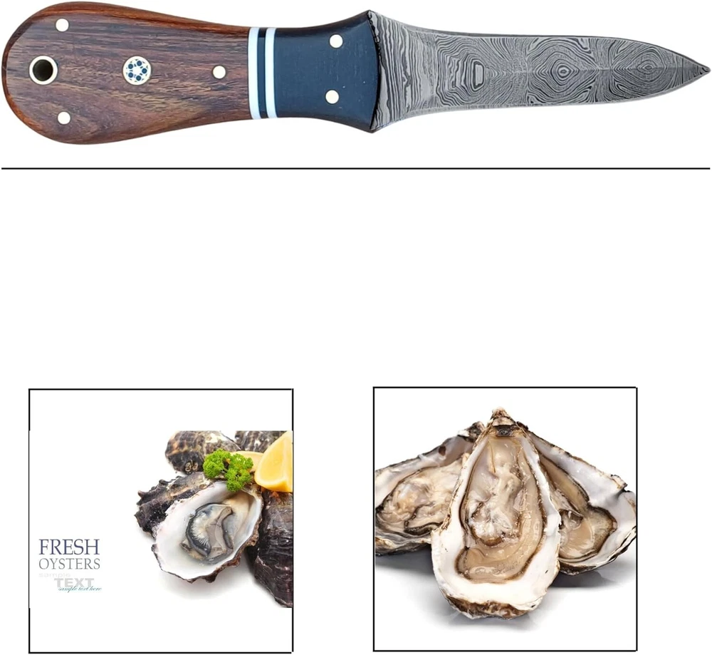 HANDMADE DAMASCUS SEA FOOD OYSTER SHUCKER KNIFE, SHUCKING TOOL WITH SHEATH DOUBLE EDGE FIXED BLADE KNIFE, 06.50 inch Sea Food Opener Tools Kit. HANDLE= Rosewood FIRE STORM PATTERN DAMASCUS STEEL ( 1095 AND 15n20 ) Hardness = 56-58 HRC 352 Layers forged by Hammer MEASUREMENTS OVER ALL LENGTH = 06.50 Inches HANDLE LENGTH = 03.50 Inches BLADE LENGTH = 03.00 Inches BLADE THICKNESS = 4MM SHEATH Custom Handmade Genuine Cow Hide Leather Sheath BUYING Before Bidding or Buying items please make sure that the State, Local and Federal Law of you country allow the parcel to reach you .if your purchase will be held by custom authorities in your country then I will not be responsible for any thing . you will have to deal with the custom of your country . no refund or refund will be given by me . so please make sure that you have all the documents to provide if custom demands from you .. I will only be responsible to provide every documentation needed from my side You will have to deal on your own with VAT or any other TAXES charged in your country you must be sure and certify that you are 18+ of age and are able to legally purchase and own an item ~: HAPPY BUYING :~