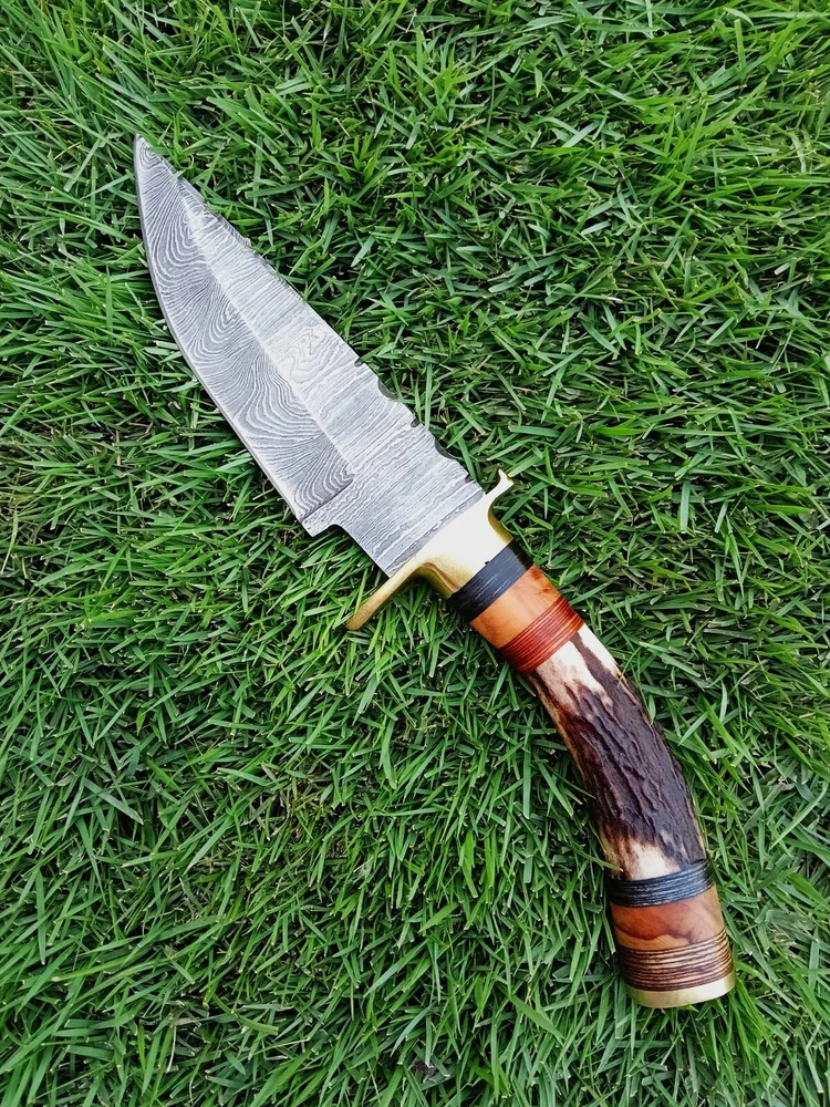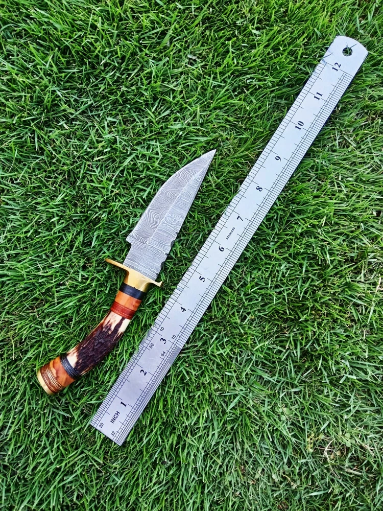 CUSTOM HANDMADE HAND FORGED DAMASCUS STEEL HUNTING KNIFE STAG With Brass GUARD Handle This superb design knife is hand forged. Blade of this knife has a nice file work and is made of 512 layers of 4340 stainless steel and 1075 high carbon steel and hardness 55-58 HRC . This robust knife is lab tested under intense conditions, the balance and shape of this knife ensures perfect grip. Overall Close Length: 8" Inches Blade Length: 4" Inches Damascus Design: Twist Pattern Layers: 512 Sheath: Leather Hand Forged