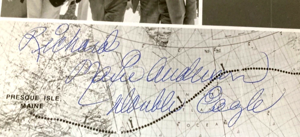 Bottom autograph is HAND SIGNED by Maxie Anderson "DOUBLE EAGLE" balloonist ~FIRST ATLANTIC OCEAN CROSSING~ Please see photos. Very good condition. DOUBLE EAGLE - Signed and inscribed 8 x 10 photograph by MAXIE ANDERSON. Ben Abruzzo (1930-1985), Maxie Anderson (1934-1983) and Larry Newman (1947-2010), were the pilots of the first balloon to cross the Atlantic Ocean in 1978. The composite image depicts the balloon in flight, a map charting the route of the flight and an image of the three crew members in together. The photo is signed in blue ball point pen on the bottom image by Maxie Anderson and is inscribed to "Richard". The photo also features "facsimile" signatures of each of the crew but Maxie Andersons signature is authentic. Autographs of Maxie Anderson are scarce following his untimely death in a flying accident in 1983. This unique item is a signed piece exemplifying the ingenuity of humanity. The signature belongs to the pioneering balloonist Maxie Anderson, and the item is titled "DOUBLE EAGLE". This piece is an original and was produced in the United States. It is a wonderful addition to any collection of Science or Inventor memorabilia as well as for Autograph collectors.