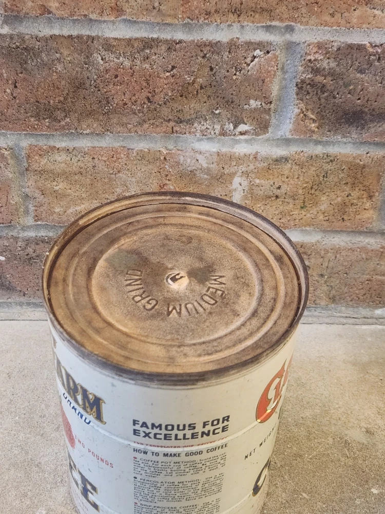 The product is a vintage 2 lb tin litho container of Clover Farm Coffee, featuring a design with a farm and a clover. This collectible advertising item is hard to find and comes from Cleveland, Ohio. It would be a unique addition to any merchandize and memorabilia collection, especially for those interested in vintage tins or coffee-related items.