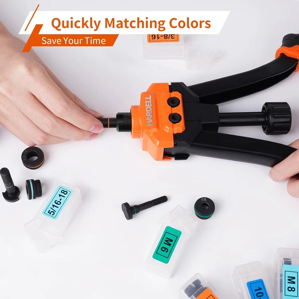 HARDELL Rivet nut Tool, 14" Rivnut Tool with 100 Pcs Rivet Nuts and 7 Metric & Inch Mandrels M6 M8 M10, 1/4-20, 5/16-18, 3/8-16, 10-24 and Rugged Carrying Case 【Efficient Rivet Nut Tool Kit】 The Rivet Tool includes most you need with a rivet nut tool and an assortment of 7 metric and inch mandrels covering M6 M8 M10, 1/4-20, 5/16-18, 3/8-16, 10-24, along with 100 rivet nuts. It is perfect for a wide range of riveting needs. It comes in a sturdy and durable carrying case for easy storage and portability. 【Built to Last】 The rivet gun tool is constructed from high-carbon steel that is heat-treated to prevent corrosion and distortion. The U-shaped rivet arm is designed to be highly reliable and resistant to bending. This rivnut tool is made to endure tough jobs and provide long-lasting durability. 【Quick Change Head】 The rivnut tool kit features a convenient quick change head design that allows you to effortlessly switch out heads and mandrels without requiring any additional tools. This streamlined procedure saves valuable time and effort, making your riveting tasks more efficient. 【Labor-Saving Design】 The nutsert tool kit features a lengthened steel arm and an ergonomic handle for maximum leverage and labor-saving performance. The TPR handle sleeve and 35CRMO screw material provide a new labor-saving structure, surpassing similar products in the market by saving up to 30% effort. 【Wide Range of Applications】 The HARDELL rivet nut tool rivet nut kit is ideal for various riveting applications, including sheet metal, plastic parts, riveted workpieces, bicycle attachments, automotive attachments, and decorative items. It can be used for fastening and riveting different metal pipes, plates, and other components in various manufacturing industries, allowing you to tackle a wide range of riveting tasks. Shipping We offer FREE shipping on all orders! We ship within Three business days of payment, usually sooner. We use a selection of shipping services such as UPS, FedEx, USPS etc. We only ship to the lower 48 states, no APO/FPO addresses or PO Boxes allowed. Local pickups and combined shipping options are not provided at this time. Return You can return a product for up to 30 days from the date you purchased it. Any product you return must be in the same condition you received it and in the original packaging. Please keep the receipt. Payment We accept payment by any of the following methods: PayPal Please pay as soon as possible after winning an auction, as that will allow us to post your item to you sooner! Feedback Customer satisfaction is very important to us. If you have any problem with your order, please contact us and we will do our best to make you satisfied. Contact Us If you have any queries, please contact us via ebay. We usually respond within 24 hours on weekdays. Please visit our eBay store to check out other items for sale! Thank you for shopping at our store.