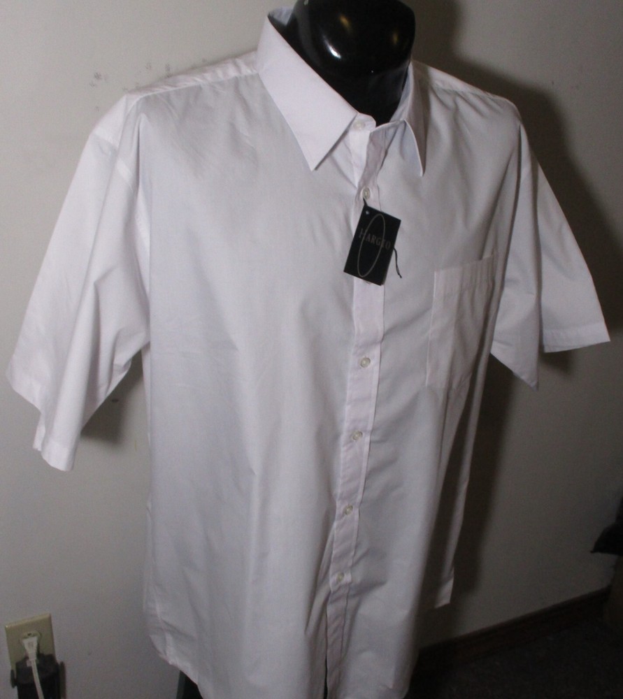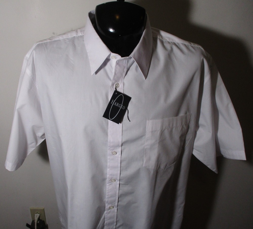 See my EBAY STORE at “SAMTPC53” to view 100’s more of my Men's Shirts!!! Combine Shipping: (on multiple items you pay full price on heaviest item first and then HALF PRICE shipping on ALL other clothes items. Men's Short Sleeve Dress Shirt. Brand: HARGIO. Description: men's cotton HARGIO short sleeve dress shirt, buttons on front, one pocket, see pics Color: White. Size: 18.5 (please see measurements). Measurements: 28" armpit to armpit, 35" shoulder to hem. Material: 35% Cotton, 65% Polyester. Condition: Excellent condition, NWT.