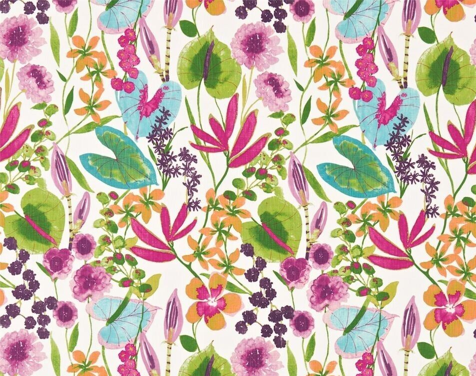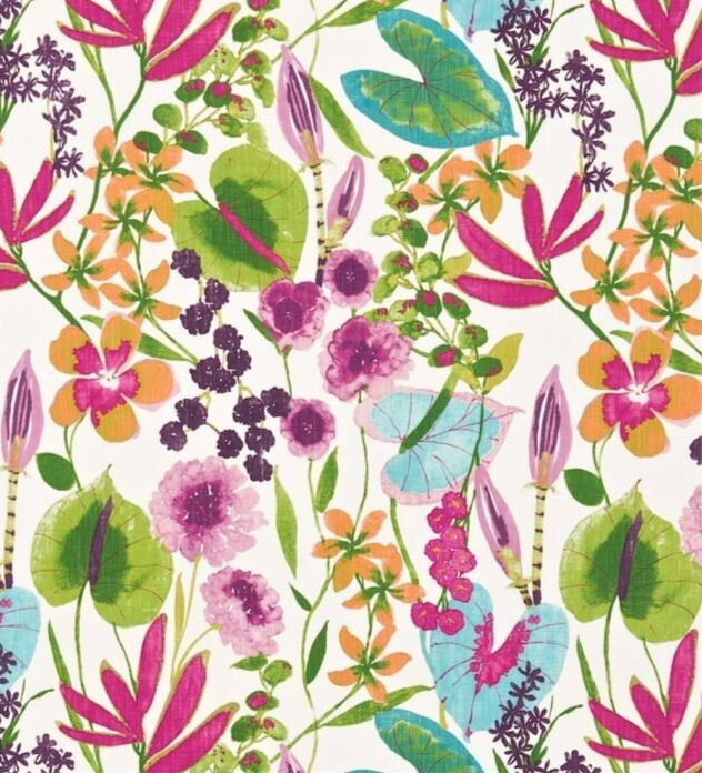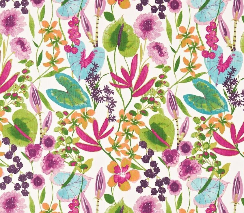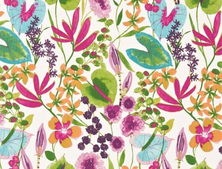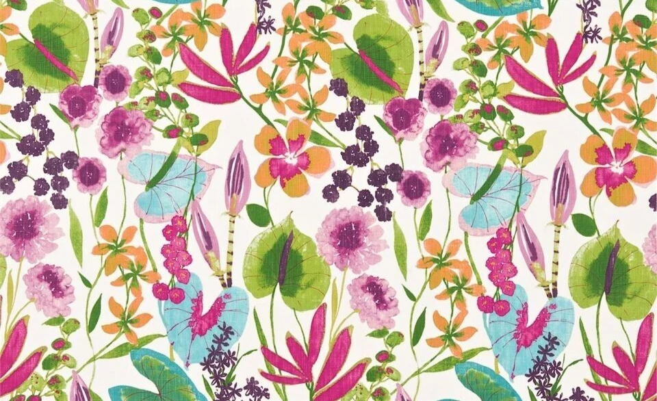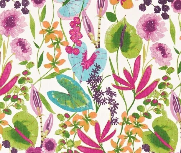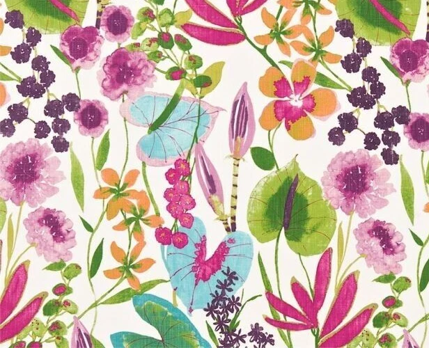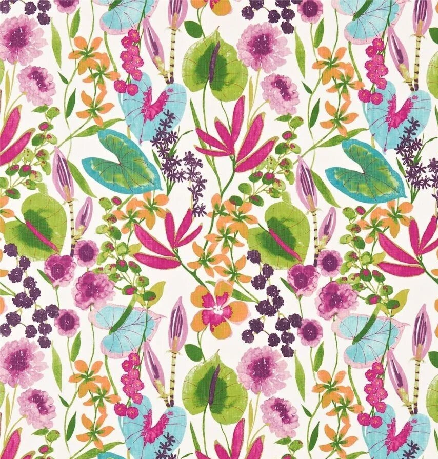 HARLEQUIN FABRIC FROM THE AMAZILIA FABRIC COLLECTION DESIGN IS CALLED NALINA FLAMINGO/PAPAYA AND LOGANBERRY COLOURWAY PATTERN REPEAT 90 cm YOU ARE BUYING A PIECE OF FABRIC APPROXIMATELY 3.25 METRES IN LENGTH 1.37 METRES WIDE. 82% VISCOSE 18% LINEN SUITABLE FOR CURTAINS,BLINDS OR CUSHION COVERS PLEASE NOTE THAT THE MAJORITY OF MY FABRICS WILL COME FOLDED