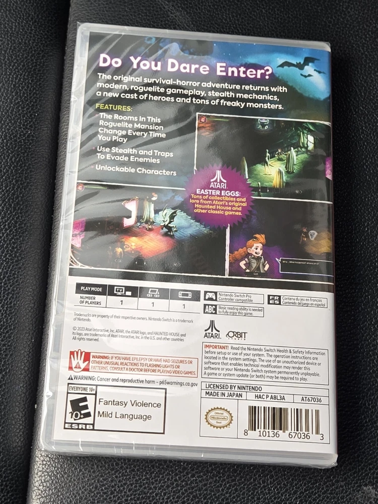 The product is a brand new, factory sealed Nintendo Switch game titled "Haunted House" by Atari, part of the HAUNTED HOUSE video game series. It is designed for players of all ages with an E-Everyone rating. The game falls under the survival horror and action & adventure genres, offering an immersive gameplay experience on the Nintendo Switch platform. This US edition is region free and set to be released in 2023, making it a highly anticipated addition to the HAUNTED HOUSE series for fans of horror-themed video games.