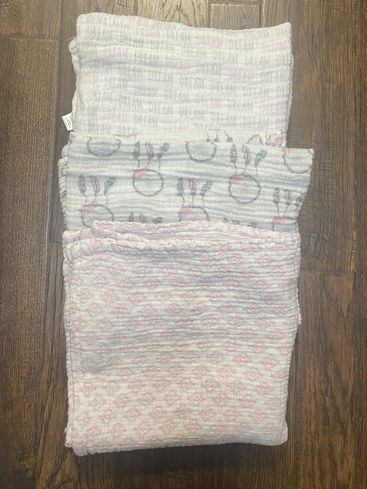 The HB Hudson Baby Muslin Swaddle Blanket Set includes three 46x46 inch blankets with a floral theme in multicolor. The blankets are unisex and not personalized, making them suitable for baby girls. Made by Hudson Baby, these swaddling blankets are a cozy addition to your nursery bedding collection. In great shape, no holes or stains