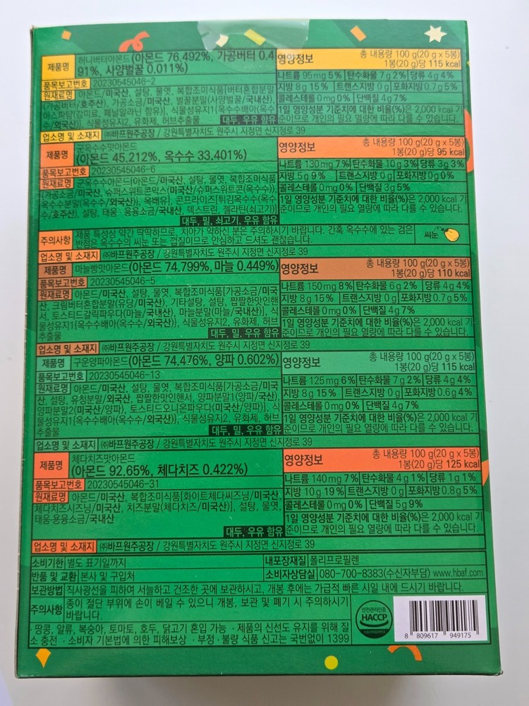 [Product Information] Brand: HBAF (Heon-Ba-Peu) Item: Almond Party Box (Multi-pack) Quantity: 25 Mini Packs (20g per pack) 5 Delicious Flavors Included: Honey Butter Almond Cheddar Cheese Almond Roasted Onion Almond Garlic Bread Almond Baked Corn Almond [Why Choose This?] Perfect for gifts or trying various famous Korean almond flavors. Convenient mini-size packs for easy snacking on the go. Expiration Date: Long shelf life (We always ship the latest products from the market).