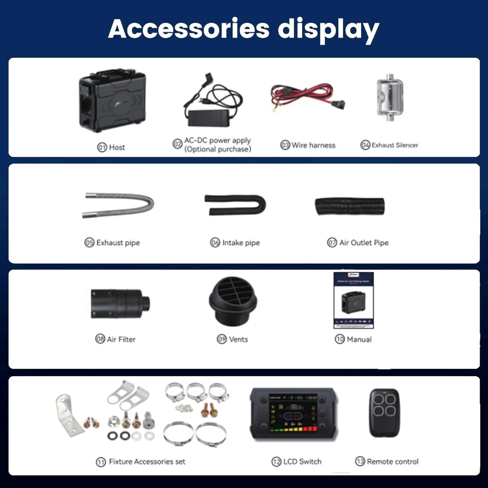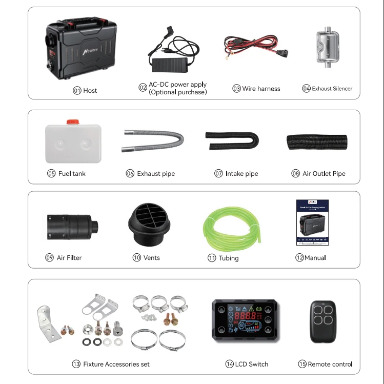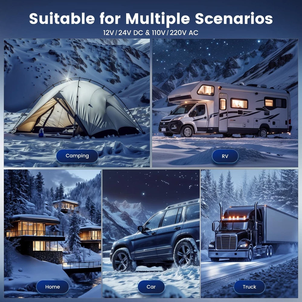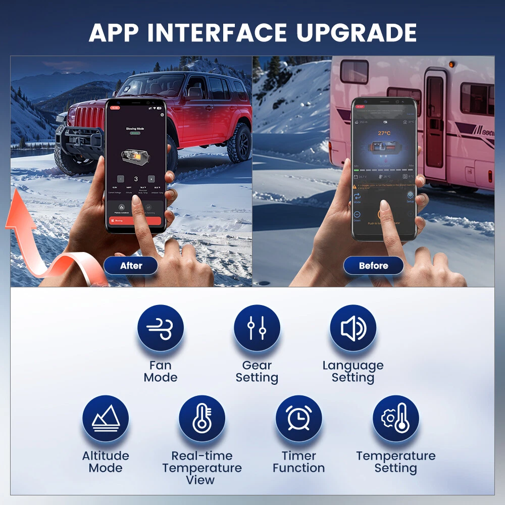 Similar Items Description Features: 1. Enhanced heating efficiency system: Experience enhanced heating efficiency with our advanced aluminum diesel air heater. The improved aluminum body is wider and longer, allowing for rapid warmth as it raises air temperature by 18-36°F. This innovative design reduces exhaust gas temperature by 90 -180°F, ensuring a comfortable environment even in the coldest conditions. Enlarged smoke vents facilitate better combustion, minimizing smoke and carbon buildup. With automatic temperature control adjustment, this system effectively addresses overheating issues, while its fuel consumption rate of just 0.036-0.1 gallons per hour promotes significant fuel savings. 2. Compact Toolbox Design: This portable diesel heater comes in a compact, toolbox-style design with a built-in 6L fuel tank and handle, making it easy to transport, install, and maintain. Ideal for RVs, trucks, and outdoor adventures, its space-saving design ensures hassle-free operation wherever you go. 3. Dual Power Options: This versatile diesel air heater supports both 12V/24V DC and 110V AC power sources, making it suitable for a wide range of vehicles and locations, whether on the road or at home. 4. Smart App Control: Take full control of your heating experience with our Bluetooth app, allowing you to adjust temperatures, set timers, and activate altitude mode for optimal performance at high elevations. Enjoy the convenience of managing your heater directly from your smartphone. 5. bluetooth app remote switch , Smarter - Download the "Hcalory" App( From the instruction manual ), available for iOS and Android devices, which enables user to remotely control the heater via Bluetooth 6.Comprehensive Safety Features: Engineered with multiple safety protections, including over-heating, short-circuit, reverse connection, and over-voltage safeguards, this portable diesel heater ensures safe and reliable operation in any environment. 7. Certified & Safe:Complies with all local, state, and federal safety regulations. Equipped with safeguard safety functions such as automatic shutdown and overload protection for a worry-free experience. Warning: This heater must be exhausted to the outdoors to prevent CO poisoning. Rest easy knowing your heater is designed with your safety in mind, allowing you to focus on your adventures. TB2: Specifications: Brand HCALORY Type All in one Diesel Heater Model TB2-2024 Upgraded Color Black Configuration fuel tank 6L Rated power 5KW-8KW Rated voltage 12V/24V & 110V Fuel consumption 0.14 liters - 0.41 liters/hour Remote control effective distance 50-100 meters Radiator working temperature -40~+50°C Operating temperature of oil pump -40~+40°C Packaged included: 1 x Air Heater Host 1 x LCD Display switch 1x Remote control 1 x Intake pipe 1 x Air Outlet pipe 1 x Exhaust pipe 1x Vent 1 x Air Filter 1x Silencer 1 set Accessories set 1 x AC power adapter(US Plug) 1 x DC battery power cable 1 x User manual Note: 1. Please allow 0.5-1cm differences due to manual measurement. 2. Due to the light and screen difference, the item's color may be slightly different from the pictures. TB1 SE: Specifications: Brand HCALORY Type All in one Diesel Heater Model TB1 SE-2024 Upgraded Color Black Configuration fuel tank 5L Rated power 8KW Rated voltage 12V/24V & 110V Fuel consumption 0.14 liters - 0.41 liters/hour Remote control effective distance 50-100 meters Radiator working temperature -40~+50°C Operating temperature of oil pump -40~+40°C Packaged included: 1 x Air Heater Host 1 x LCD Display switch 1x Remote control 1 x Intake pipe 1 x Air Outlet pipe 1 x Exhaust pipe 1x Vent 1 x Air Filter 1x Silencer 1 set Accessories set 1 x AC power adapter(US Plug) 1 x DC battery power cable 1 x User manual Note: 1. Please allow 0.5-1cm differences due to manual measurement. 2. Due to the light and screen difference, the item's color may be slightly different from the pictures. #divSKUDetail2 Detail Image Payment 1.We accept Payoneer、PayPal、Mastercard、VISA、Google Pay 、American Express etc. 2.All major credit cards are accepted through secure payment processor. 3.Payment must be received within 7 business days of auction closing. 4.We ship to your eBay or payment address. Please make sure your eBay and payment address is correct before you pay. Shipping 1.We ship to your eBay or Paypal address. Please make sure your eBay and Paypal address is correct before you pay. 2.Items will be shipped within 1-3 business day when we received payment. 3.Delivery time depends on destination and other factors;
