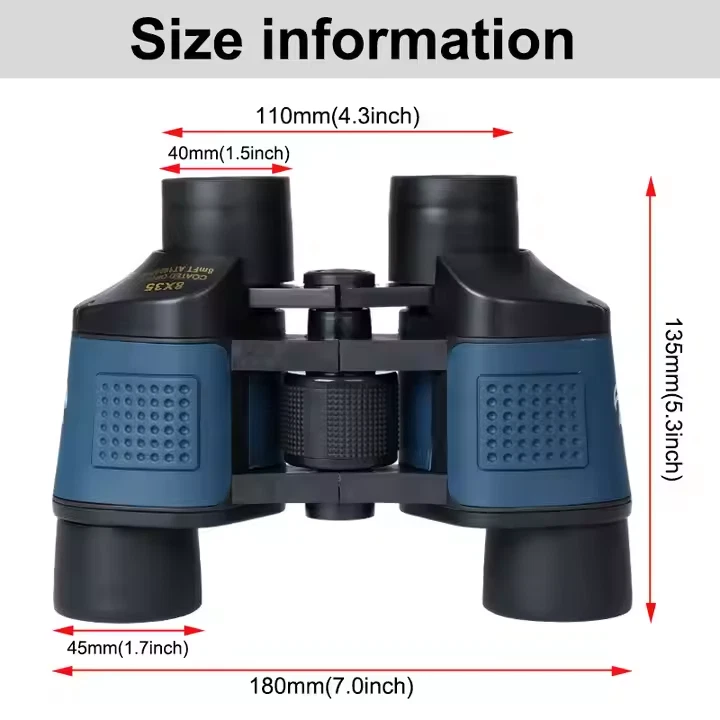 Product Paramenters Place of Origin China Warranty 12 months Color Black + Blue Application Hiking, Camping, Travel, Hunting Keywords Porro Binoculars Telescope Focusing Central focus Magnification 8x Objective len diameter 45mm Eyepieces diameter 40mm Prism system Roof BAK4 Lens coating FMC full broadband multi-layer green film