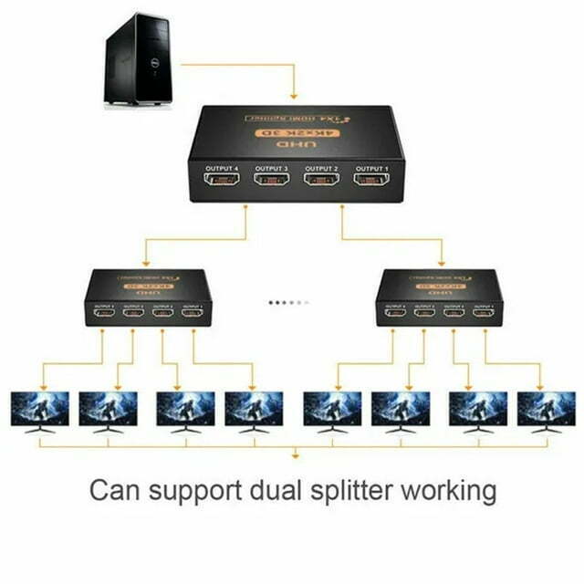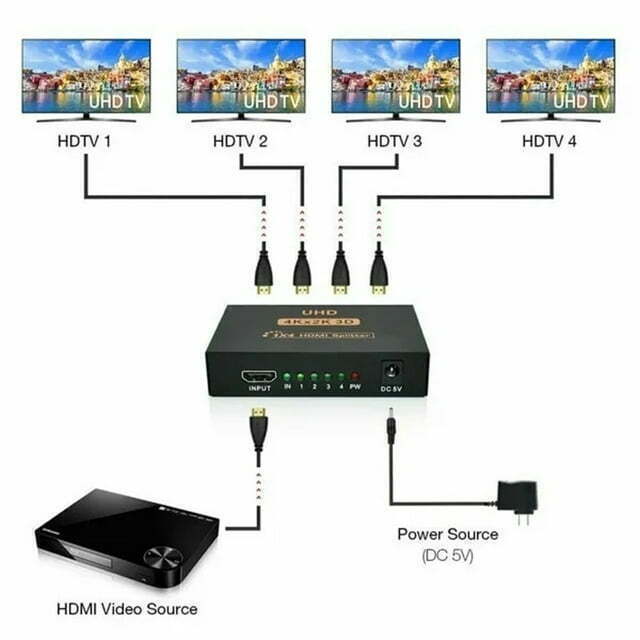 YOU MAY ALSO LIKE HDMI 2.1 Cable High Speed 4K 8K 1080P HDTV 5ft 10ft 15ft 30ft 50ft 65ft PS3 LOT 5.99 USD Free shipping Displayport to Display Port Cable DP Male to Male Cord 4K HD w/Latches 5ft-16ft 5.99 USD Free shipping HDMI to RCA RGB Male AV 3 RCA Video Audio Converter Cable For HDTV DVD Player 5.99 USD Free shipping PS2 HDMI Converter for PlayStation 1/2/3 1080P Video Adapter - HD Quality 9.99 USD Free shipping VGA To HDMI Converter 1080P HD Adapter With Audio Cable For HDTV PC Laptop TV 5.99 USD Free shipping VGA Male to HDMI Female 1080P Output HDTV Audio Video Cable Converter Adapter 8.99 USD Free shipping Specifications: • 5 HDMI Type-A ports • Easily repeat/mirror from one source to two HDMI video display sources • Easily switch from a single HDMI video source to two displays (simultaneously) • Supports 4k x 2k, 3D, 1080P resolution • Supports HDCP pass-through • Supports 12-bit Deep color per channel; maximum of 32-bits across all channels • Supports uncompressed audio such as LPCM • Supports compressed audio such as DTS Digital, Dolby Digital, DTS-HS and Dolby True HD • No power source needed; plug and play functionality • Maximum operating current: 15mA • Dual LEDs to display status Features: [LATEST HDMI SPECIFICATIONS] 4K@60Hz, 1080p@60Hz, 3D, Deep Color, HDCP pass-through, uncompressed and compressed audio formats are all supported. [1 INPUT 4 OUTPUT] Easily repeat/mirror a single HDMI video source to two displays (simultaneously) [POWERED BY HDMI SOURCE OR INCLUDED POWER CABLE] No adapter needed; plug and play functionality. Compatibility: HDTV, Blu-Ray, DVD, Satellite, DVR, Apple TV, Chromecast, Roku, Stick, PS3, PS4, Xbox, Xbox One, Xbox One S, Nintendo Switch, Wii U, Game Capture Cards such as Elgato, AVerMedia and others. Contents: Splitter Adapter 1X4 Charger Cable
