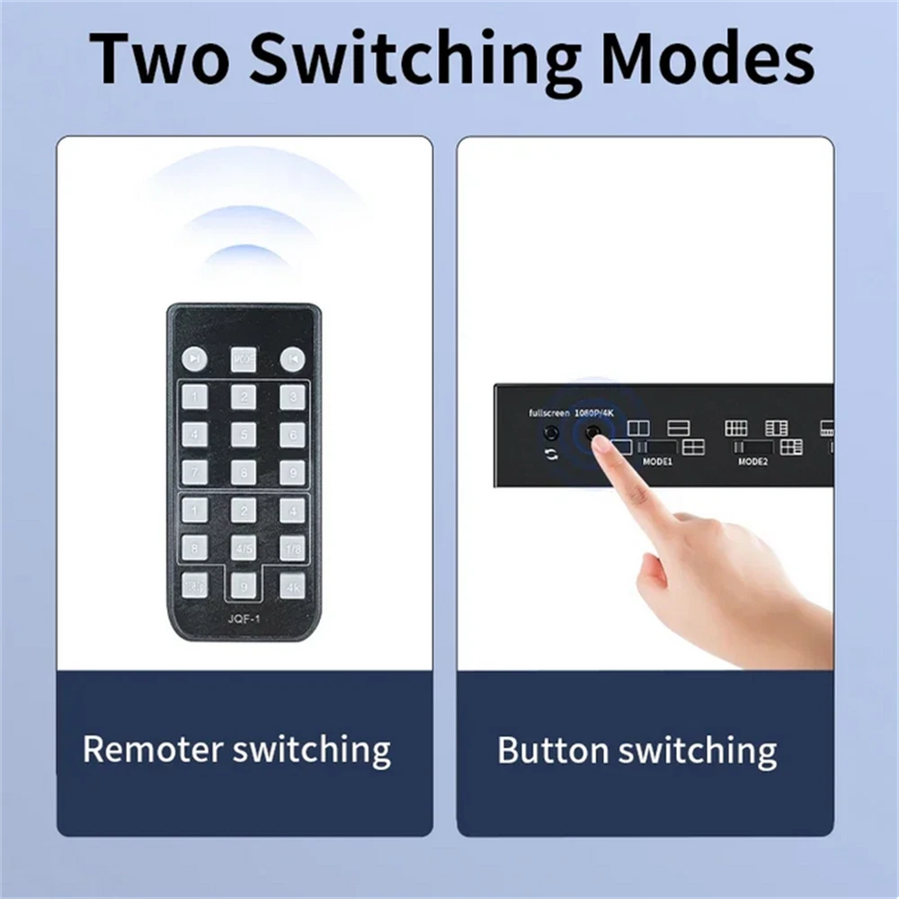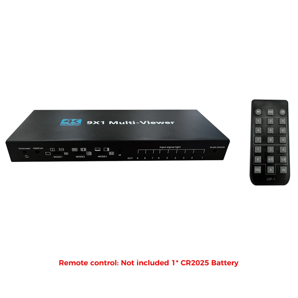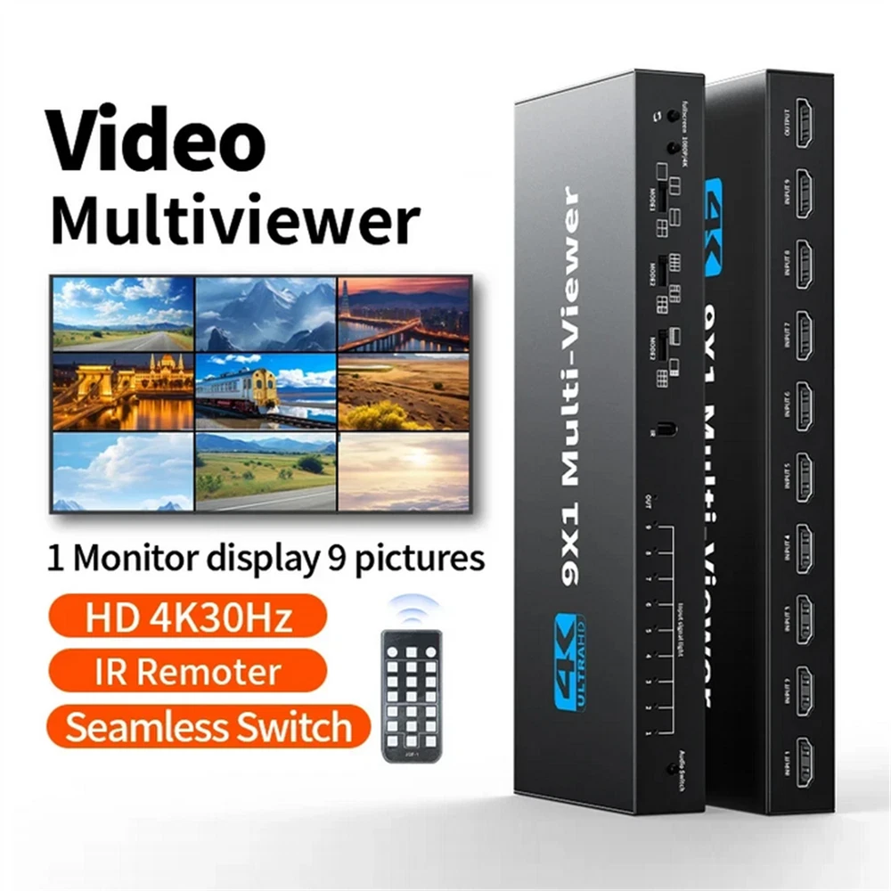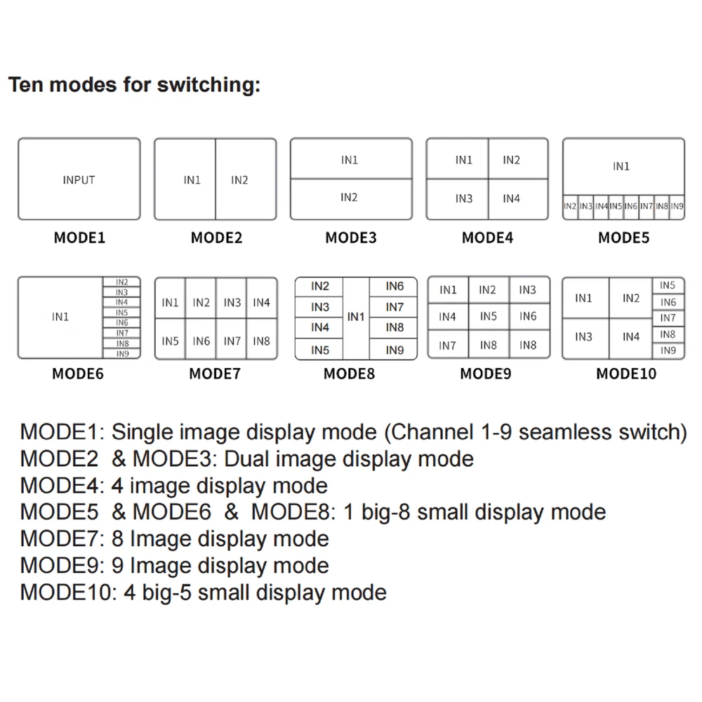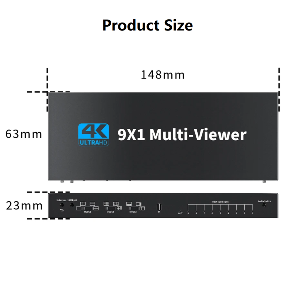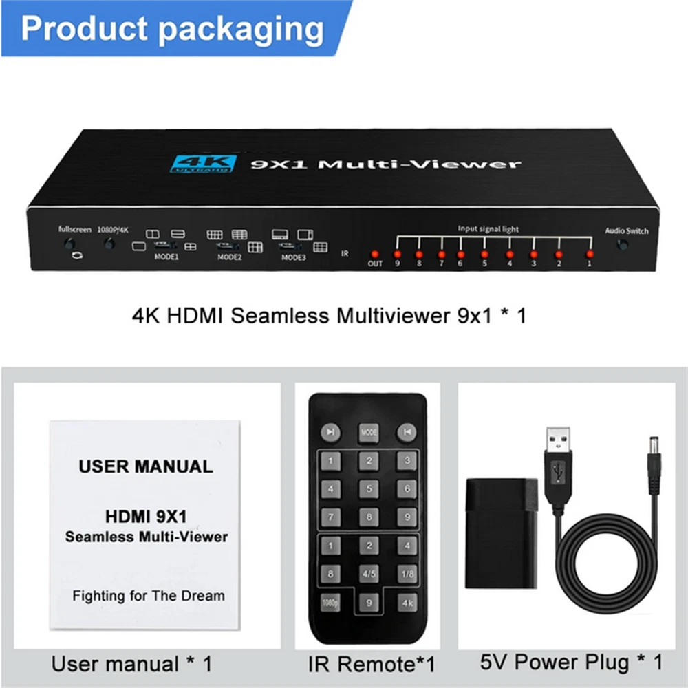 Product Description 4K 30hz 9x1 HDMI-compatible Multiviewer 4K 9 In 1 Out 1080P Screen Multi Viewer HDMI Multi-Viewer Seamless Switch With IR Specifications: Support HDMI resolution: 4K30HZ/1080P/1080i/720p/576p/576i/480p/480i Support video color format: 24bit/30bit/36bit Support audio input format: DTS-HD/Dolby-realHD/Dolby-AC3/DSD Support audio output format: LPCM, PCM2 Max bandwidth: 330Mhz Max bandrate: 10.2Gbps Input/Output TMDS signal: 0.5~1.5V p-p(TTL) Input/Output DDC signal: 5Volts p-p(TTL) Input cable distance: ≤ 3m AWG24 HDMI standard cable Output cable distance: ≤ 3m AWG24 HDMI standard cable Max working current: 5V/0.6A Power supply: DC5V2A Remote control battery: 1*CR2025 Battery (Not included) Operating Temperature range: -15°C ~ +55°C Operating Humidity range: 5~90%RH(No Condensation)) Dimension(L x W x H): 148*63*23mm Features: 1. 10 Ways Viewing Screen: 9X1 Quad MultiView Selector support 10 viewing modes. You could see 9 HDMI input sources screen on one monitor by 10 ways, also can only see only one HDMI input source by full screen 2. HDMI Switch 9 in 1 out: 9 HDMI Input ports, 1 HDMI output port. Support Connect 9 HDMI input device and one HDMI Display device on Switch box, avoid frequently plugging and unplugging on HDMI Display device 3. Remote Control and Button Control: 9x1 Quad Multi-Viewer with function buttons and attached IR remote control. Manual button and remote control both support switching input source, selecting full screen mode or quad modes and switch input source's audio 4. Max up to 4K 30Hz Resolution: HDMI Multiple display Switch box support 3840x2160@30Hz, 1080P@60Hz, 1080i, 720p, 567p, 576i, 480p, 480i, bandrate max to 10.2Gbps, Support Color format 24 bit/30 bit/ 36bit 5. Widely Compatible: HDMI 9X1 Quad Multi-viewer support HDMI 1.4 and HDCP 1.4 and backward Package List: 1x HDMI 9x1 Multi-viewer 1x DC 5V/2A Power Adapter 1x Power Cable 1x User Manual 1x Remote Control(CR2025 Battery Not included) Shipping Returns Contact Us Payment 1. Items sent from US warehouse. 2. Receiving time = Processing time + Shipping time. 3. Pro cessing Time: Around 1-2 business Days. 4. Shipping Time: 3-5 business day. it may have a little delay during some holiday (such as Christmas), any problem, please feel free to contact. 1. 30 days warranty from the purchased date. Please contact us via email before returning the defective item. 2. Our warranty does not extended to any product that are physically damaged or that are not under normal operating conditions as result of misuse or improper installation on the buyer/user's part. 3. Return items should include the original packaging and all accessories. buyers MUST contact us for the returning address. 4. In all cases, buyers pay shipping fees at their own cost to return products for exchange or refund. We will be responsible for the postage of replacements. Refund will be made upon receipt of the returned item. If you have any question, please e-mail us immediately, we will reply you as quickly as possible. We care about our valued customers, and will always try to help you. We accept all verified payment from eBay. Shipping 1. Items sent from US warehouse. 2. Receiving time = Processing time + Shipping time. 3. Pro cessing Time: Around 1-2 business Days. 4. Shipping Time: 3-5 business day. it may have a little delay during some holiday (such as Christmas), any problem, please feel free to contact. Returns 1. 30 days warranty from the purchased date. Please contact us via email before returning the defective item. 2. Our warranty does not extended to any product that are physically damaged or that are not under normal operating conditions as result of misuse or improper installation on the buyer/user's part. 3. Return items should include the original packaging and all accessories. buyers MUST contact us for the returning address. 4. In all cases, buyers pay shipping fees at their own cost to return products for exchange or refund. We will be responsible for the postage of replacements. Refund will be made upon receipt of the returned item. Contact Us If you have any question, please e-mail us immediately, we will reply you as quickly as possible. We care about our valued customers, and will always try to help you. Payment We accept all verified payment from eBay. You may also like 5/16" Line Fuel Filter Replace Part For Mercury For Quicksilver Marine Engine 12.33 USD Housing Case Kit 5-Cell 18650 Replace For DeWalt 20V DCB201/203 Li-Ion Battery 17.63 USD 1.99 USD Wireless Remote Control DC 6V 12V 24V 2CH RF Relay Transmitter 433MHz Universal 15.06 USD New Laser Lens Deck Repair Part For Sony PlayStation 2 PS2 Slim PVR-802W 20.67 USD Gas Fireplace Thermocouple Universal Stove Thermocouple 600mm Grill Fireplace 11.89 USD Hi-Speed USB Port Socket Connector Without Wings For Xbox Series S Console 11.65 USD powered by