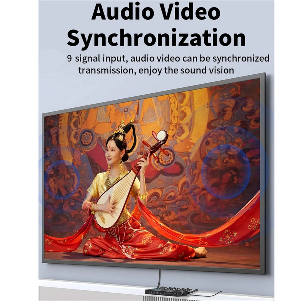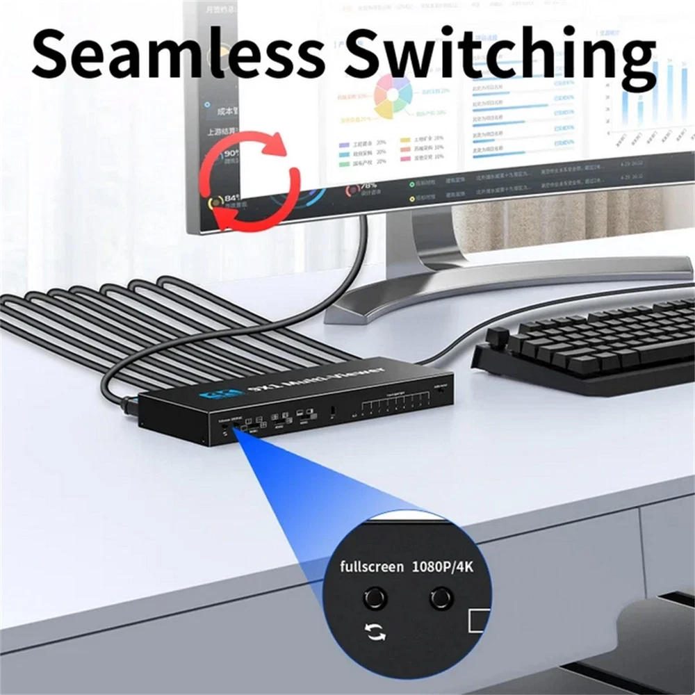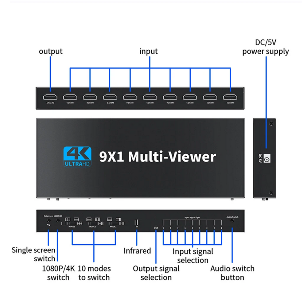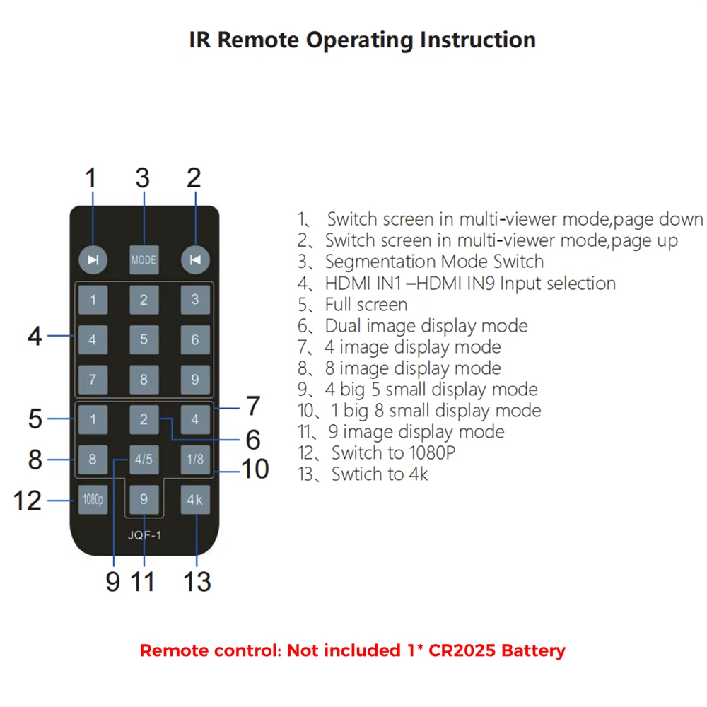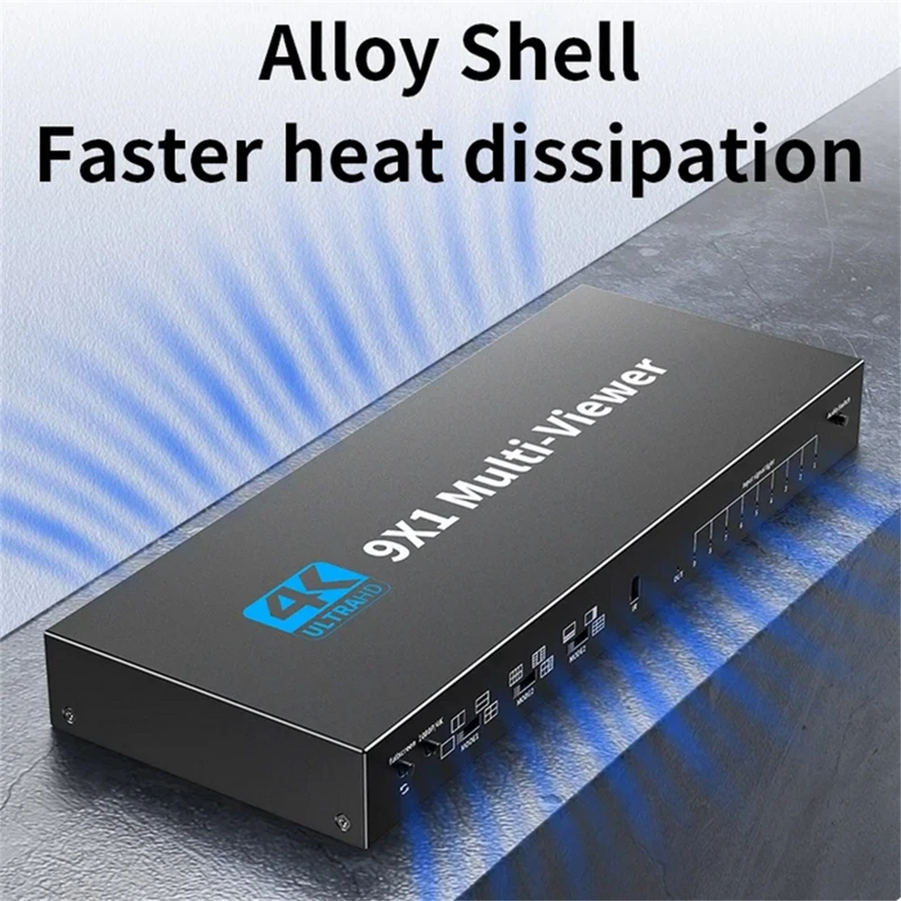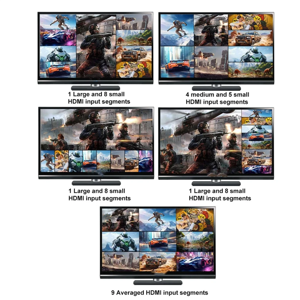 Product Description 4K 30hz 9x1 HDMI-compatible Multiviewer 4K 9 In 1 Out 1080P Screen Multi Viewer HDMI Multi-Viewer Seamless Switch With IR Specifications: Support HDMI resolution: 4K30HZ/1080P/1080i/720p/576p/576i/480p/480i Support video color format: 24bit/30bit/36bit Support audio input format: DTS-HD/Dolby-realHD/Dolby-AC3/DSD Support audio output format: LPCM, PCM2 Max bandwidth: 330Mhz Max bandrate: 10.2Gbps Input/Output TMDS signal: 0.5~1.5V p-p(TTL) Input/Output DDC signal: 5Volts p-p(TTL) Input cable distance: ≤ 3m AWG24 HDMI standard cable Output cable distance: ≤ 3m AWG24 HDMI standard cable Max working current: 5V/0.6A Power supply: DC5V2A Remote control battery: 1*CR2025 Battery (Not included) Operating Temperature range: -15°C ~ +55°C Operating Humidity range: 5~90%RH(No Condensation)) Dimension(L x W x H): 148*63*23mm Features: 1. 10 Ways Viewing Screen: 9X1 Quad MultiView Selector support 10 viewing modes. You could see 9 HDMI input sources screen on one monitor by 10 ways, also can only see only one HDMI input source by full screen 2. HDMI Switch 9 in 1 out: 9 HDMI Input ports, 1 HDMI output port. Support Connect 9 HDMI input device and one HDMI Display device on Switch box, avoid frequently plugging and unplugging on HDMI Display device 3. Remote Control and Button Control: 9x1 Quad Multi-Viewer with function buttons and attached IR remote control. Manual button and remote control both support switching input source, selecting full screen mode or quad modes and switch input source's audio 4. Max up to 4K 30Hz Resolution: HDMI Multiple display Switch box support 3840x2160@30Hz, 1080P@60Hz, 1080i, 720p, 567p, 576i, 480p, 480i, bandrate max to 10.2Gbps, Support Color format 24 bit/30 bit/ 36bit 5. Widely Compatible: HDMI 9X1 Quad Multi-viewer support HDMI 1.4 and HDCP 1.4 and backward Package List: 1x HDMI 9x1 Multi-viewer 1x DC 5V/2A Power Adapter 1x Power Cable 1x User Manual 1x Remote Control(CR2025 Battery Not included) Shipping Returns Contact Us Payment 1. Items sent from US warehouse. 2. Receiving time = Processing time + Shipping time. 3. Pro cessing Time: Around 1-2 business Days. 4. Shipping Time: 3-5 business day. it may have a little delay during some holiday (such as Christmas), any problem, please feel free to contact. 1. 30 days warranty from the purchased date. Please contact us via email before returning the defective item. 2. Our warranty does not extended to any product that are physically damaged or that are not under normal operating conditions as result of misuse or improper installation on the buyer/user's part. 3. Return items should include the original packaging and all accessories. buyers MUST contact us for the returning address. 4. In all cases, buyers pay shipping fees at their own cost to return products for exchange or refund. We will be responsible for the postage of replacements. Refund will be made upon receipt of the returned item. If you have any question, please e-mail us immediately, we will reply you as quickly as possible. We care about our valued customers, and will always try to help you. We accept all verified payment from eBay. Shipping 1. Items sent from US warehouse. 2. Receiving time = Processing time + Shipping time. 3. Pro cessing Time: Around 1-2 business Days. 4. Shipping Time: 3-5 business day. it may have a little delay during some holiday (such as Christmas), any problem, please feel free to contact. Returns 1. 30 days warranty from the purchased date. Please contact us via email before returning the defective item. 2. Our warranty does not extended to any product that are physically damaged or that are not under normal operating conditions as result of misuse or improper installation on the buyer/user's part. 3. Return items should include the original packaging and all accessories. buyers MUST contact us for the returning address. 4. In all cases, buyers pay shipping fees at their own cost to return products for exchange or refund. We will be responsible for the postage of replacements. Refund will be made upon receipt of the returned item. Contact Us If you have any question, please e-mail us immediately, we will reply you as quickly as possible. We care about our valued customers, and will always try to help you. Payment We accept all verified payment from eBay. You may also like 5/16" Line Fuel Filter Replace Part For Mercury For Quicksilver Marine Engine 12.33 USD Housing Case Kit 5-Cell 18650 Replace For DeWalt 20V DCB201/203 Li-Ion Battery 17.63 USD 1.99 USD Wireless Remote Control DC 6V 12V 24V 2CH RF Relay Transmitter 433MHz Universal 15.06 USD New Laser Lens Deck Repair Part For Sony PlayStation 2 PS2 Slim PVR-802W 20.67 USD Gas Fireplace Thermocouple Universal Stove Thermocouple 600mm Grill Fireplace 11.89 USD Hi-Speed USB Port Socket Connector Without Wings For Xbox Series S Console 11.65 USD powered by