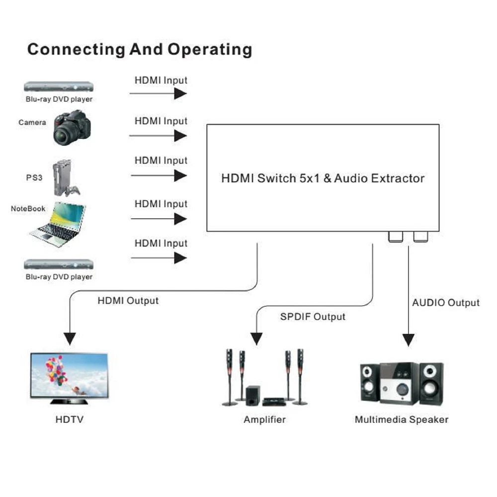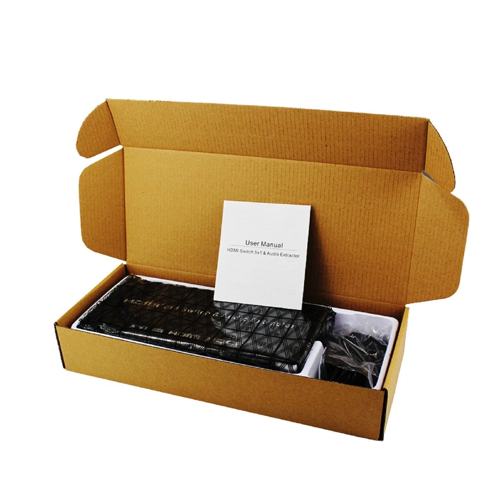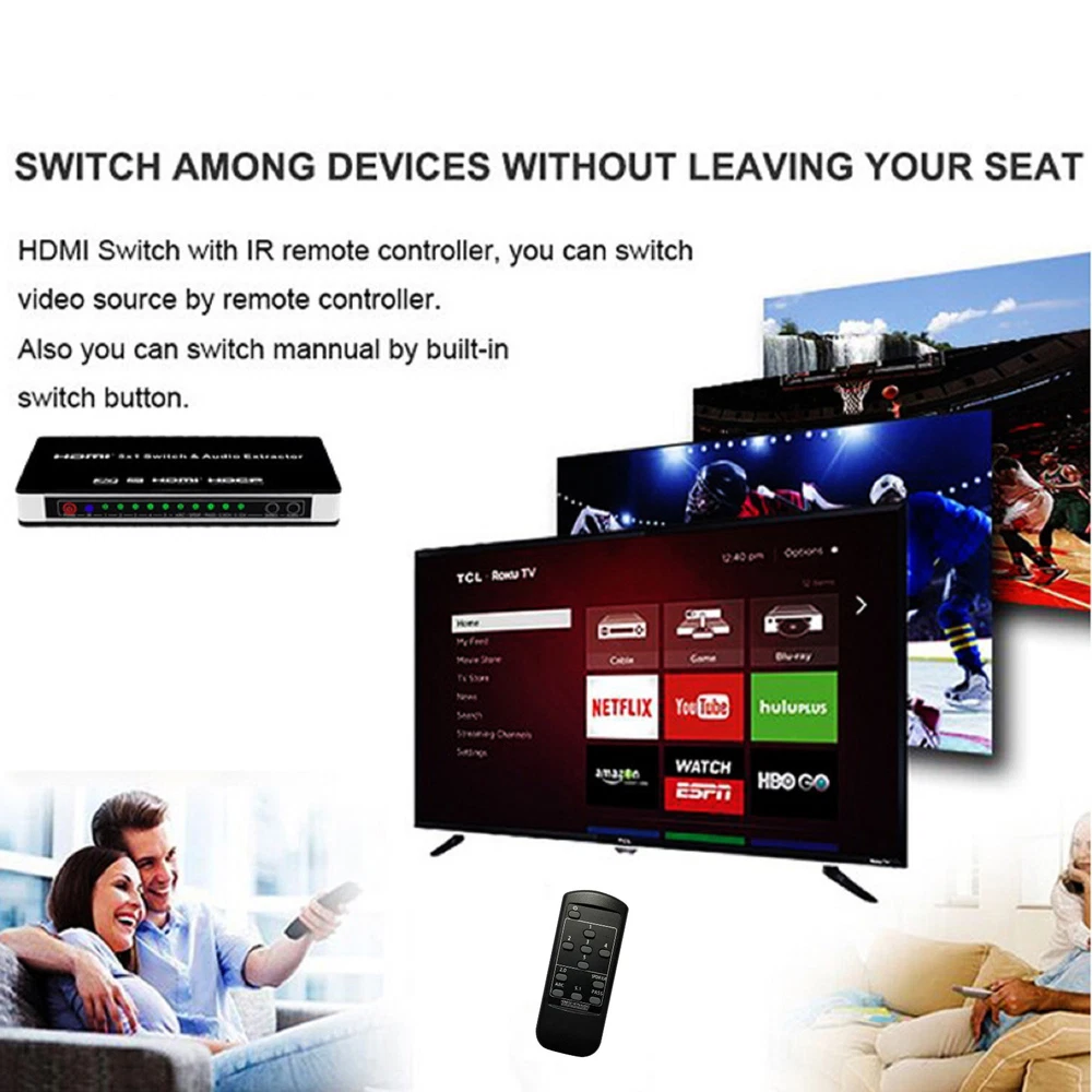 SAFE & SECURE SHOPPING 100% SATISFACTION GUARANTEED FAST SHIPPING HDMI Switch 5 in 1 out Port Switcher w/ Remote Control Power For PS4 PS5 Xbox m Product Description 4K 3D 5x1 HDMI Switch 5 in 1 out Switcher with Audio Extractor ARC for PS4 PS5 Xbox TV Box Laptop PC To TV Monitor Specifications: Video and AudioHDMI resolution: Ultra HD 4K2K max; 3D 1080p/24 max Support video color format: 36-bit Deep Color all channels maximum Audio output: HDMl pass-through up to 7.1CH,Toslink output up to 5.1 ch,RCA L/Routput stereo audio Max bandwidth per channel: 300MHz Max baud rate per display: 9.95Gbps Input/Output TMDS signal: 0.5~1.5v p-p(TTL) Input/Output DDC signal: 5V p-p(TTL) lnput cable distance: <15m 24AWG HDMI high speed Cable at 1080P@24bit 60Hz Output cable distance: <15m 24 AWG HDMI high speed Cable at1080P@24bit 6OHz Environmental Operating Temperature range: 5°F to 131°F/-15°C to 55℃ Operating Humidity range: 5% to 90% RH(No Condensation) Power supply: DC5V1A Features: lnput: HDMI x 5. Output: HDMlx 1,Toslink x 1, Stereo RCAx 1.HDMI version: HDMI 1.4, HDCP1.4. Supports Ultra HD 4Kx2K@30Hz.Supports Full HD. supports 3D. Supports 12-bit Deep Color per channel, maximum 36-bit all channels.Supports 3.0Gbps TMDS/300MHz pixel clock rate per channel, maximumtotal TMDS throughput is 9.95Gbps. supports uncompressed audio such as LPCM. Supports compressed audio such as DTS Digital, Dolby Digital, DTS-HD,and Dolby TrueHD. Supports HDMl pass-through. supports up to 7.1CH digital surround on HDMl output. Supports up to 5.1CH digital surround on HDMl or Toslink output.Supports up to 2.0 channel analog stereo on Stereo output. Supports Standard Audio,DSD Audio, and HD(HBR)Audio.supports ARC(Audio Return Channel). Packaging content: 1x HDMI Switch 5x1& Audio Extractor 1x Power Adapter 1x Remote Control(Not Included 2*AAA Batteries) 1x User Manual Copyright © 2022 Tongtool