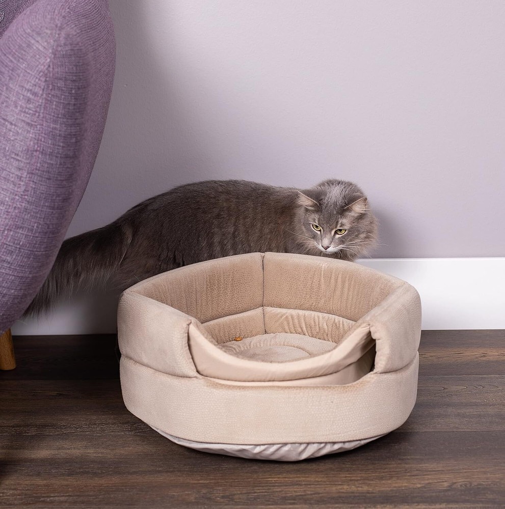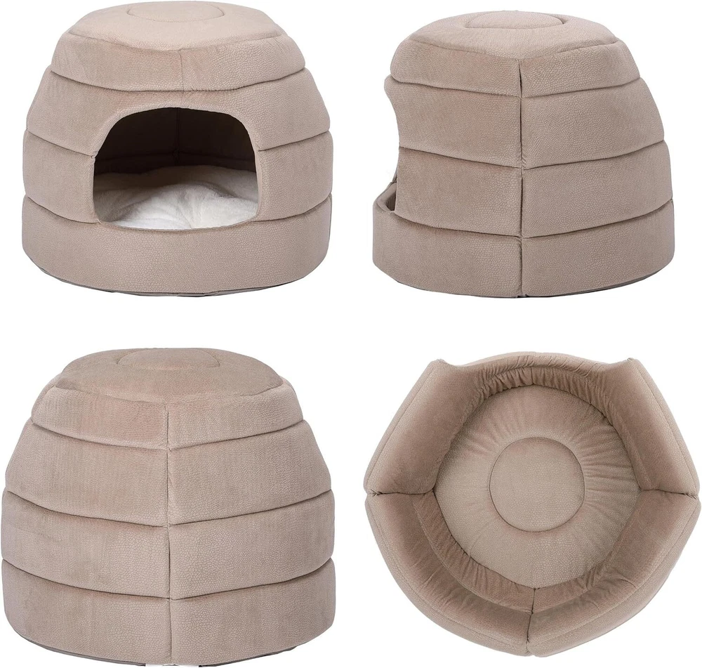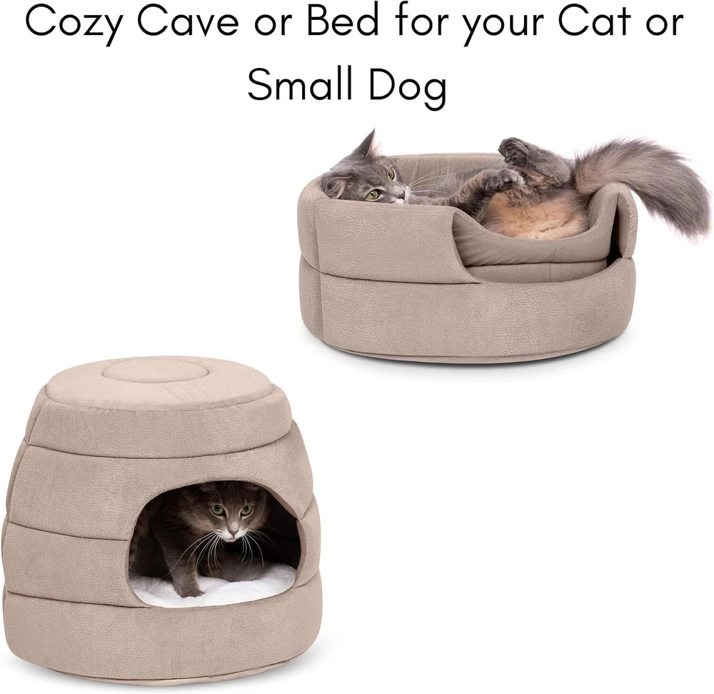 Product Description COMFY & COZY: designed with super soft polyester fabric allowing your feline or pup to sleep in ultimate comfort MULTI-FUNCTIONAL PET BED or CAVE: 2-in-1 foldable design can be used as a cozy, pop up cave or flattened into a bed with plush insert DURABLE BED: every part of the 2-in-1 pet bed is made with high-quality materials and stitched by experts to ensure your furry friend will rest in comfort for years to come KEEPS IT SHAPE: high elasticity foam allows the pet cave to keep its shape after continuous use as a pet bed FITS CATS or SMALL DOGS UP 12 LBS. COLOR: Beige DIMENSIONS: CAVE: 15” Width x 15” Length x 13" Height. BED: 15” Width x 15” Length x 6" Height. Weight 1.3 lbs. FITS CATS or SMALL DOGS UP TO 12 lbs. Pet Bed Pet Bed or Cove The H&E Pet Bed or Cove is designed with super soft polyester fabric allowing your feline or pup to sleep in ultimate comfort. This cove has a 2-in-1 foldable design, which can be used as a cozy, pop up cave or flattened into a bed with plush insert. This pet bed is made with high-quality materials and stitched by experts to ensure your furry friend will rest in comfort for years to come. The high elasticity foam allows the pet cave to keep its shape after continuous use as a pet bed. This bed is perfect for small cats or dogs and comes in both a small and medium size. Keep Your Pet Comfortable & Happy Comfy & Cozy Designed with super soft polyester fabric, which provides ultimate comfort for your small pets. Durable Made with high-quality materials and stitched by experts to ensure your furry friend will rest in comfort for years to come. Keeps Shape The high elasticity foam allows the pet cave to keep its shape after continuous use as a pet bed. Multi-Functional 2-in-1 foldable design can be used as a cozy, pop up cave or flattened into a bed with plush insert.
