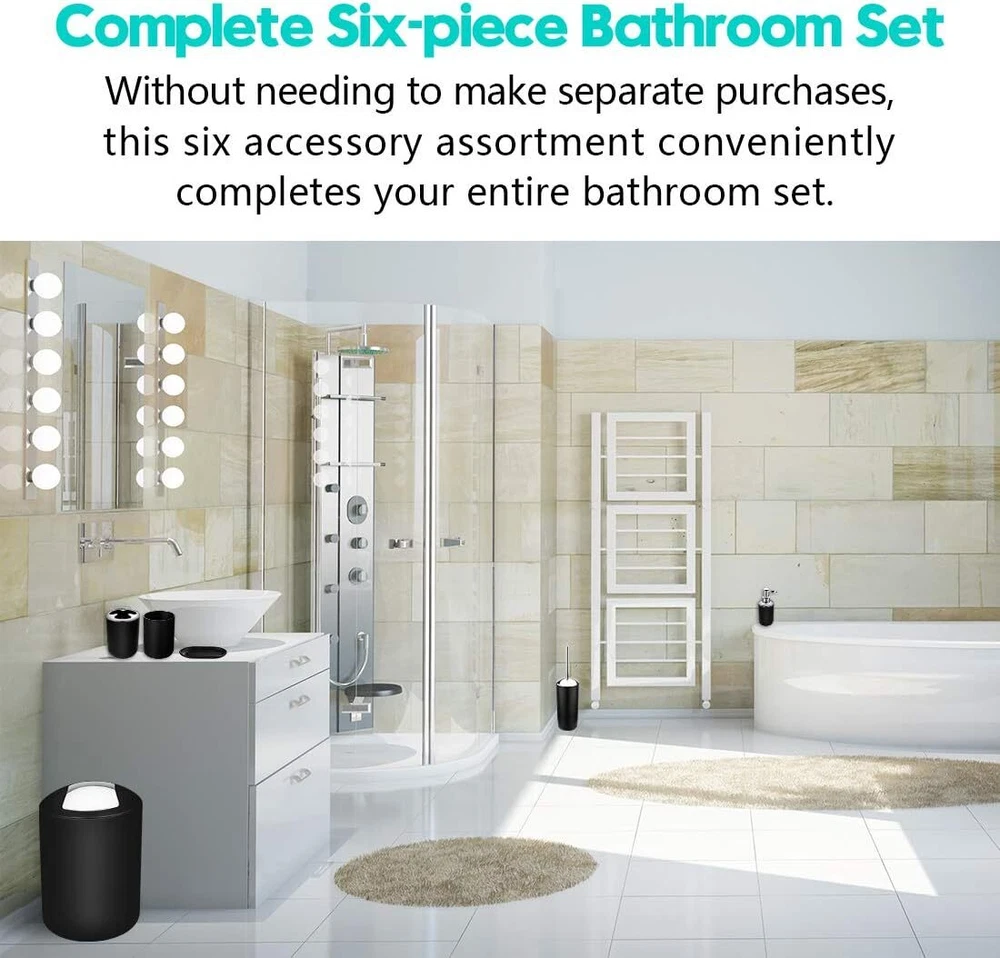 Set Includes :1 Soap Dispenser, 1 Toothbrush Holder, 1 Toothbrush Cup, 1 Soap Dish, 1 Toilet Brush Holder,1 Trash Can Elegant Design : take your bathroom decor to stylish new heights with this bathroom accessories set, very stunning and a great touch of extra elegance to the bathrooms, perfect for giving as a gift for housewarming or a wedding Fully Functional Completed Set : A completed bathroom accessory set which equips everything you will need to organize your toiletries. Toothbrush holder features 3 - holed openings, 2 small ones allow you to keep your toothbrushes and 1 larger hole to place slim toothpaste, making brushing teeth in one grab Durable And Amazing Quality : This 6-Piece Bathroom Accessory Set is made of durable plastic that can outlast competing products. It’s also ideal for kids' bath for its durability and not easy to break like ceramic set. Our high quality plastic bath accessories will resist to constant use, keeping their look just as elegant and new over time Premium Quality Liquid Soap Dispenser Pump : We know how frustrating it can be to use a flimsy pump that leaks or just does not work. No matter how your bathroom set looks like, a bad pump can ruin the experience. That’s why we included a hard plastic pump for the liquid soap dispenser in this set