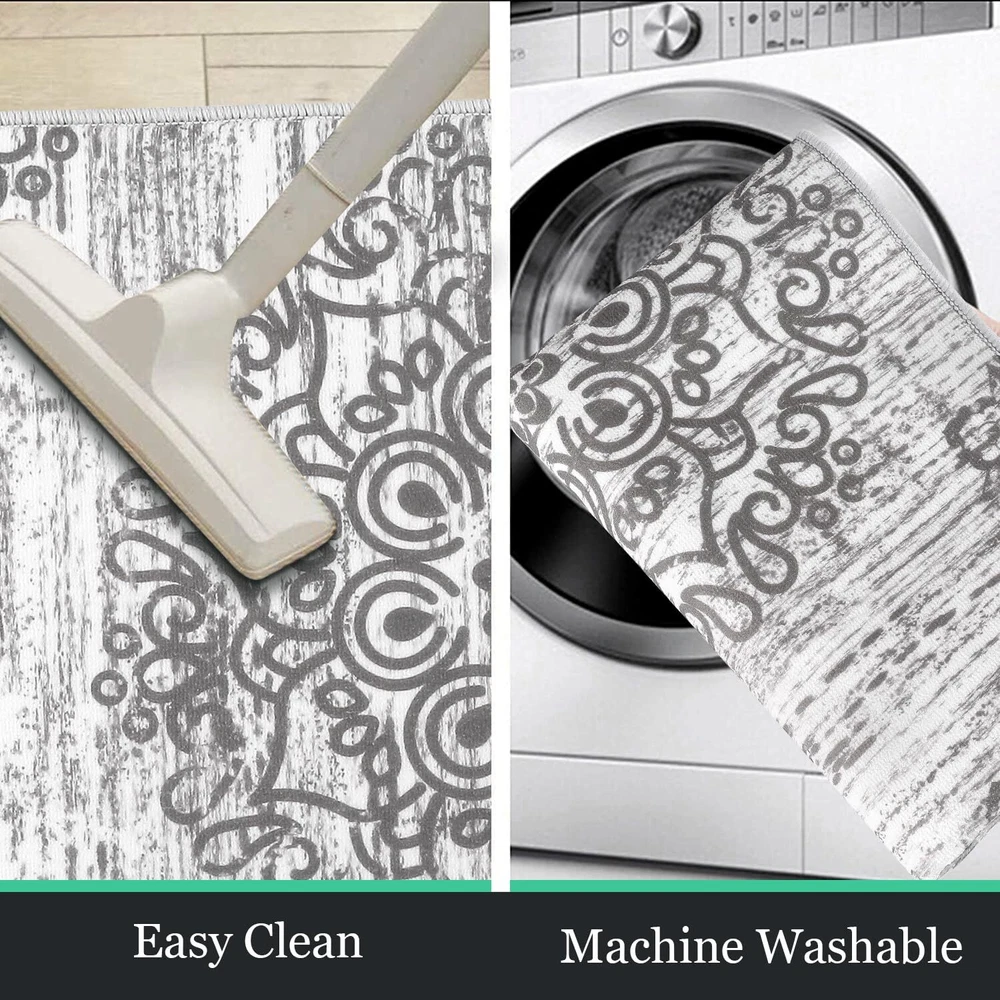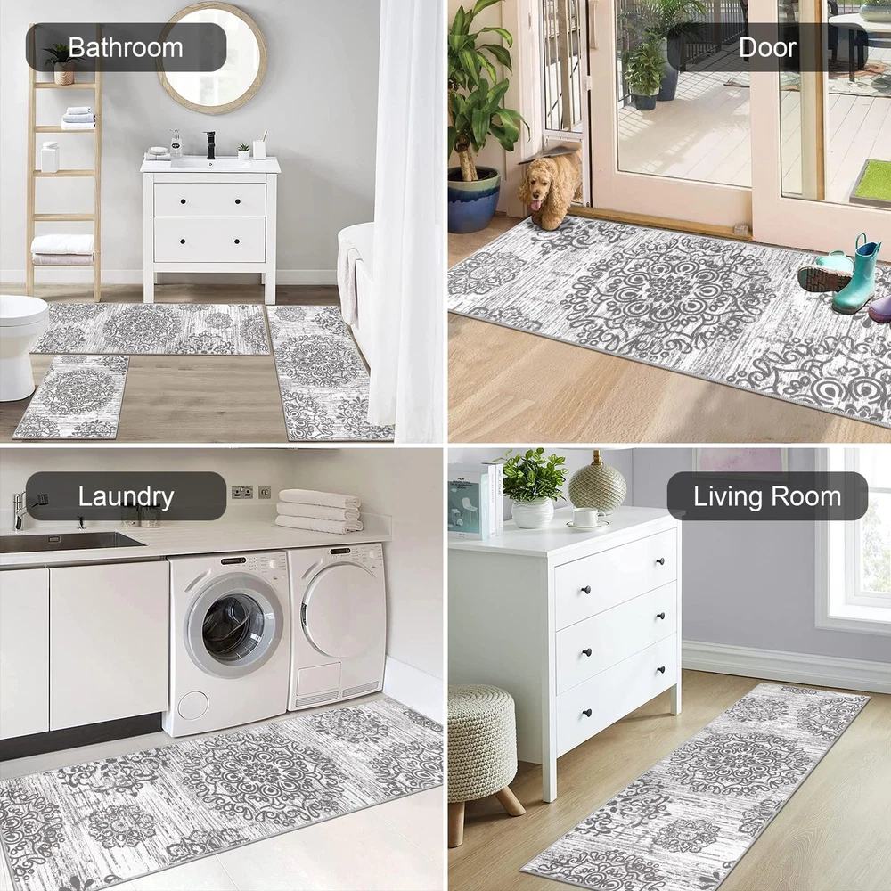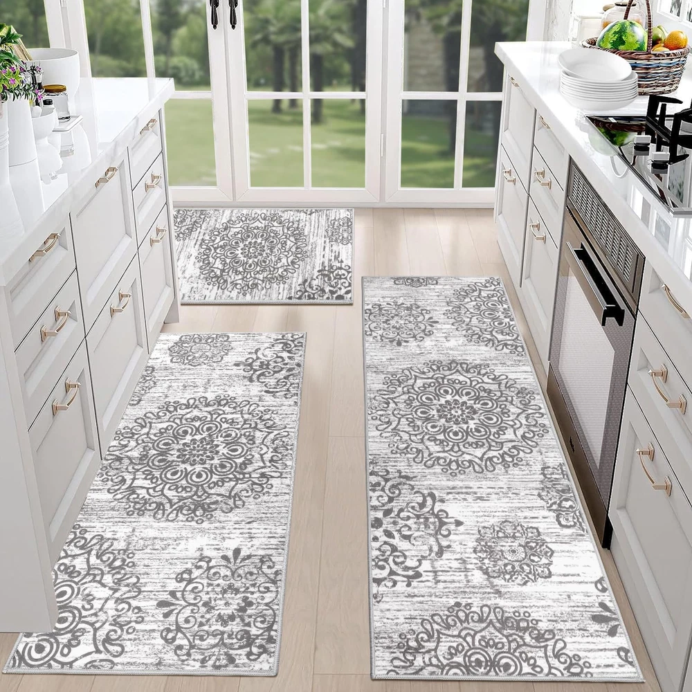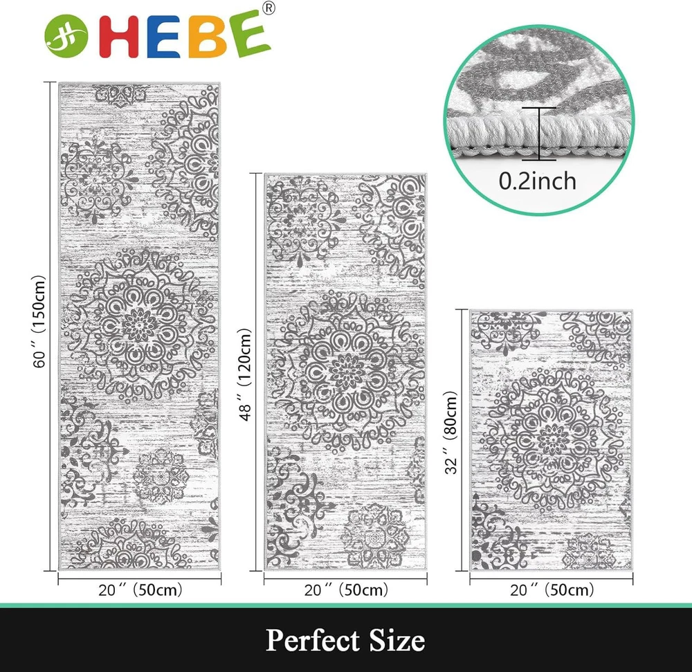 Farmhouse Kitchen Rugs Sets 3 Piece with Runner: HEBE boho kitchen rugs set include 3 piece kitchen mats for floor, which measures 20"x32"+20"x48"+20"x59",perfect size for your kitchen floor, also suitable as entryway rug, laundry room rug, bathroom mat Non Slip Kitchen Rug and Mat Sets: Boho kitchen floor mat set is made of 0.2" high-quality polyester and come with premium TPR & cotton non skid backing,can be effective to avoid slipping and scratching the floor, keep your home clean and dry Washable Kitchen Rugs Set: Our washable rug can be routinely cleaned with a regular vacuum cleaner or machine washable for a deep clean.The farmhouse area rugs for kitchen has been tested for many machine washes, will not fade, will not deform Durable kitchen Rugs and Runners: Our kitchen area rug is made of premium polyester fabric, which is very durable. Design with retro floral elements,Classic printing and dyeing process, non-fading and non-shrink, protect your kitchen floor dry and clean Widely Used Boho Kitchen Carpet: The kitchen mat widely used as kitchen sink rug, laundry room rug runner, indoor door mat and bathroom rugs; also can be great gift for your families and friends in Christmas, Thanksgiving, Halloween and New Years