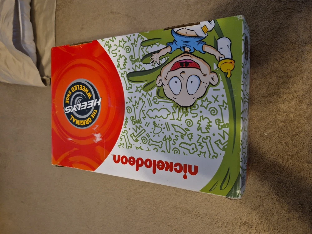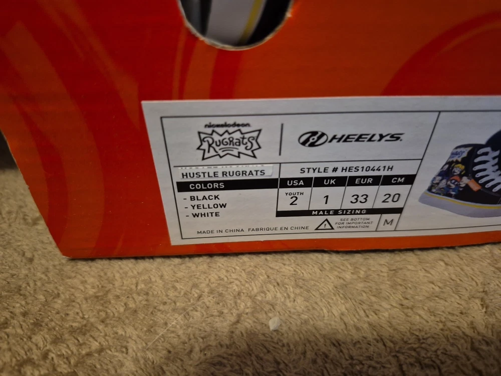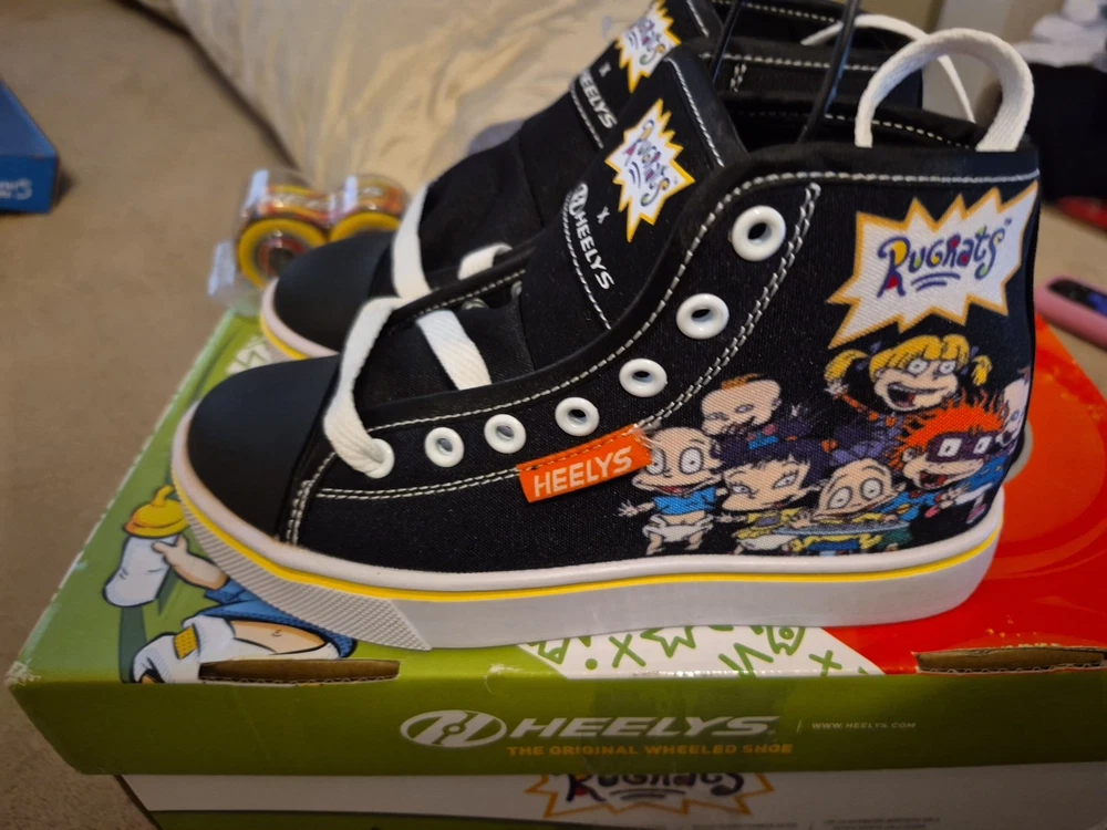 The product is a pair of Heelys in youth size 2 designed for unisex kids. These black, white, and purple sneakers feature wheels in the sole that allow the wearer to skate around. The model is HEELYS Pro 20 and the design is inspired by the character family Rugrats. Perfect for active kids who enjoy both shoes and skates in one versatile product.