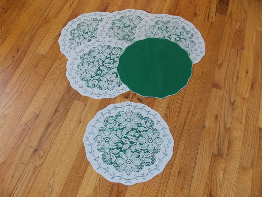 I PURCHASE MY LACE DIRECTLY FROM THE FACTORY, THESE MAY BE CONSIDERED SECONDS HERITAGE LACE GREEN AND WHITE SET 6 CHRISTMAS POINSETTIA PLACEMATS 15 BY 13 INCHES NEW WITHOUT TAGS I CHECK MY LACE FOR FLAWS, IF I NOTICE A FLAW I NOTE IT HERE IN THE DESCRIPTION, IF I MISS A FLAW IT IS NOT INTENTIONAL PLEASE MAKE SURE OF YOUR SIZE AND COLOR PRIOR TO PURCHASE AS I DO NOT ACCEPT RETURNS I TRY TO GET THE MEASUREMENTS WITHIN A ½ INCH PLEASE MAKE SURE YOU KNOW YOUR MEASUREMENT PRIOR TO PURCHASE ALL PHOTOGRAPHS ARE OF THE ORIGINAL ITEM UNLESS OTHERWISE STATED. The item(s) in this ad have been described to the best of my ability. If you have any questions feel free to ask, I will try my best to give you an answer. Ebay strives to maintain a safe and secure buying atmosphere, and I try also to give the best service. 5 star feedback is very important, if you have a problem with your item please give me the opportunity to correct the situation before leaving neutral or negative feedback. I will leave good feedback for you, and hopefully you are satisfied and will do the same. Thank you for your business, without you I wouldn’t be successful. Placing a bid on my items constitutes an agreement that you are accepting the item as described. Payment must be received within 3 days of auction close. Payment by Pay Pal accepted. I usually ship within 1 business day of receiving cleared payment International buyers will pay actual full shipping fees.
