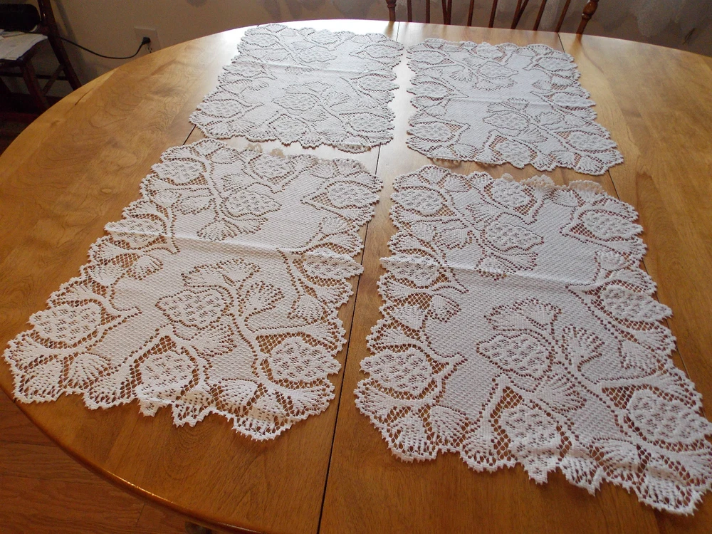 I PURCHASE MY LACE DIRECTLY FROM THE FACTORY, THESE MAY BE CONSIDERED SECONDS HERITAGE LACE WHITE HANGING STRAWBERRIES SET OF 4 PLACEMATS MEASURES 20W BY 15L NEW WITHOUT TAGS I CHECK MY LACE FOR FLAWS, IF I NOTICE A FLAW I NOTE IT HERE IN THE DESCRIPTION, IF I MISS A FLAW IT IS NOT INTENTIONAL PLEASE MAKE SURE OF YOUR SIZE AND COLOR PRIOR TO PURCHASE AS I DO NOT ACCEPT RETURNS I TRY TO GET THE MEASUREMENTS WITHIN A ½ INCH ALL PHOTOGRAPHS ARE OF THE ORIGINAL ITEM UNLESS OTHERWISE STATED. The item(s) in this ad have been described to the best of my ability. If you have any questions feel free to ask, I will try my best to give you an answer. Ebay strives to maintain a safe and secure buying atmosphere, and I try also to give the best service. 5 star feedback is very important, if you have a problem with your item please give me the opportunity to correct the situation before leaving neutral or negative feedback. I will leave good feedback for you, and hopefully you are satisfied and will do the same. Thank you for your business, without you I wouldn’t be successful. Placing a bid on my items constitutes an agreement that you are accepting the item as described. Payment must be received within 3 days of auction close. Payment by Pay Pal accepted. I usually ship within 1 business day of receiving cleared payment International buyers will pay actual full shipping fees.