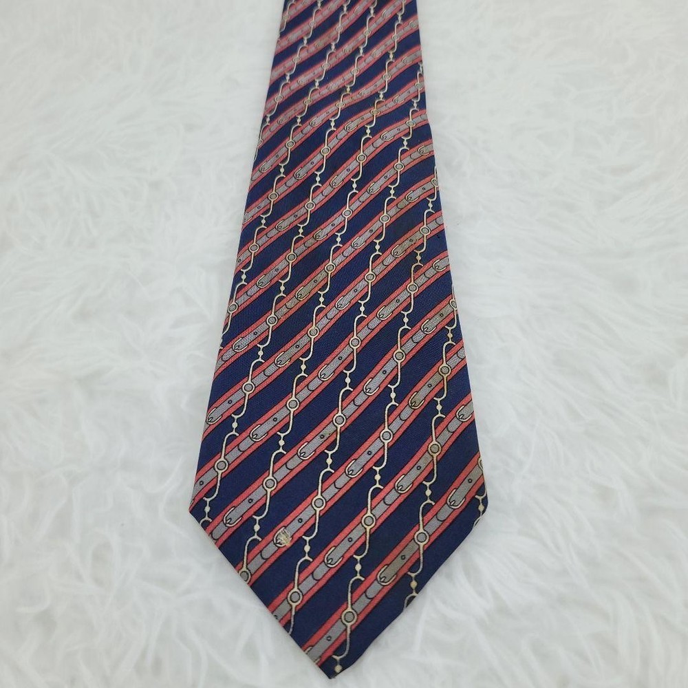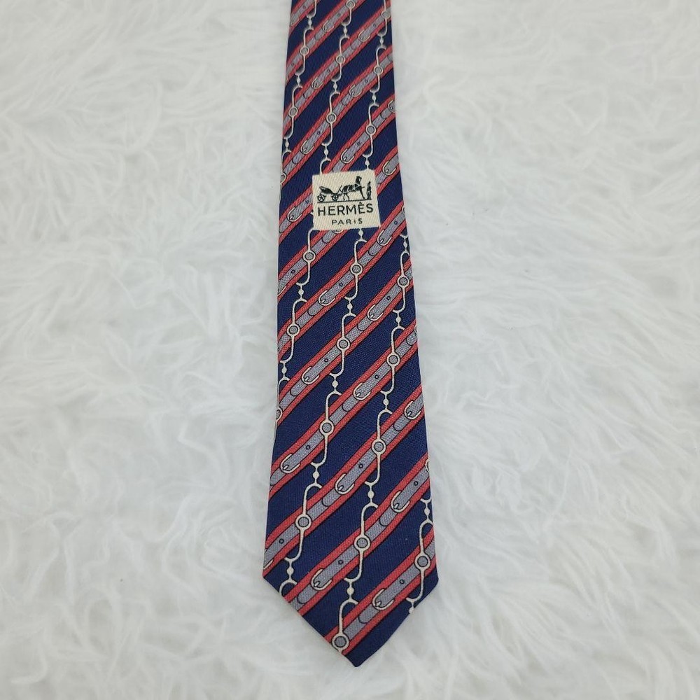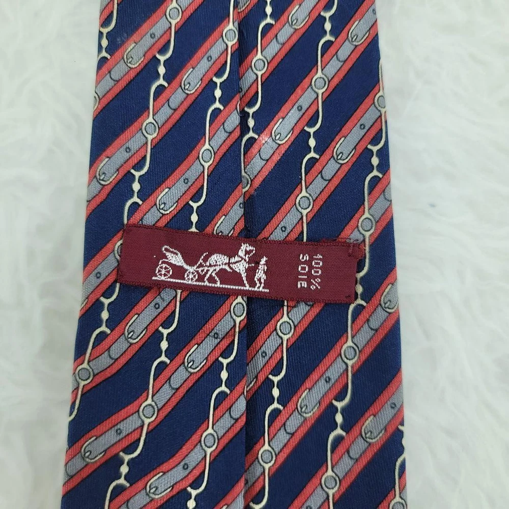This Hermes tie is absolutely stunning! The navy with red and silver belt pattern looks so elegant. It arrived in great used condition as described and fits perfectly. Such an amazing find for the price!
