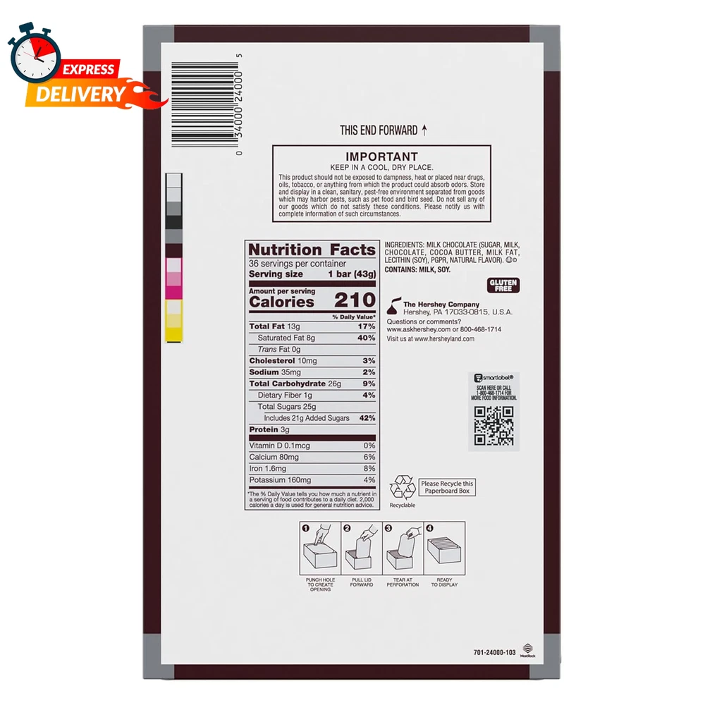 Store New Arrivals Add to Favorite View Feedback Contact HERSHEY'S Milk Chocolate Candy Bars, Halloween Candy, 1.55 Oz (36 Count) Description Item model number 20034000240009 Is Discontinued By Manufacturer No Product Dimensions 2.81 x 8.75 x 1.26 inches; 1.59 ounces Chocolate Type Milk Flavor Name Milk Chocolate Units 55.8 Ounce Occasion Halloween Flavor Milk Chocolate Manufacturer The Hershey Company Item Form Bar Brand HERSHEY'S Size 1.55 Ounce (Pack of 36) Contains thirty six (36) 1.55-ounce HERSHEY'S Milk Chocolate Candy Bars in a bulk box Elevate your candy dish, gift giving and s'mores games to the next level with HERSHEY'S classic milk chocolate candy bars Bulk kosher and gluten free milk chocolate candy bars individually wrapped for lasting freshness and on-the-go snacking during any fundraiser or adventure Kick birthday parties, concession stands, graduation celebrations, anniversary dates, movie nights, vending machines and campfires up a notch with classic milk chocolate for everyone involved Full size bars of the classic, creamy HERSHEY'S milk chocolate the world has known and loved for decades in the best Halloween, Christmas, Valentine's Day and Easter candy selections Includes cold packs to prevent melting during summer. Made from the deliciously creamy milk chocolate you know and love, these HERSHEY'S milk chocolate bars are a timeless classic that's been enjoyed for decades. Whether you enjoy this delightful candy bar alone or share it with loved ones, you can count on this sweet treat to put a smile on any face. This bulk box of full size candy bars is the perfect treat for countless special occasions and all of the ordinary moments in between. HERSHEY'S milk chocolate candy bars can be used to stuff festive Christmas stockings, Halloween trick or treat bags, springtime Easter baskets and Valentine's Day party favors. Or, use these bars to create delicious s'mores for everyone you love. ABOUT US We offer the best prices around on high quality products. Our E-store includes media such as books, movies, music and games while offering electronics, toys, sporting apparel, clothing, tools, general home, garden items and more. SHIPPING We are always working hard to ensure your package arrives as soon as possible. Please understand that some factors like weather, high postal traffic, and the performance of shipping companies are outside of our control. We offer free shipping to the lower 48 states and ship within 2 business days of payment, usually sooner. We do not accept P.O. Boxes. Please provide a physical address. For shipping outside of the continental USA, we only use eBay's Global Shipping Program.The item is shipped to KY and then sent to the rest of the world. International customers are responsible for all duties and taxes. Continue to check out in order to calculate costs for shipping the item to your country. Messages regarding eBay's Global Shipping Program MUST be directed at eBay EXCLUSIVELY. RETURNS We offer a 30-Day Return Policy on items which you are not completely satisfied with. You have the option for a full-refund or an exchange of the item. No returns are available on items shipped outside of the USA. PAYMENT We accept PayPal. CONTACT US This page content is yet to come Please ad us to your favorite seller and visit again later Thank You CUSTOMER SATISFACTION We try our very best to make sure every customer is completely satisfied. If there's a problem, message us! We're happy to help. WE ACCEPT Copyright © 2021 AutoDS. | All Rights Reserved