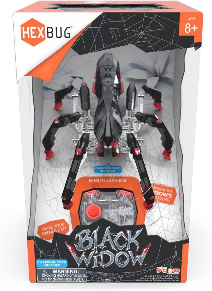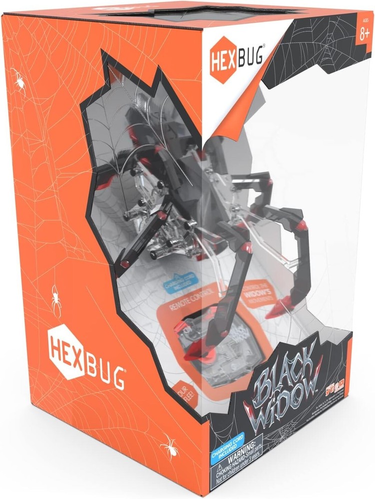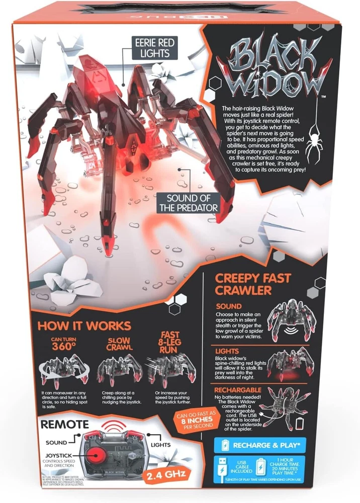 Description The HEXBUG Black Widow is the new eight-legged robotic creature that is an electromechanical marvel. The Black Widow features a large motor for even faster crawling, 360-degree steering, a glowing LED eye, and two-channel user selectable infrared remote control. The IR remote has rechargeable batteries and enables the user to operate multiple bugs independently or at the same time (each sold separately). As the largest member of the HEXBUG mechanical family, the complexity of its internal mechanisms and eight-legged crawling motion is simply fascinating to both operate and watch. Hexbug creatures are the perfect toys for boys age 8-12 who love to build and play with robots! These boys toys are great to get started on stem projects for kids ages 8-12 and curate a love for building toys and encourage creativity! The Hex Bugs Creatures kid toys are great learning & education toys and gifts for kids. Robot toys are a fantastic addition to your collection of cool stuff, and great STEM Toys for girls and boys to encourage creativity and passion for building! Comes with 2 Rechargeable Batteries, a USB cable charger and is recommended for kids ages 8 & up! REMOTE CONTROL SPIDER: Bring the largest and scariest arthropod to life with this robotic black widow remote-controlled spider! Hexbug creatures are the perfect toys for boys age 8-12 who love to build and play with robots! REALISTIC SPIDER TOY: These robotic crawling toys come with a glowing body, LED-powered eyes, and makes creepy spider noises as it crawls around on 8 legs! ERGONOMIC DRIVE CONTROL: The IR remote on this robot toy allows you to control multiple spiders simultaneously or independently, with a large motor for faster crawling and 360-degree steering! RECHARGEABLE BATTERIES INCLUDED: 2 Rechargeable Lithium batteries and 1 USB Cable included so you can have endless fun with these Hex Bugs crawling toys! ROBOTIC KIDS TOYS & GAMES: Robot toys are a fantastic addition to your collection of cool stuff, and great STEM Toys for boys and girls to encourage creativity and passion for building!