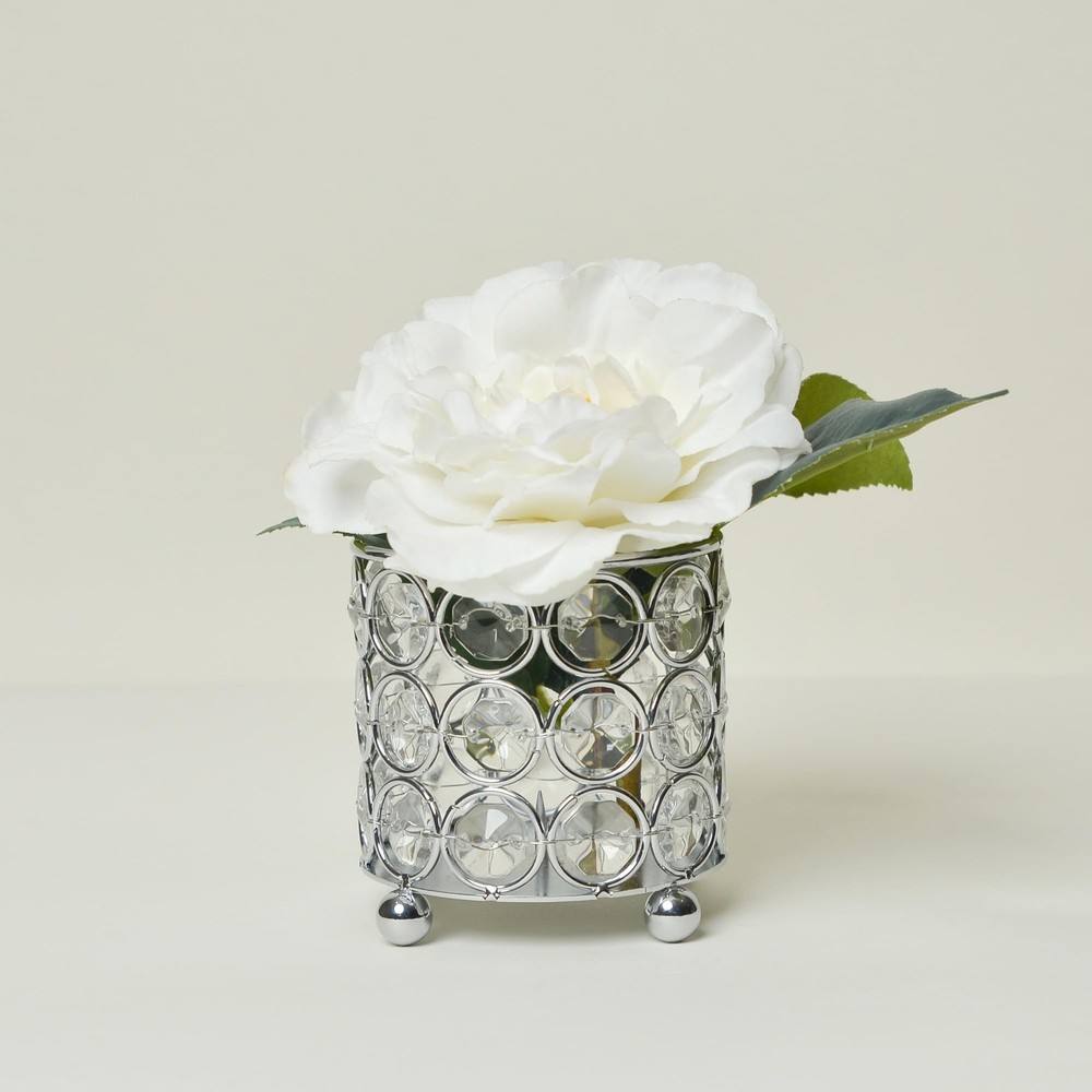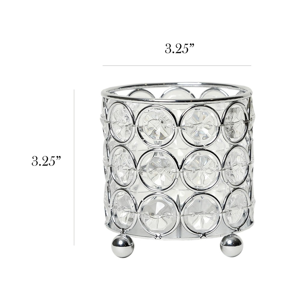 For those of you looking to vamp up your personal space, or those that are in search to add some razzle-dazzle to a special event, this 3.25 inch candle holder is exactly what you've been looking for! The cylinder design is built on a flawless chrome base elevated on 3 small pellets with sparkling K5 crystals throughout. You can utilize this piece not only as a candle holder, but organize your make-up, brushes, pens, and supplies of choice as well. When using as a candle holder, we recommend that you use battery operated candles, tea lights, or votive candle with height of 3 inches or smaller for the right fit. We do not recommend use of real fire/flame candles as it will cause metal to get very hot. CONTEMPORARY DESIGN: Embellished with sparkling K5 crystals throughout and a beautiful chrome finish. VERSATILE: Perfect for indoor home décor and/or storage of beauty products, office supplies OR for special event decorations such as wedding centerpieces, dessert table accents, etc. INCLUDED REMOVABLE CUP: This item includes a small, removable cup suited to hold tea lights. PERFECT FOR BATTERY OPERATED CANDLES: Use of flammable candles is not recommended. Battery operated candles are highly suggested (not included in your purchase). PLEASE NOTE: Fresh flower inserts are NOT included and product CANNOT be filled with water. PRODUCT SIZING: This item measures Dia: 3.25" x H: 3.25".