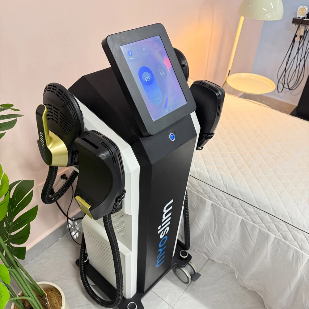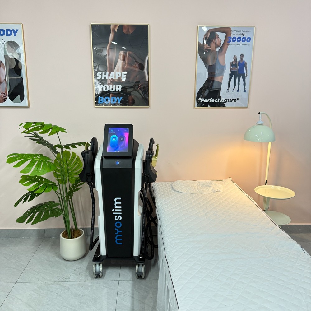 Fat Breakdown In less than 4 minutes the temperature in fat reaches levels that cause their permanent damage. Muscle Warm-Up The muscle temperature raises by several degrees, similarto what a warm-up activity does beforeany workout. Supramaximal Contraction Muscles in the treated area are contracted at intensities that are not achievable during routine exercise. After Treatment The fat cells are slowly removed from the body and the strained muscle fibers initiate a growth process. This results in fat elimination and muscle building. high-intensity focused electromagnetic field energy technology The high-frequency alternating magnetic field gener- ates an induced current in the muscle tissue, depolar- izes the nerve membrane, and excites the motor unit ofthe target muscle The instrument has four treatment heads that can be placed separately on the abdomen or buttocks( both) to help you move your muscles. By using HI-EMT( high energy focused electromagnetic wave) technology to expand and contract muscles, limit train- ing, and deep remodeling of muscle internal structure, That is, the growth of myofibrils (muscle enlargement) and the production of new protein chains and muscle fibers (muscle hyperplasia)to train and increase muscle density and volume How it works: Select target muscle group Adjust the intensity level according to your comfort level Choose the appropriate handle to adjust the quantity of individual energy Experience the benefits of improving muscle tone and firming the skin