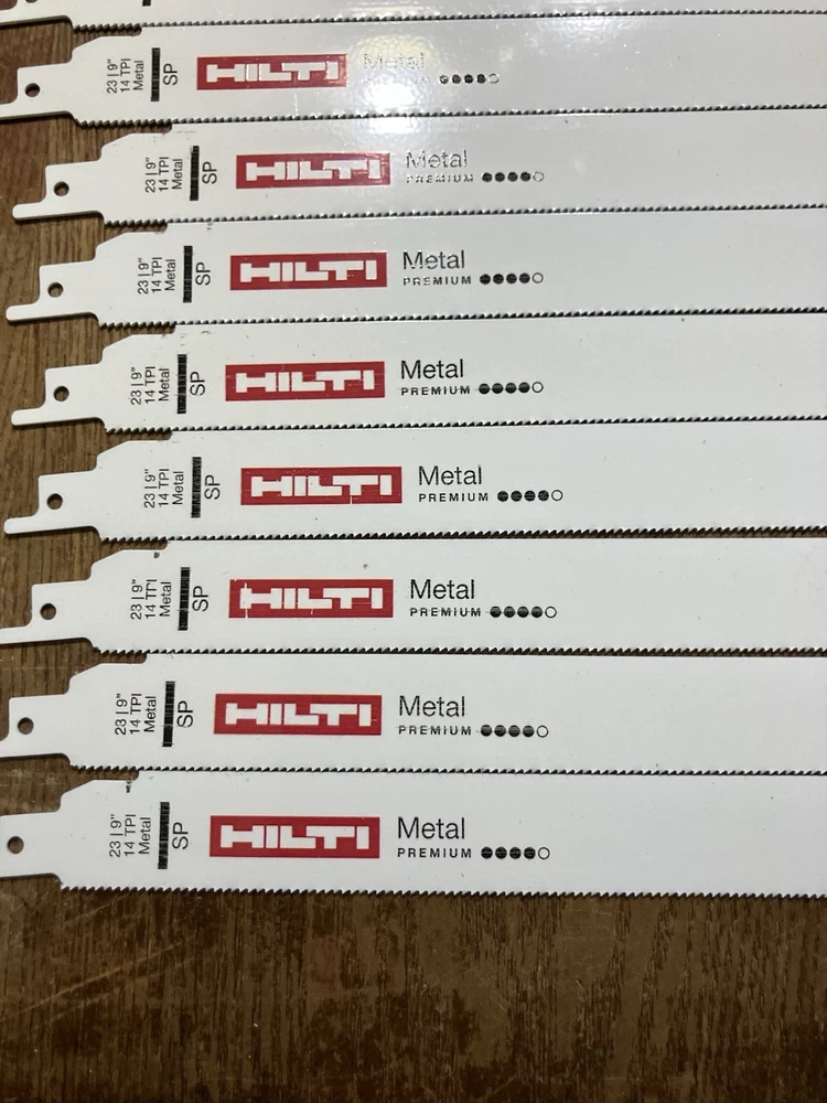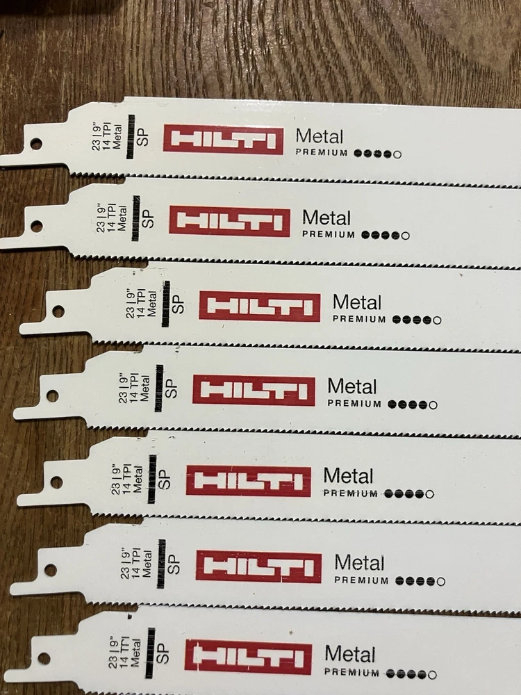 Get serious about metal cutting with this 50-pack of HILTI 9” 14 TPI premium reciprocating saw blades . Built for speed, strength, and precision, these blades are engineered to slice through tough metals with ease. Whether you’re a contractor, fabricator, or metalworker, this bulk pack gives you the quality and quantity to power through the job. Product Details: Brand: HILTI Blade Length: 9 inches TPI (Teeth Per Inch): 14 Quantity: 50 blades Cutting Type: Premium Metal Cutting Material Compatibility: Ideal for steel, aluminum, conduit, sheet metal, pipe, and more Condition: Brand new Compatibility: Universal shank fits most reciprocating saws (Sawzall, etc.) Key Features: Precision 14 TPI design for smoother, finer cuts Optimized for thin to medium-gauge metals High-quality steel with heat-treated teeth for long blade life Aggressive performance with reduced vibration Bulk value pack—ideal for job sites and high-volume use ✅ Why Choose HILTI? Trusted by pros for industrial-grade durability 🔧 Cuts faster and lasts longer than generic blades ⚡ Universal fit – works with all major saw brands 🧰 Ships fast and packaged securely 📦 🛒 Ready to Cut Through the Tough Stuff? Buy Now! This 50-pack of HILTI 9” metal-cutting blades is built for those who don’t settle for less. 💥 Upgrade your toolbox today – stock up now and cut with confidence before they’re gone!