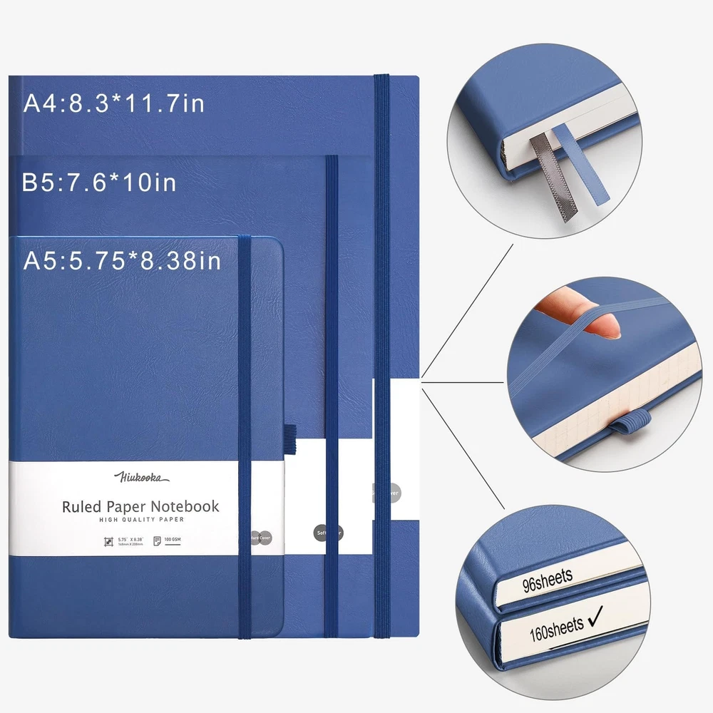 HIUKOOKA College Ruled Notebook, 320 Pages A5 Hardcover Large Journal, Thick Paper, Writing Journal for Office School Business, 5.75'' x 8.38'' - Blue A5 JOURNAL: A large A5 size Lined Notebook (8.3'' × 11.7'') and 1 gift(divider sticky notes), with 160 sheets/320 pages. And in a variety of colors to meet your application on various occasions. PREMIUM THICK PAPER: Hiukooka Ruled Journal adopts 100GSM quality paper with smooth touch, thicker than 30%, avoids ink bleeding through, ghosting, or discoloration, and is suitable for most pens. HUMANIZED DESIGN: Sturdy and water-resistant leather Hard cover, will protect your journals for years, and is easy to lay out flat for comfortable writing and reading. FEATURES: A5 Lined journal has 1 elastic band, 2 bookmarks,1 back expendable pocket, 1 sticky note, and humanized rounded corner design. GREAT USE: Ideal as business meeting minutes, laboratory journals, composition books, personal writing journals, travel journals, diary planners, college/school course notebooks, and executive notebooks Perfect for the office, business, school, college, and home. Shipping We offer FREE shipping on all orders! We use a selection of shipping services such as UPS, FedEx, USPS etc. We only ship to the lower 48 states, no APO/FPO addresses or PO Boxes allowed. Local pickups and combined shipping options are not provided at this time. Return You can return a product for up to 30 days from the date you purchased it. Any product you return must be in the same condition you received it and in the original packaging. Please keep the receipt. Payment We accept payment by any of the following methods: PayPal Please pay as soon as possible after winning an auction, as that will allow us to post your item to you sooner! Feedback Customer satisfaction is very important to us. If you have any problem with your order, please contact us and we will do our best to make you satisfied. Contact Us If you have any queries, please contact us via ebay. We usually respond within 24 hours on weekdays. Please visit our eBay store to check out other items for sale! Thank you for shopping at our store.