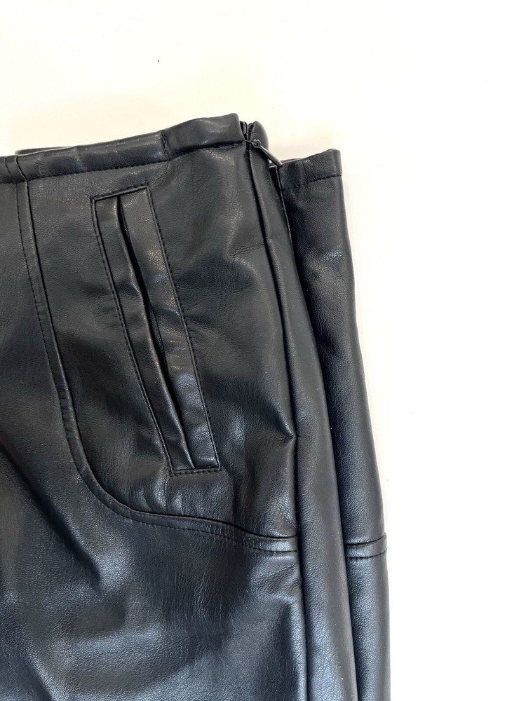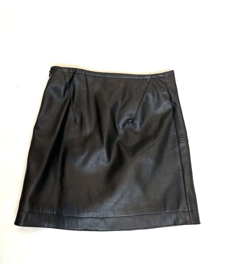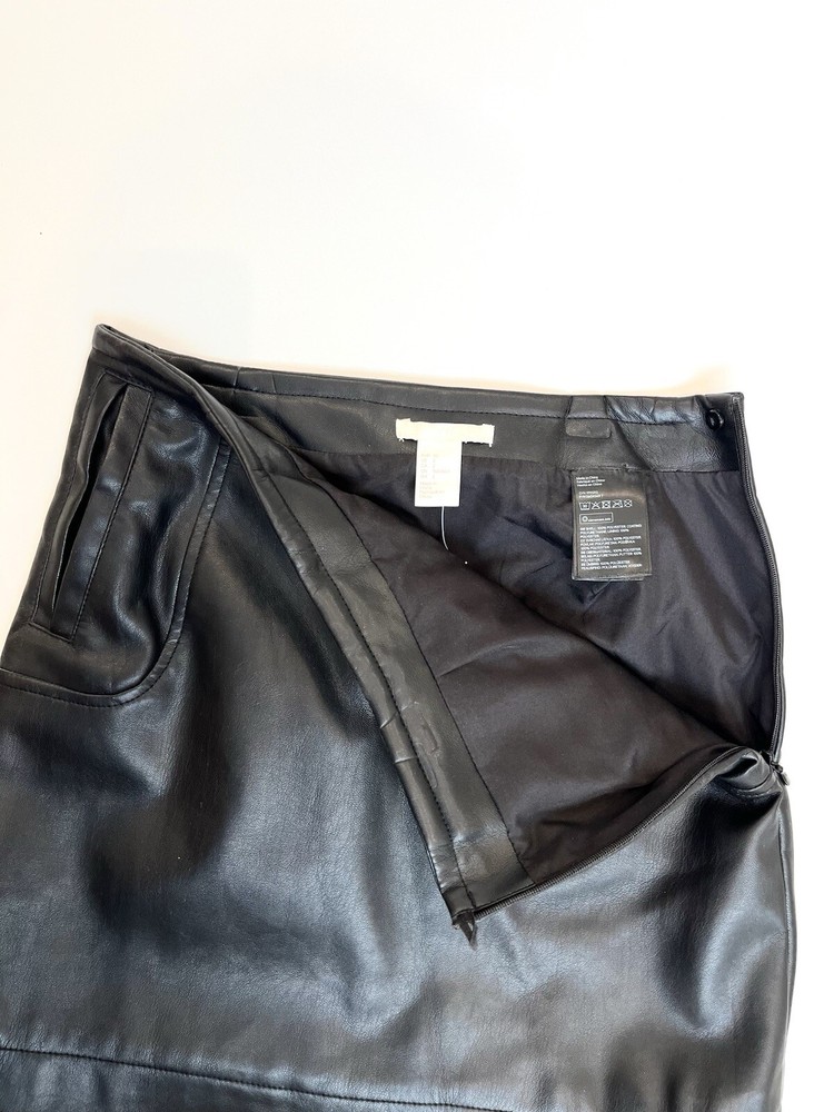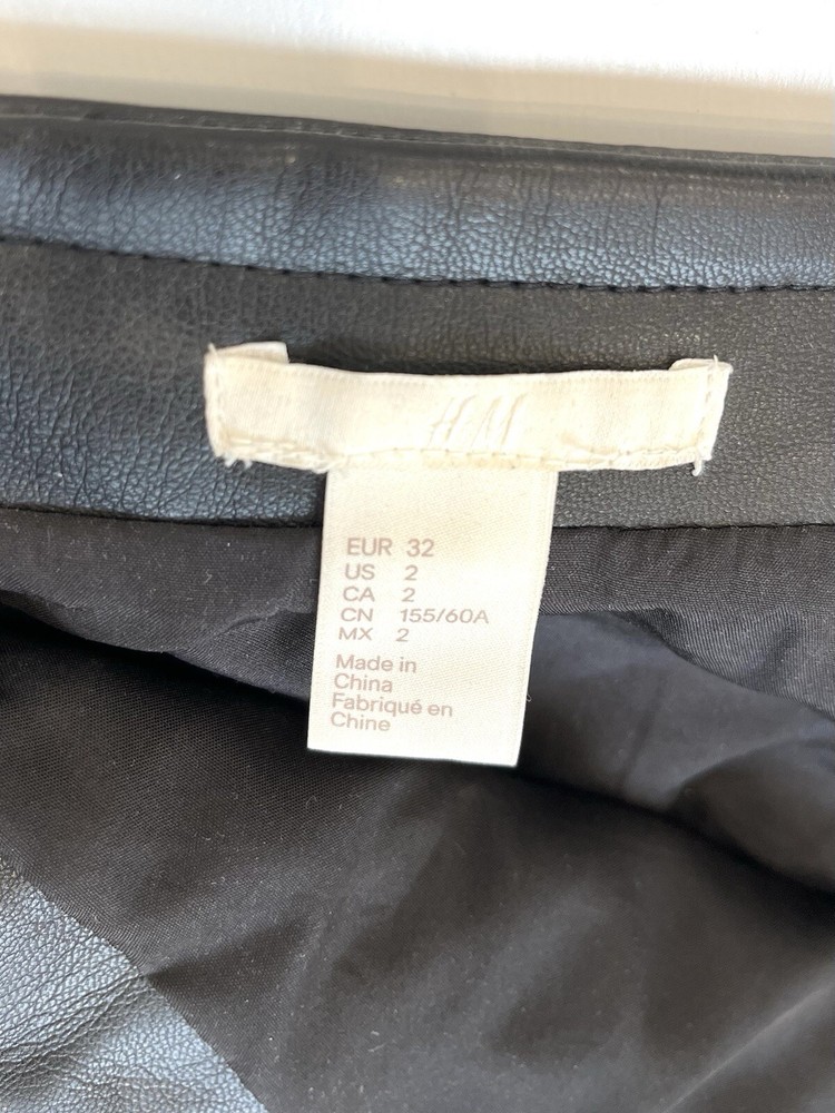 This is an H&M black faux leather mini skirt in size 2. It features a solid pattern with zipper accents and pockets, making it suitable for travel, parties, or casual wear. This stylish skirt is designed for women and has a short length, perfect for creating trendy outfits.